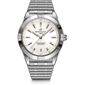 Spotlight auf die Chronomat Uhrenlinie: Der Breitling Chronomat 36 mit Automatikwerk. Dieses Modell mit Edelstahlgehäuse erscheint mit einem speziell lackierten Zifferblatt in weiß. Der Chronomat verkörpert Flair, Selbstbewusstsein und einen aktiven Lebensstil. Der Zeitmesser hat seine Wurzeln in den 1980er-Jahren. Die moderne Uhr mit Retro-Touch begleitet sportlich und doch elegant ihre Trägerin sowohl zum Geschäftsmeeting als auch zum Strand - und wohin der Weg sie sonst noch führt. Wie alle Breitling Uhren sind auch die Chronomat Modelle COSC-zertifizierte Chronometer. Schwimmer, Surfer, Taucher und sogar Badewannennixen werden zu schätzen wissen, dass die Modelle bis 100 Meter wasserdicht sind. Ausgestattet mit dem legendären Rouleaux-Armband mit Doppelfaltschließe. Angetrieben wird der Chronomat Automatic 36 von einem Breitling-Kaliber 10 mit einer Gangreserve von ca. 42 Stunden.
