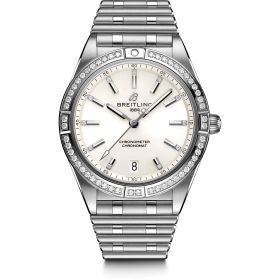Spotlight auf die Chronomat Uhrenlinie: Der Breitling Chronomat 36 mit Automatikwerk. Dieses Modell mit Edelstahlgehäuse und Diamanten erscheint mit einem speziell lackierten Zifferblatt in weiß. Der Chronomat verkörpert Flair, Selbstbewusstsein und einen aktiven Lebensstil. Der Zeitmesser hat seine Wurzeln in den 1980er-Jahren. Die moderne Uhr mit Retro-Touch begleitet sportlich und doch elegant ihre Trägerin sowohl zum Geschäftsmeeting als auch zum Strand - und wohin der Weg sie sonst noch führt. Wie alle Breitling Uhren sind auch die Chronomat Modelle COSC-zertifizierte Chronometer. Schwimmer, Surfer, Taucher und sogar Badewannennixen werden zu schätzen wissen, dass die Modelle bis 100 Meter wasserdicht sind. Ausgestattet mit dem legendären Rouleaux-Armband mit Doppelfaltschließe. Angetrieben wird der Chronomat Automatic 36 von einem Breitling-Kaliber 10 mit einer Gangreserve von ca. 42 Stunden.
