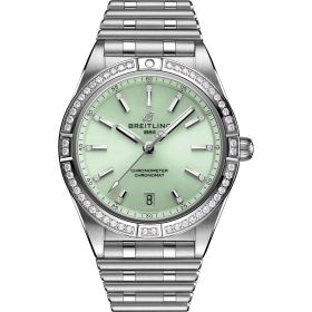 Spotlight auf die Chronomat Uhrenlinie: Der Breitling Chronomat 36 mit Automatikwerk. Dieses Modell mit Edelstahlgehäuse und Diamanten erscheint mit einem speziell lackierten Zifferblatt in grün. Der Chronomat verkörpert Flair, Selbstbewusstsein und einen aktiven Lebensstil. Der Zeitmesser hat seine Wurzeln in den 1980er-Jahren. Die moderne Uhr mit Retro-Touch begleitet sportlich und doch elegant ihre Trägerin sowohl zum Geschäftsmeeting als auch zum Strand - und wohin der Weg sie sonst noch führt. Wie alle Breitling Uhren sind auch die Chronomat Modelle COSC-zertifizierte Chronometer. Schwimmer, Surfer, Taucher und sogar Badewannennixen werden zu schätzen wissen, dass die Modelle bis 100 Meter wasserdicht sind. Ausgestattet mit dem legendären Rouleaux-Armband mit Doppelfaltschließe. Angetrieben wird der Chronomat Automatic 36 von einem Breitling-Kaliber 10 mit einer Gangreserve von ca. 42 Stunden.