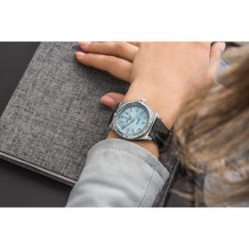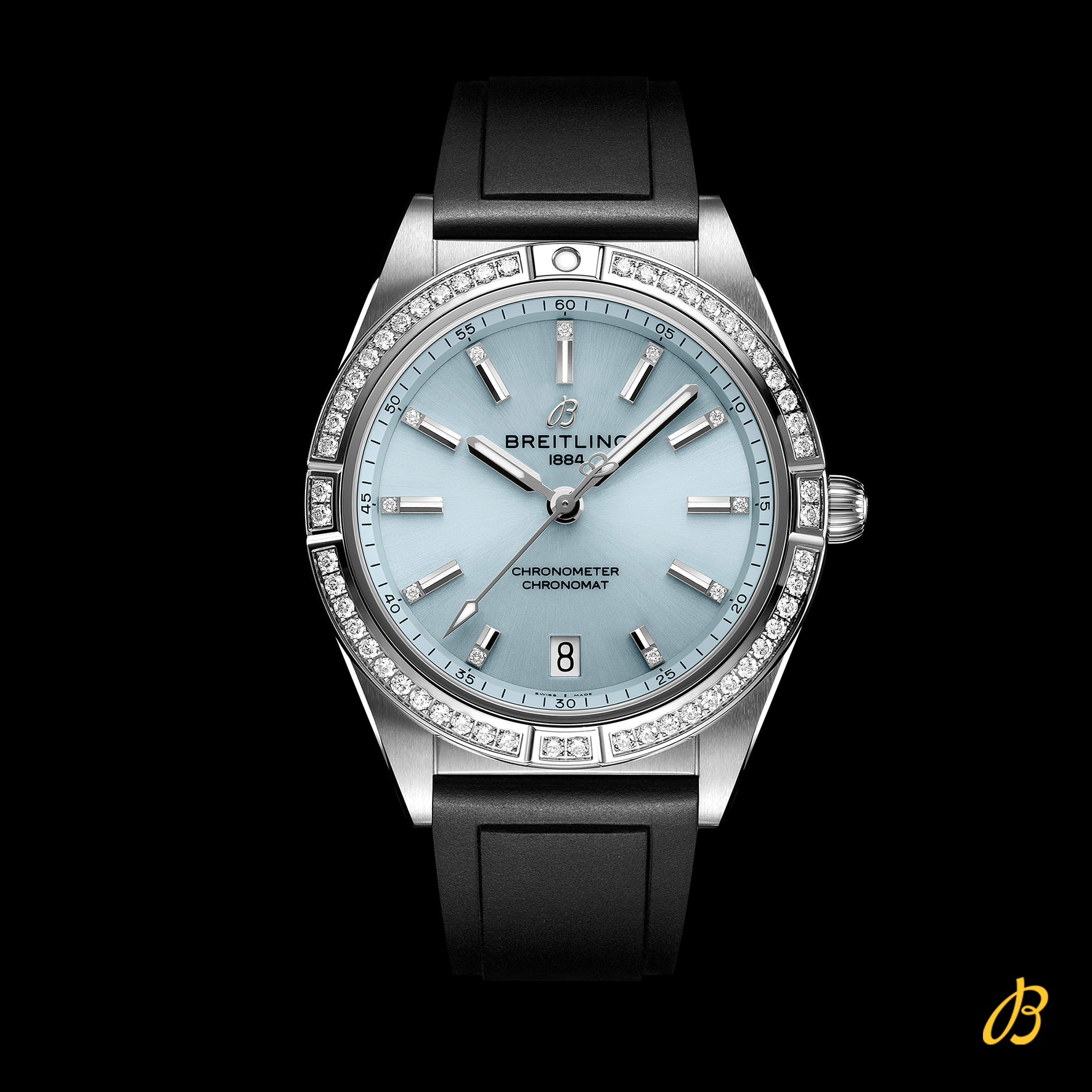 Die Breitling Chronomat 36 mit "Ice Blue"-Zifferblatt, präsentiert am schwarzen Kautschukarmband mit Faltschließe. Die Lünette des 36 mm-Gehäuses sowie die Indizes sind mit Diamanten besetzt. Stylish und doch elegant – die Chronomat Automatic 36 mit modernem Retro-Touch ist eine vielseitige, sportlich-schicke Uhr für jeden Anlass. Diese Chronomat Automatic 36 besitzt ein Edelstahlgehäuse, eine Lünette aus 18-karätigem Graugold mit Edelsteinbesatz und ein eisblaues Zifferblatt. Das Modell ist ausschliesslich mit Kautschukarmband erhältlich; angetrieben wird es vom Breitling-Manufakturkaliber 10, einem COSC-zertifizierten Chronometer.