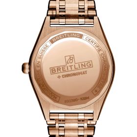 Spotlight auf die Chronomat Uhrenlinie: Der Breitling Chronomat 36 mit Automatikwerk. Dieses Modell mit Rotgoldgehäuse erscheint mit einem speziell lackierten Zifferblatt in weiß. Der Chronomat in der Damenversion verkörpert Flair, Selbstbewusstsein und einen aktiven Lebensstil. Der Zeitmesser hat seine Wurzeln in den 1980er-Jahren. Die moderne Uhr mit Retro-Touch begleitet sportlich und doch elegant ihre Trägerin sowohl zum Geschäftsmeeting als auch zum Strand - und wohin der Weg sie sonst noch führt. Wie alle Breitling Uhren sind auch die Chronomat Modelle COSC-zertifizierte Chronometer. Schwimmer, Surfer, Taucher und sogar Badewannennixen werden zu schätzen wissen, dass die Modelle bis 100 Meter wasserdicht sind. Ausgestattet mit dem legendären Rouleaux-Armband mit Doppelfaltschließe. Angetrieben wird der Chronomat Automatic 36 von einem Breitling-Kaliber 10 mit einer Gangreserve von ca. 42 Stunden.