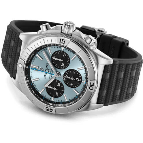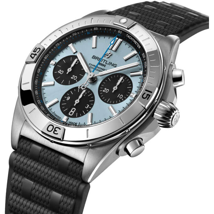 Eine Breitling-Uhr für jede Situation und jede Aktivität. Die Chronomat nimmt in der Geschichte von Breitling einen wichtigen Platz ein. Sie wurde 1984 lanciert, zu einer Zeit, als besonders flache Quarzuhren in Mode waren. Breitling setzte mutig auf eine mechanische Uhr mit beeindruckenden Proportionen. Die Chronomat basiert auf dem Chronometer Frecce Tricolori, der in Zusammenarbeit mit der berühmten italienischen Fliegerstaffel entwickelt und 1983 lanciert wurde. Mit diesem Modell feierte Breitling stilvoll sein hundertjähriges Bestehen. Sie bedeutete die Rückkehr des mechanischen Chronometers zu seiner rechtmässigen Vorrangstellung innerhalb der Marke, die ihren Weltruf auf diese aussergewöhnlichen Uhren gründete. Die Chronomat ist in verschiedenen Materialien erhältlich, von Edelstahl bis zu luxuriösem 18-karätigem Rotgold. Das Modell verfügt über ein 42-mm-Gehäuse und die legendäre Lünette mit den vier Reitern. Die Chronomat ist mit verschiedenen farbigen Zifferblättern erhältlich, die auf das charakteristische Rouleaux-Armband aus Metall oder Kautschuk abgestimmt sind. Angetrieben wird das Modell vom Breitling Manufakturkaliber 01, einem COSC-zertifizierten Chronometer.- Durchmesser
