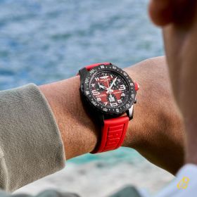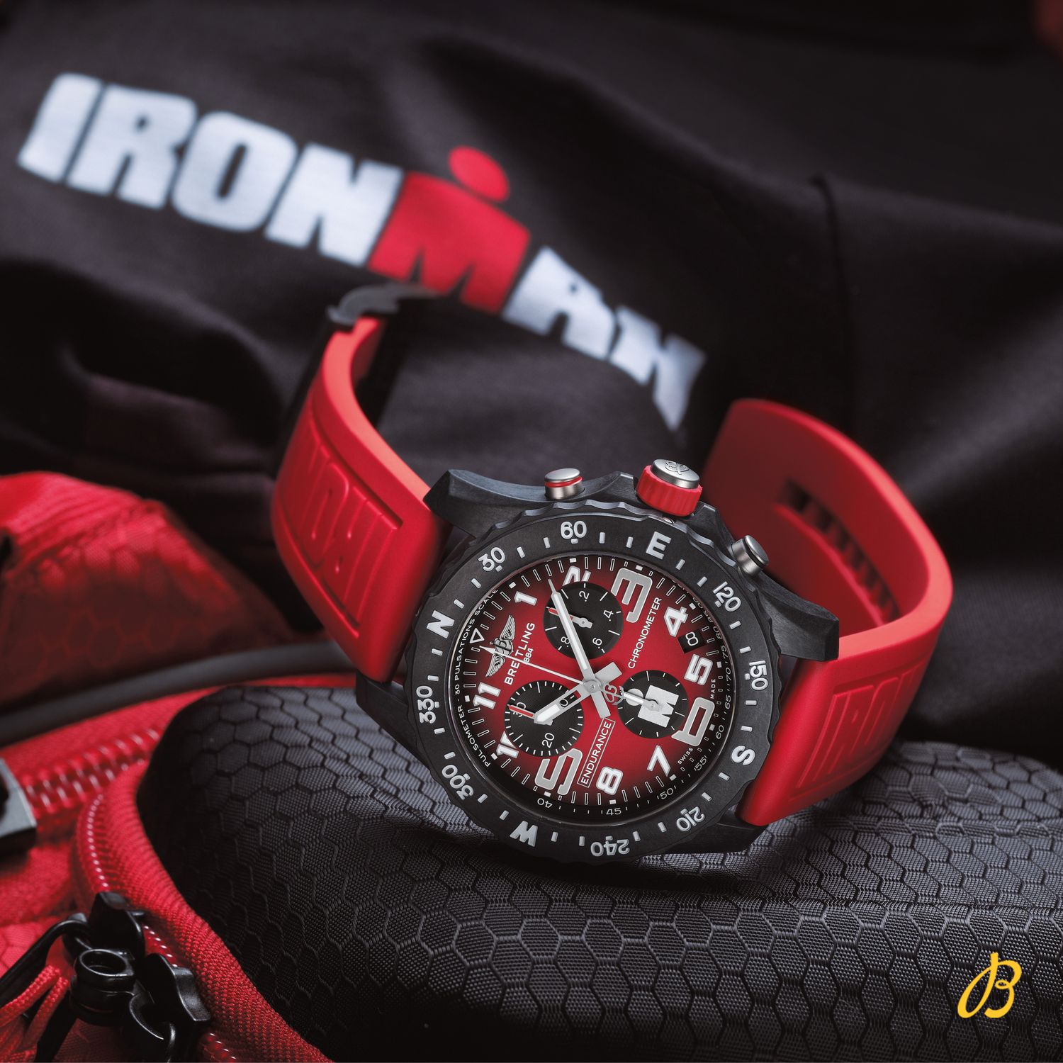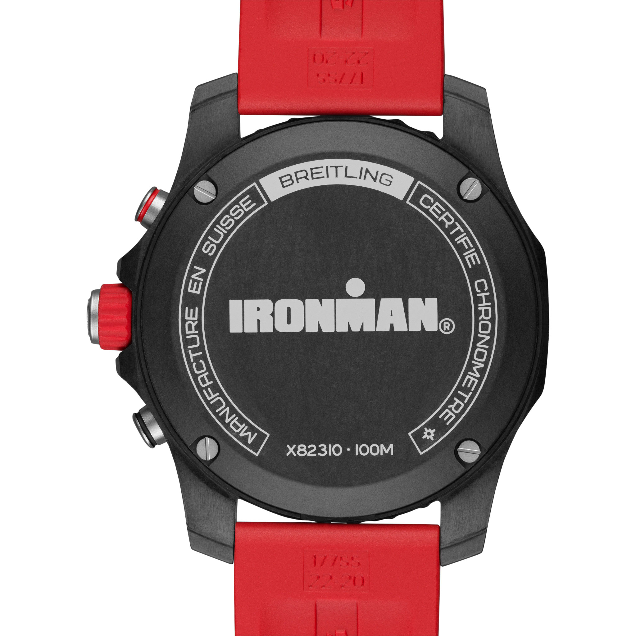 Ironman und Breitling bündeln Kräfte und lancieren die Endurance Pro Ironman. Als neue offizielle Luxusuhr von Ironman zelebriert Breitling die Kraft und Ausdauer hinter diesen unvergleichlichen Sportevents. Endurance Pro Ironman® - 44 mm Gehäuse aus Breitlight. Rotes Zifferblatt und rotes Kautschukarmband mit Doppeldornschließe aus Breitlight. Rückseite mit Ironman®-Gravur. Das 44-mm-Uhrengehäuse besteht aus Breitlight®, einem Material, das 3,3-mal leichter als Titan und 5,8 mal leichter als Stahl, gleichzeitig aber deutlich härter ist. Dieses exklusive Hightech-Material ist extrem kratz- und zugfest und weist eine sehr hohe Korrosionsbeständigkeit auf. Darüber hinaus zeichnet es sich durch seine antimagnetischen und antiallergischen Eigenschaften sowie seine Wärmebeständigkeit aus, dank der es sich wärmer anfühlt als Metall. Angetrieben wird die Uhr vom Breitling-Kaliber 82, einem COSC-zertifizierten thermokompensierten SuperQuartz™-Werk, das zehnmal präziser ist als ein normales Quarzuhrwerk und dessen Batterie eine Lebensdauer von etwa drei bis vier Jahren hat. In die bidirektionale Drehlünette sind Symbole für die Himmelsrichtungen eingraviert; die haptisch gestaltete Krone gewährleistet exzellente Griffigkeit und Handhabung. Die Stunden und Minutenzeiger sind mit Super-LumiNova® behandelt und garantieren beste Ablesbarkeit auch bei nicht idealen Lichtverhältnissen. Zusätzlich zum kleinen Sekundenzeiger gibt es einen Zehntelsekunden- und einen 30 Minuten-Chronographenzähler – und auch bei diesen wurde auf gute Ablesbarkeit geachtet. Die Uhr ist wasserdicht bis 10 Bar (100 Meter).