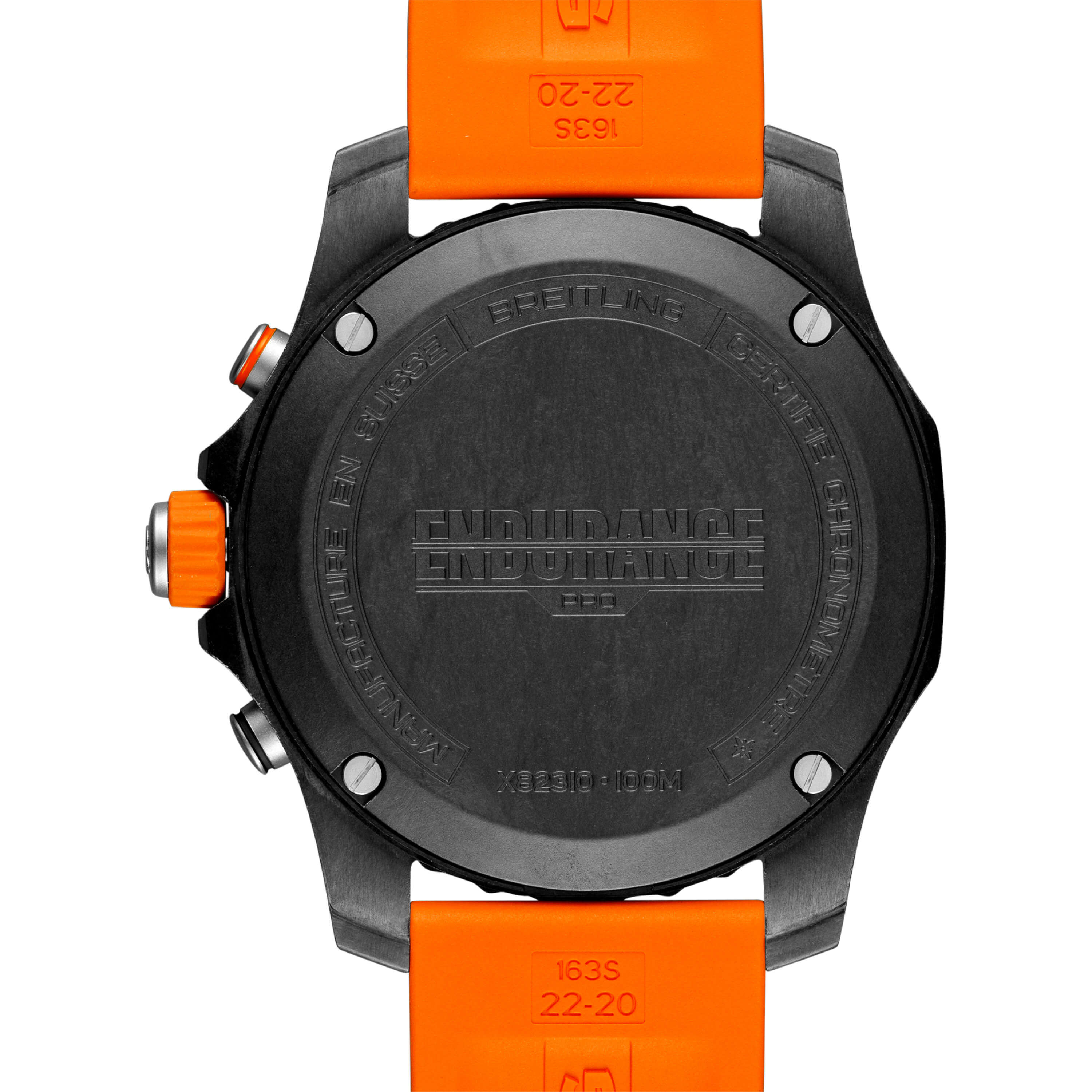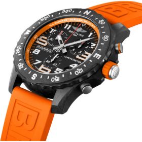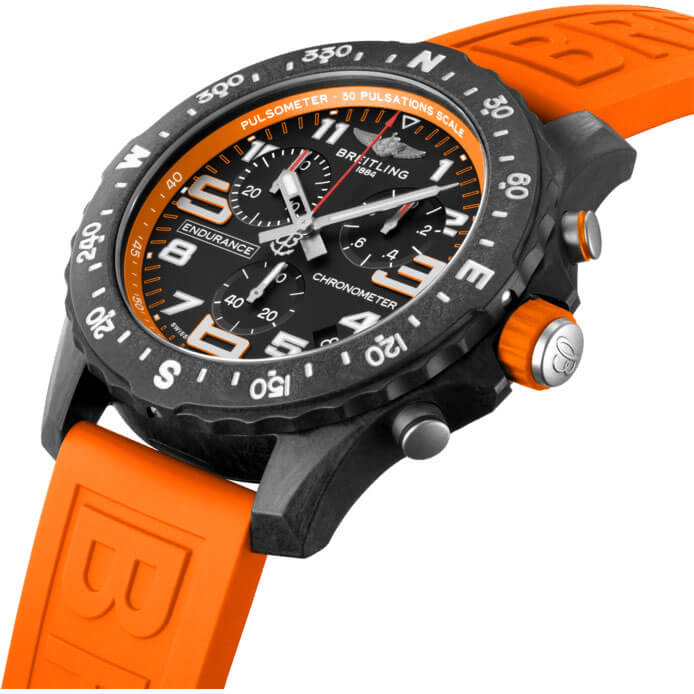 Professional Endurance Pro mit 44 mm Breitlight-Gehäuse und orangenem Kautschukarmband. Schwarzes Zifferblatt mit farbigem Pulsometer Ring. Kautschukarmband Diver Pro III mit Doppeldornschließe aus Breitlight. Die Endurance Pro ist sowohl als federleichte Wettkampfuhr wie auch als lässiger Sportchronograph für jeden Tag konzipiert. Sie repräsentiert die perfekte Verschmelzung von höchster Präzision, innovativer Technologie und frischem, farbenfrohem Design. Sie ist die ultimative Athleisure-Uhr. Entworfen für Frauen und Männer, in deren aktivem Leben sich Professionalität und Sportlichkeit die Waage halten, ist die Endurance Pro den Herausforderungen eines anstrengenden Work-outs ebenso gewachsen wie den Ansprüchen an den Alltagschic. Die Endurance Pro verfügt über ein ultraleichtes Gehäuse aus Breitlight®. Dieser widerstandsfähige Werkstoff ist 3,3-mal leichter als Titanium und 5,8-mal leichter als Edelstahl. Das antimagnetische, thermisch stabile und hypoallergene Breitlight® ist hochgradig kratz-, zug- und korrosionsfest. Die haptische Wirkung ist wärmer als die von Metall, und der leichte Textureffekt unterstreicht den Einfallsreichtum des Designs. Breitlight® ist zu 100 % Swiss-made und nur bei Breitling erhältlich. Die Endurance Pro wird in einer Auswahl bunter Zifferblätter und Kautschukarmbändern für die Breitlight® Doppeldornschliesse angeboten und kann auch mit einem der farbenfrohen Breitling NATO-Armbänder aus ECONYL®-Garn von OuterkProfessional Endurance Pro mit 44 mm Breitlight-Gehäuse und orangem Kautschukarmband. Schwarzes Zifferblatt mit farbigem Pulsometer Ring. Kautschukarmband Diver Pro III mit Doppeldornschließe aus Breitlight. Die Endurance Pro ist sowohl als federleichte Wettkampfuhr wie auch als lässiger Sportchronograph für jeden Tag konzipiert. Sie repräsentiert die perfekte Verschmelzung von höchster Präzision, innovativer Technologie und frischem, farbenfrohem Design. Sie ist die ultimative Athleisure-Uhr. Entworfen für Frauen und Männer, in deren aktivem Leben sich Professionalität und Sportlichkeit die Waage halten, ist die Endurance Pro den Herausforderungen eines anstrengenden Work-outs ebenso gewachsen wie den Ansprüchen an den Alltagschic. Die Endurance Pro verfügt über ein ultraleichtes Gehäuse aus Breitlight®. Dieser widerstandsfähige Werkstoff ist 3,3-mal leichter als Titanium und 5,8-mal leichter als Edelstahl. Das antimagnetische, thermisch stabile und hypoallergene Breitlight® ist hochgradig kratz-, zug- und korrosionsfest. Die haptische Wirkung ist wärmer als die von Metall, und der leichte Textureffekt unterstreicht den Einfallsreichtum des Designs. Breitlight® ist zu 100 % Swiss-made und nur bei Breitling erhältlich. Die Endurance Pro wird in einer Auswahl bunter Zifferblätter und Kautschukarmbändern für die Breitlight® Doppeldornschliesse angeboten und kann auch mit einem der farbenfrohen Breitling NATO-Armbänder aus ECONYL®-Garn von Outerknown kombiniert werden. Herzstück der Endurance Pro ist das Kaliber 82 von Breitling, ein COSC-zertifizierter SuperQuartz™ Chronograph, der ausserordentliche Ganggenauigkeit bietet.nown kombiniert werden. Herzstück der Endurance Pro ist das Kaliber 82 von Breitling, ein COSC-zertifizierter SuperQuartz™ Chronograph, der ausserordentliche Ganggenauigkeit bietet.