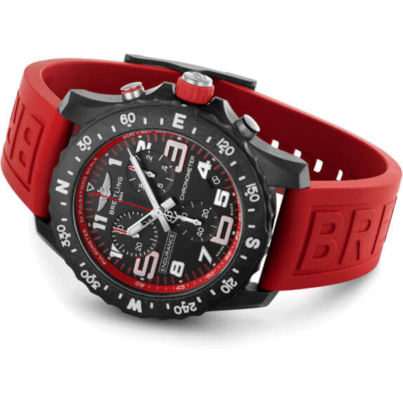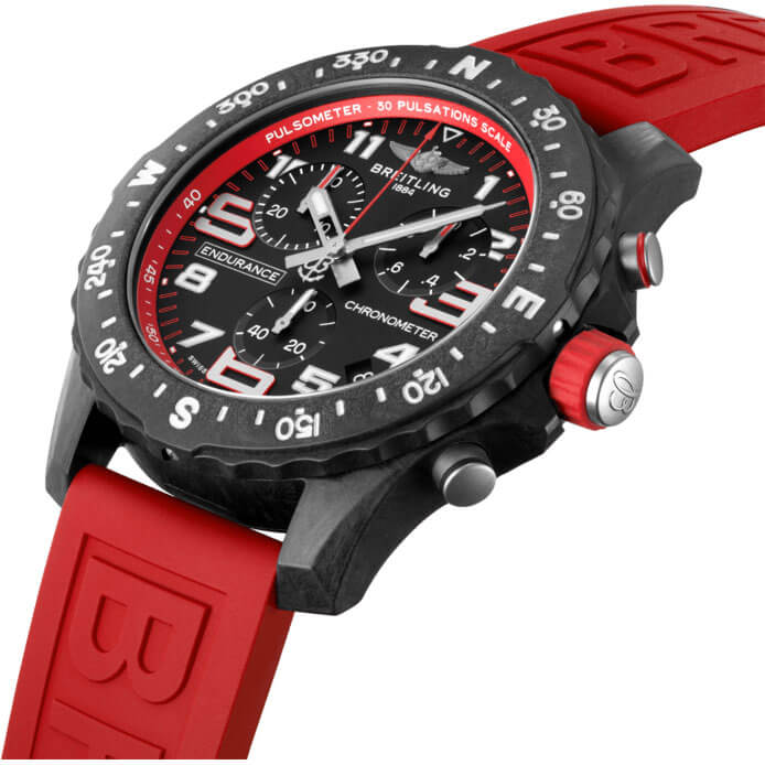 Professional Endurance Pro mit 44 mm Breitlight-Gehäuse und rotem Kautschukarmband. Schwarzes Zifferblatt mit farbigem Pulsometer Ring. Kautschukarmband Diver Pro III mit Doppeldornschließe aus Breitlight. Die Endurance Pro ist sowohl als federleichte Wettkampfuhr wie auch als lässiger Sportchronograph für jeden Tag konzipiert. Sie repräsentiert die perfekte Verschmelzung von höchster Präzision, innovativer Technologie und frischem, farbenfrohem Design. Sie ist die ultimative Athleisure-Uhr. Entworfen für Frauen und Männer, in deren aktivem Leben sich Professionalität und Sportlichkeit die Waage halten, ist die Endurance Pro den Herausforderungen eines anstrengenden Work-outs ebenso gewachsen wie den Ansprüchen an den Alltagschic. Die Endurance Pro verfügt über ein ultraleichtes Gehäuse aus Breitlight®. Dieser widerstandsfähige Werkstoff ist 3,3-mal leichter als Titanium und 5,8-mal leichter als Edelstahl. Das antimagnetische, thermisch stabile und hypoallergene Breitlight® ist hochgradig kratz-, zug- und korrosionsfest. Die haptische Wirkung ist wärmer als die von Metall, und der leichte Textureffekt unterstreicht den Einfallsreichtum des Designs. Breitlight® ist zu 100 % Swiss-made und nur bei Breitling erhältlich. Die Endurance Pro wird in einer Auswahl bunter Zifferblätter und Kautschukarmbändern für die Breitlight® Doppeldornschliesse angeboten und kann auch mit einem der farbenfrohen Breitling NATO-Armbänder aus ECONYL®-Garn von Outerknown kombiniert werden. Herzstück der Endurance Pro ist das Kaliber 82 von Breitling, ein COSC-zertifizierter SuperQuartz™ Chronograph, der ausserordentliche Ganggenauigkeit bietet.