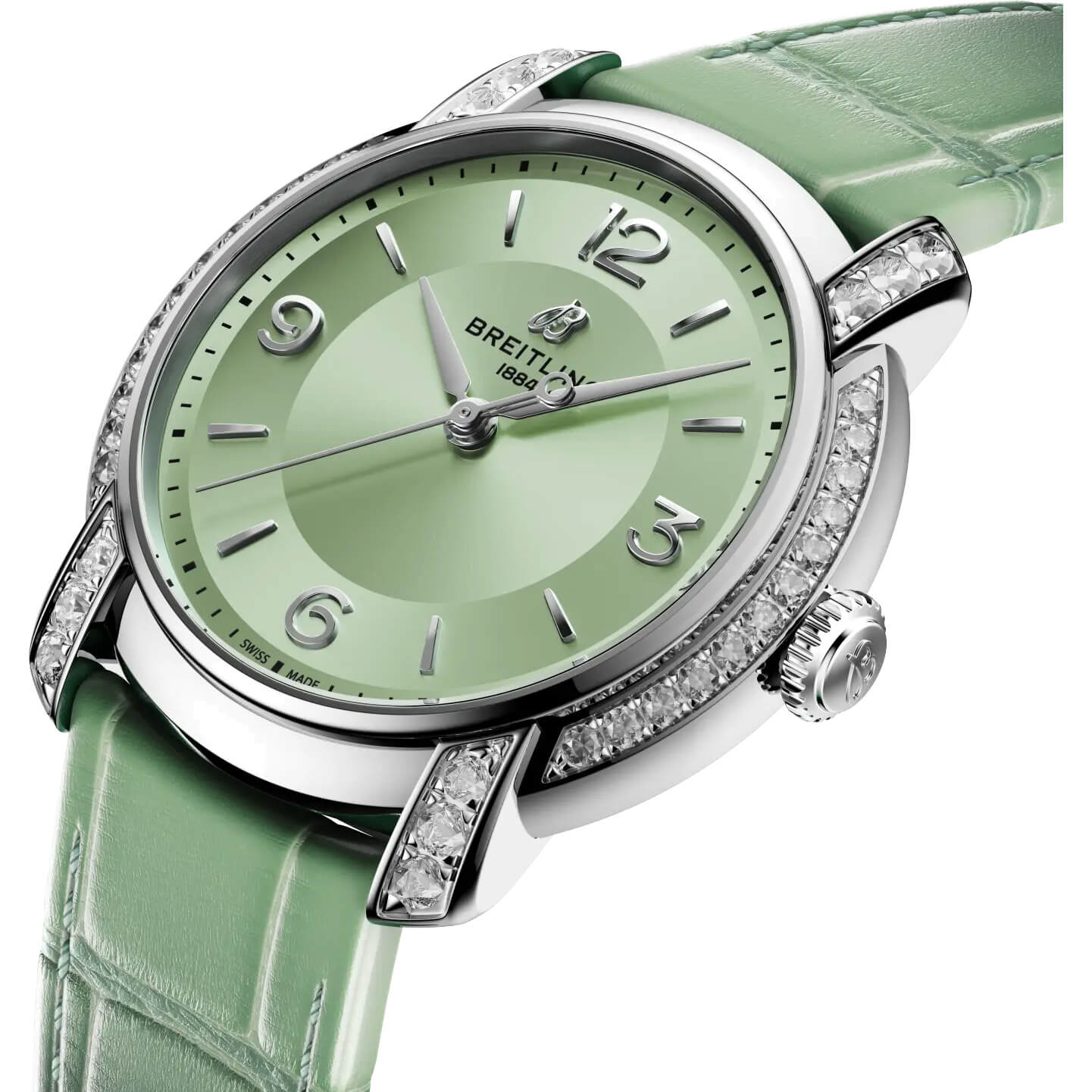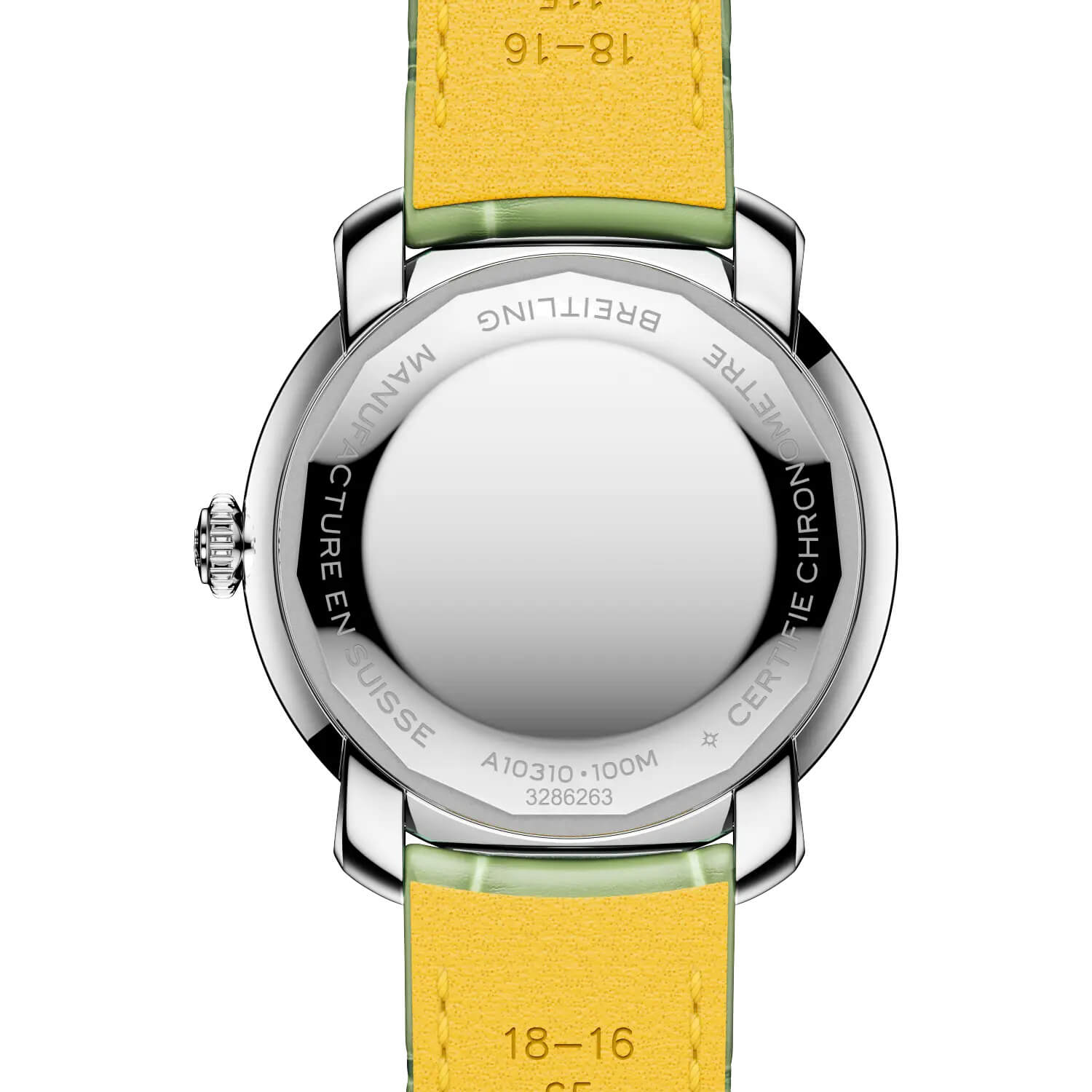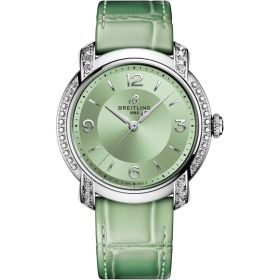 In den 1940er-Jahren führte Willy Breitling die Linie Premier ein und verwandelte den Chronographen vom reinen Präzisionsinstrument zu einem stilvollen Accessoire – elegant, mit hochwertigen Materialien und feinen Details, darunter einer der ersten speziell für Frauen entworfenen Chronographen. Seine Frau Beatrice wurde dabei nicht nur Muse, sondern prägte maßgeblich die kreative Ausrichtung der Marke. Mit der neuen Lady Premier bringt Breitling diese zeitlose Eleganz in die Gegenwart: Skulpturale Silhouetten, leuchtende Farbtöne und funkelnde Diamanten prägen die verspielte, gleichzeitig gehobene Designsprache. Minimalistische Ziffern, Rautenzeiger und eine filigrane Krone verleihen der Uhr den Charakter eines Schmuckstücks. Die 36-mm-Automatikmodelle kombinieren edle Zifferblätter mit farblich abgestuften Alligatorlederarmbändern, angetrieben vom COSC-zertifizierten Automatikwerk Kaliber 10. Die Lady Premier ist die Uhr für Frauen, die Leichtigkeit, Selbstbewusstsein und Lebensfreude ausstrahlen.- Durchmesser