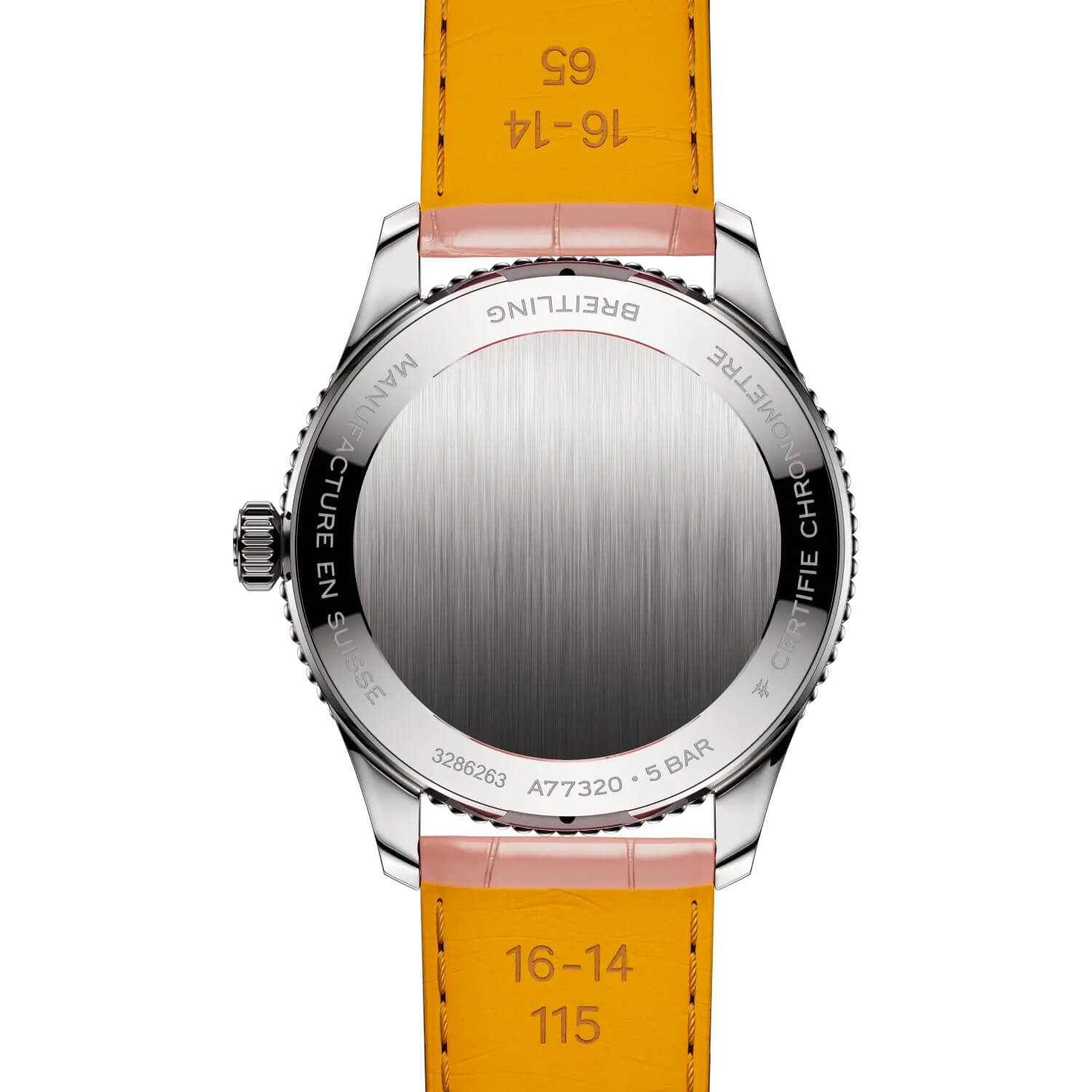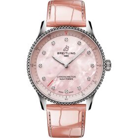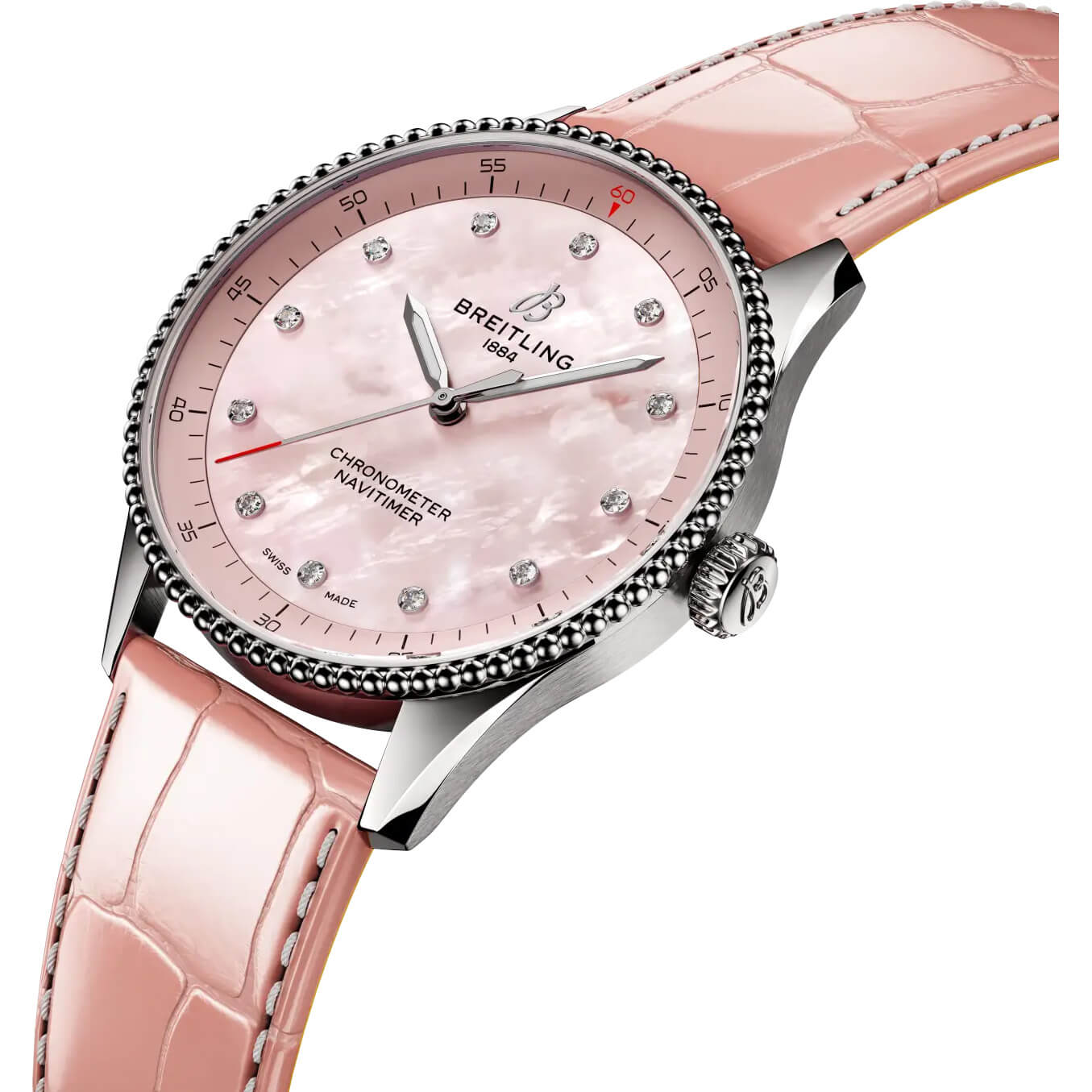 Die Navitimer 32 kombiniert raffiniert und elegant das historische Flair einer wahren Legende mit der Finesse eines modernen Zeitmessers. Die Uhr mit ihrem 32-mm Gehäuse aus Edelstahl verfügt über eine Perlenlünette, ein rosanes Perlmuttziffernblatt mit Diamantindizes und ein dazu passendes Lederarmband mit Dornschließe. Angetrieben wird sie vom Breitling-Kaliber 77, einem COSC-zertifizierten Chronometer.- Durchmesser