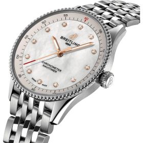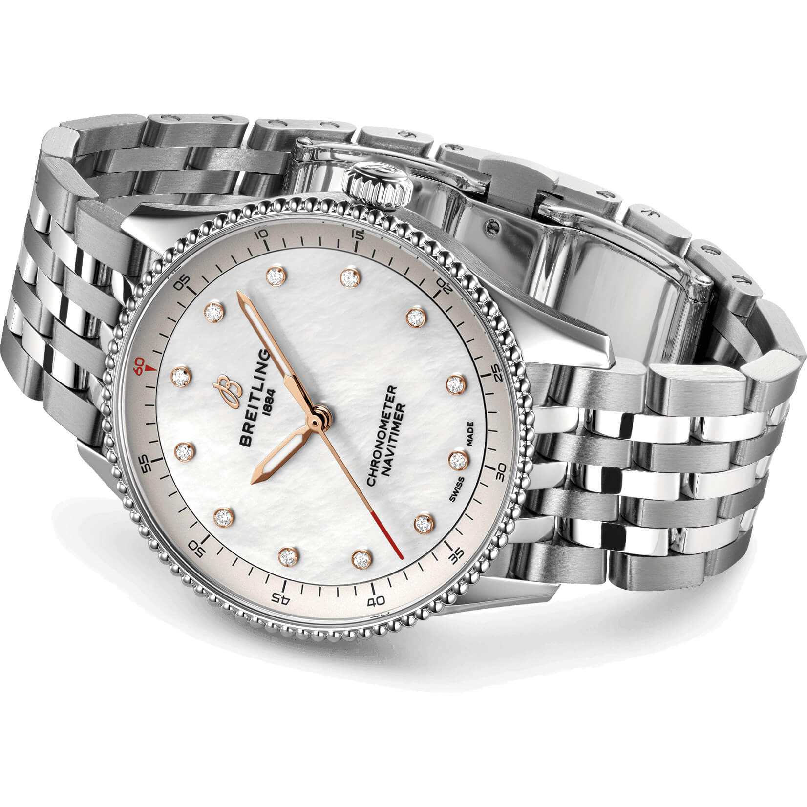 Die Navitimer 32 kombiniert raffiniert und elegant das historische Flair einer wahren Legende mit der Finesse eines modernen Zeitmessers. Die Uhr mit ihrem 32-mm-Gehäuse aus Edelstahl verfügt über eine Perlenlünette, ein Perlmuttziffernblatt mit Diamantindizes, sowie Zeigern aus Roségold und ein 7-reihiges Edelstahlarmband mit abwechselnd polierten und mattierten Elementen. Angetrieben wird sie vom Breitling-Kaliber 77, einem COSC-zertifizierten Chronometer.
