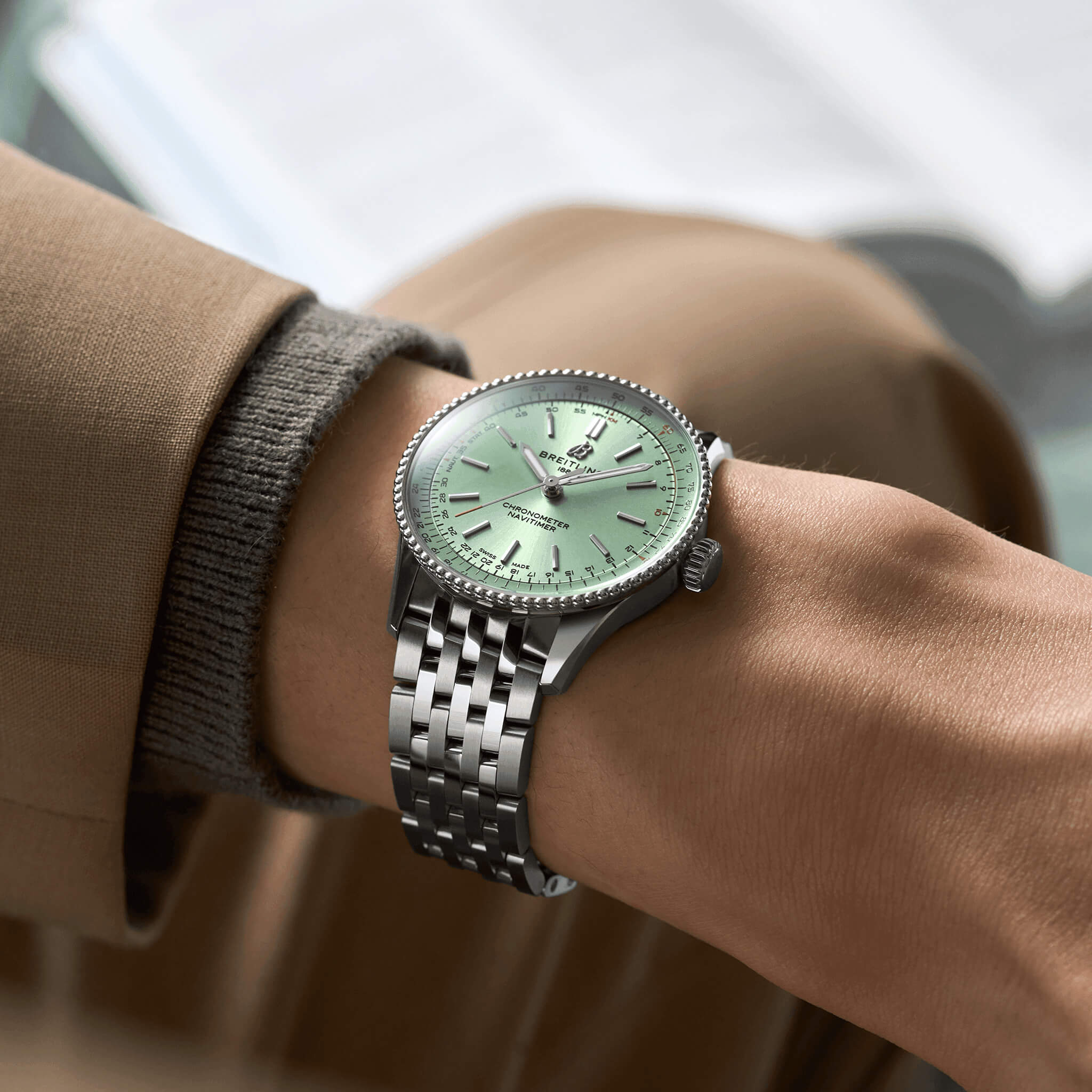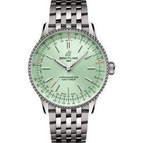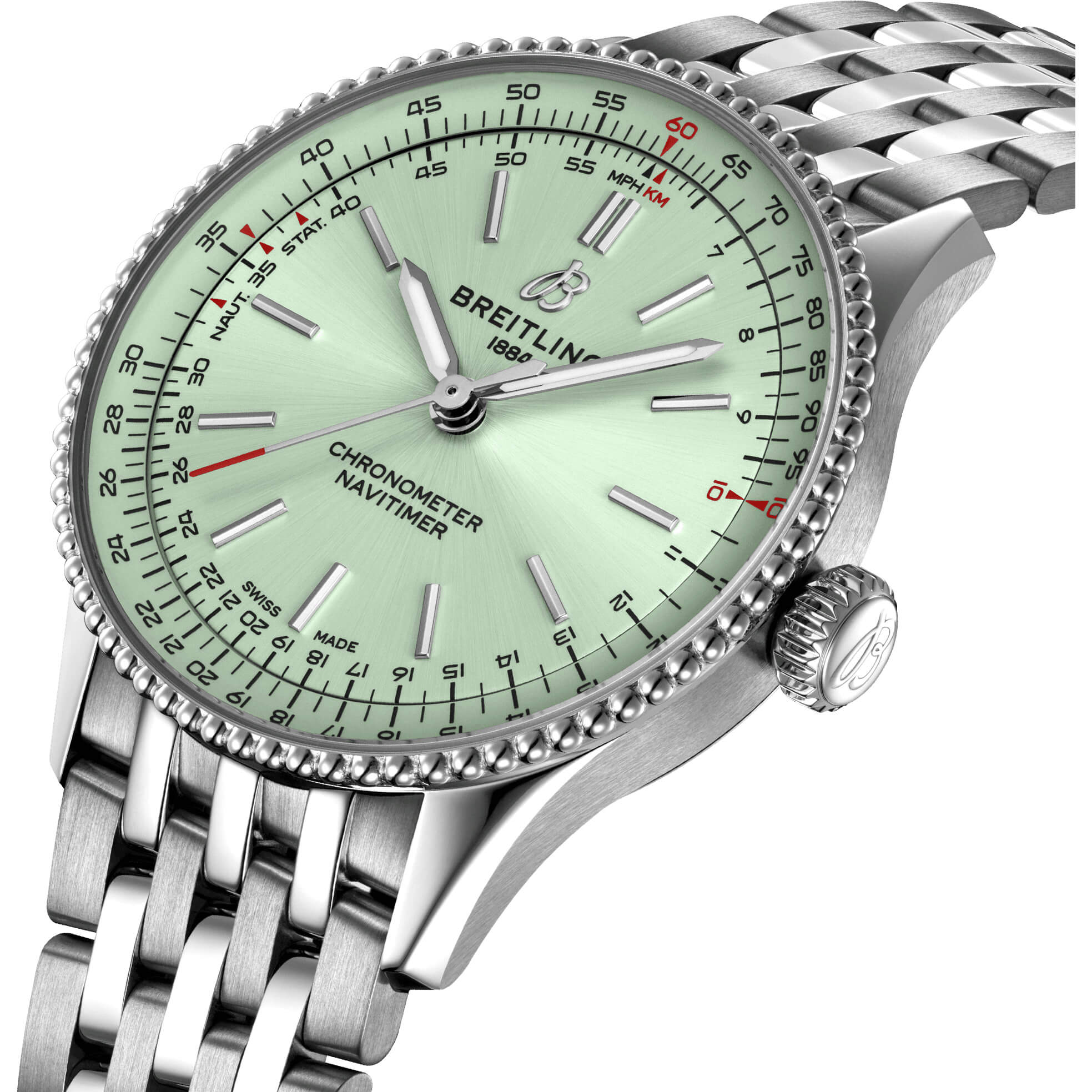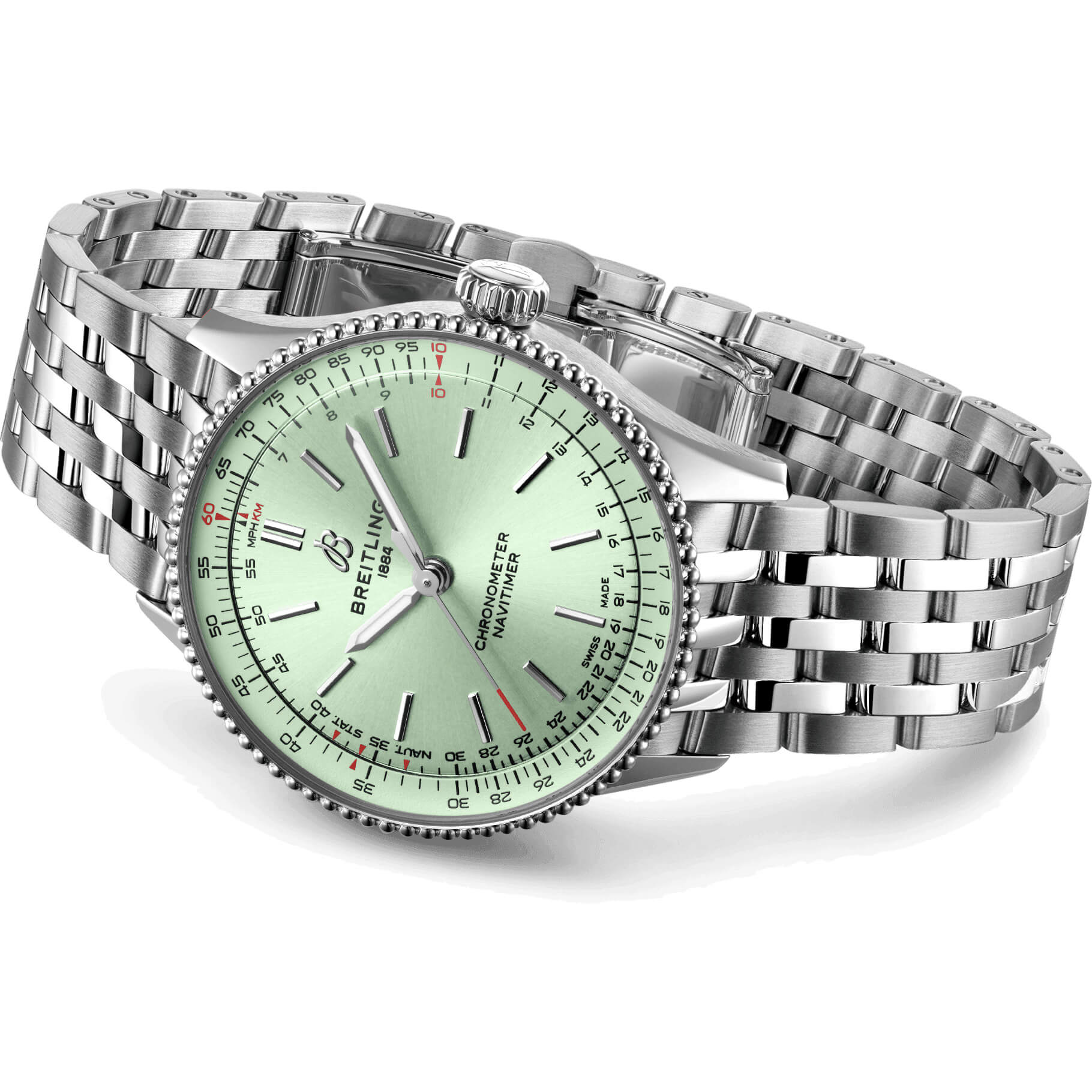 Die Navitimer Automatic 36 kombiniert raffiniert und elegant das historische Flair einer wahren Legende mit der Finesse eines modernen Zeitmessers. Die Uhr mit ihrem 36-mm-Gehäuse aus Edelstahl verfügt über eine Perlenlünette, ein mintfarbenes Ziffernblatt und ein 7-reihiges Edelstahlarmband mit abwechselnd polierten und mattierten Elementen. Angetrieben wird sie vom Breitling-Kaliber 17, einem COSC-zertifizierten Chronometer.- Durchmesser