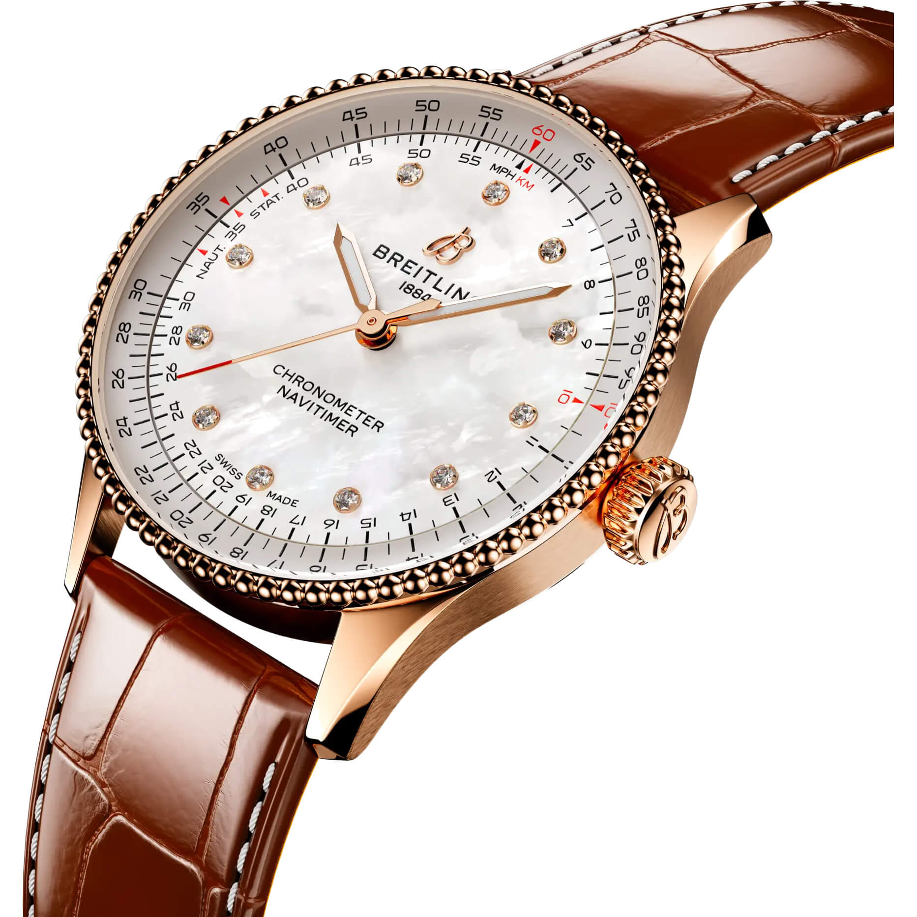 Breitlings Ikone – jetzt für jede Reise. Die Navitimer zählt zu den legendärsten Uhren der Welt und steht auf der Wunschliste vieler Sammler. Ursprünglich 1952 als Pilotenuhr entwickelt, ist sie heute ein zeitloser Begleiter für alle, die auf ihrer persönlichen Reise Stil und Präzision schätzen. Jetzt gibt es die Navitimer in 36 mm und 32 mm – perfekt für alle, die einen kleineren Durchmesser bevorzugen. Während die 36-mm-Version mit der typischen Perlenlünette und dem ikonischen Rechenschieber ausgestattet ist, setzt die 32-mm-Variante auf ein elegantes, reduziertes Zifferblattdesign. Doch diese neuen Modelle bieten weit mehr als nur eine kompakte Größe. Pastelltöne, schimmerndes Perlmutt und nachhaltige Materialien verleihen ihnen eine schmuckähnliche Eleganz – für einen zeitlosen Look, der Sie auf all Ihren Wegen begleitet.- Durchmesser