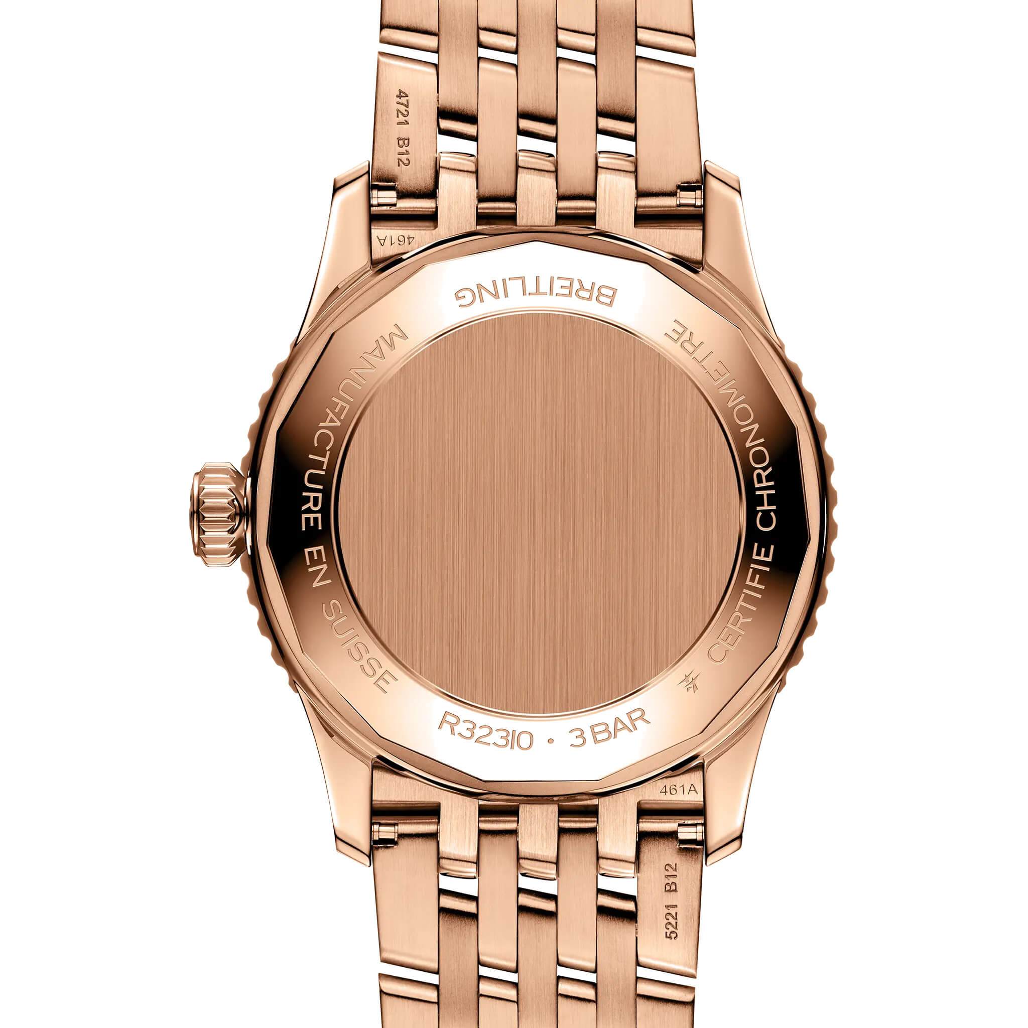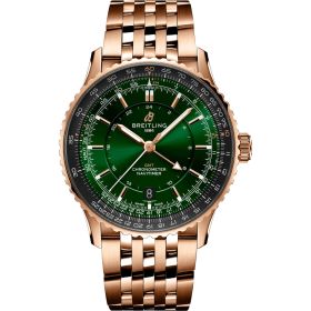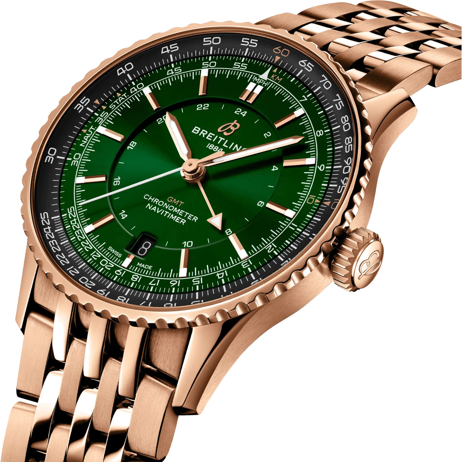Die Navitimer Automatic GMT 41 aus 18-karätigem Rotgold vereint ikonisches Design mit moderner Funktionalität und steht ganz im Zeichen von „For the Journey“. Als Neuinterpretation einer der legendärsten Fliegeruhren verbindet sie klassische Elemente mit zeitgemäßer Eleganz. Das 41 mm große Gehäuse aus rückverfolgbarem Rotgold unterstreicht den exklusiven Charakter dieses Modells und harmoniert perfekt mit dem integrierten Goldarmband. Die charakteristische Rechenschieber-Lünette bleibt ein zentrales Designelement, während die klar gestaltete Anzeige durch die zentrale 24-Stunden-Skala der GMT-Funktion eine zweite Zeitzone auf einen Blick erfassbar macht. Im Inneren arbeitet das Automatikwerk Breitling Kaliber 32 mit einer Gangreserve von rund 42 Stunden und einer Frequenz von 4 Hz. Die Kombination aus präziser Technik und praktischer GMT-Funktion macht die Uhr zum idealen Begleiter für Vielreisende. Ein bombiertes, beidseitig entspiegeltes Saphirglas sorgt für optimale Ablesbarkeit, während die hochwertige Verarbeitung mit abwechselnd polierten und satinierten Flächen für ein lebendiges Lichtspiel sorgt. Mit einer Wasserdichtigkeit bis 3 bar ist die Navitimer Automatic GMT 41 eine stilvolle Uhr für Alltag und Reise gleichermaßen.- Durchmesser