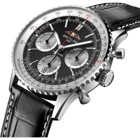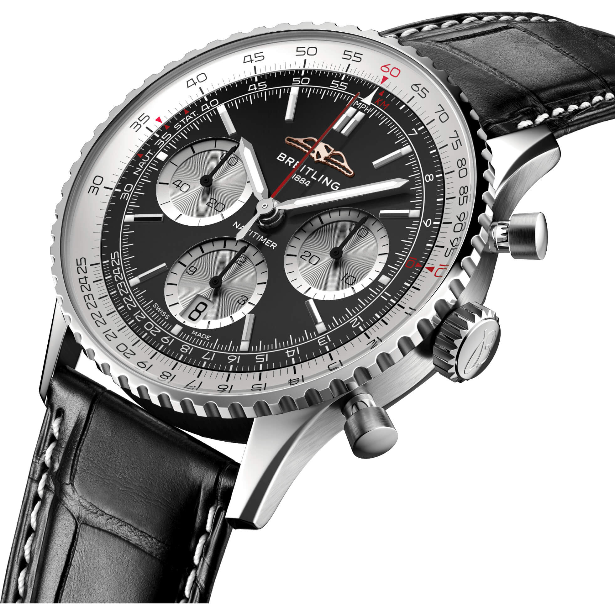 Der legendäre Fliegerchronograph von Breitling – für die Reise. Im Jahr 1952 entwickelt Willy Breitling einen Chronographen mit einem kreisförmigen Rechenschieber, mit dem Piloten alle notwendigen Flugberechnungen durchführen können. Zwei Jahre später macht die renommierte amerikanische Vereinigung AOPA (Aircraft Owners and Pilots Association) diese Ausführung zu ihrem offiziellen Zeitmesser. Die «Navigation Timer» – oder Navitimer – ist geboren. Die AOPA ist und bleibt der grösste Pilotenverein der Welt und zählt fast jeden US-Piloten zu ihren Mitgliedern. Als De-facto-Fliegeruhr während der glorreichen Ära der zivilen Luftfahrt wurde die Navitimer von Piloten und Flugbegeisterten gleichermassen getragen. 1962 schaffte sie es am Handgelenk des Astronauten Scott Carpenter sogar ins Weltall. Doch nicht nur Piloten waren von der unbändigen Ästhetik der Uhr beeindruckt. Berühmtheiten wie Miles Davis oder Serge Gainsbourg gehörten ebenfalls zu ihren Fans und bewiesen damit, dass die Navitimer nicht nur stilvoll, sondern auch funktional war. Seit ihrer Markteinfürung vor über 70 Jahren wurden diverse Modelle dieser Breitling Ikone lanciert, doch diese neue Navitimer überzeugt mit ihren klassischen Eigenschaften, die mithilfe moderner Verbesserungen noch verfeinert wurden. Ein abgeflachter Rechenschieber und ein gewölbtes Glas schaffen den Eindruck eines schlankeren Profils. Der Wechsel von polierten und gebürsteten Metallelementen sorgt für ein schimmerndes und dennoch dezentes Aussehen. Und wenn es eine Neuerung gibt, die für Nostalgie sorgen wird, sind es die AOPA-Flügel, die nun wieder dort sind, wo sie ursprünglich waren – bei 12 Uhr. Seit bereits mehr als 70 Jahren erfreut sich die Original-Fliegeruhr grosser Beliebtheit bei Piloten und Trendsettern gleichermassen. Getragen von Astronauten im Weltraum und von den grössten Stars der Welt, handelt es sich um den legendärsten Zeitmesser von Breitling und um eine der unverwechselbarsten Uhren aller Zeiten.- Durchmesser