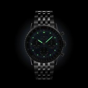 Bei der Schaffung der neuen Navitimer – hier in der Variante mit 41 mm Gehäuse aus Edelstahl mit Saphirglasboden, silbernem Metallarmband und dunkelblauem Zifferblatt – behielt Breitling die unverkennbaren Aspekte des Original-Designcodes der Legende bei. Aus einiger Entfernung ist sie unverkennbar eine Navitimer. Sie hat den kreisförmigen Rechenschieber, die stabförmigen Zeiger, die drei Chronographenzähler und die Lünette mit Griffmulden für einen guten Griff. Aber wenn man näherkommt, sieht man ganz deutlich ihre modernen Feinheiten. Ein abgeflachter Rechenschieber und ein gewölbtes Glas erzeugen den Eindruck eines kompakteren Profils. Polierte und gebürstete Finishes verleihen den Metallelementen ein hochwertiges, glänzendes, aber dennoch dezentes Aussehen. Eine schlankere Silhouette der Schwungmasse verbessert den Blick durch den offenen Gehäuseboden des COSC-zertifizierten Breitling-Manufakturkalibers 01. Dieses Uhrwerk ist mit einer fünfjährigen Garantie versehen, bietet ca. 70 Stunden Gangreserve und erlaubt es dem Träger, jederzeit das Datum zu ändern, das nun durch ein dezentes Fenster im Hilfszifferblatt bei 6 Uhr sichtbar ist. Die Uhr ist erhältlich in mehreren Grössen (46, 43 oder 41 mm), mit zwei verschiedenen Gehäusematerialien (Edelstahl oder 18-karätiges Rotgold) sowie mit einer Auswahl an Armbändern (seidenmattes Alligatorleder- oder siebenreihiges Metallarmband). Neue Farben in Blau-, Grün- und Kupfertönen betonen ihre modernen Zifferblattoptionen. Und wenn es ein Detail gibt, das für Nostalgie sorgen wird, dann sind es die AOPA-Flügel, die nun wieder dort sind, wo sie ursprünglich waren – bei 12 Uhr.