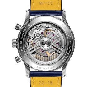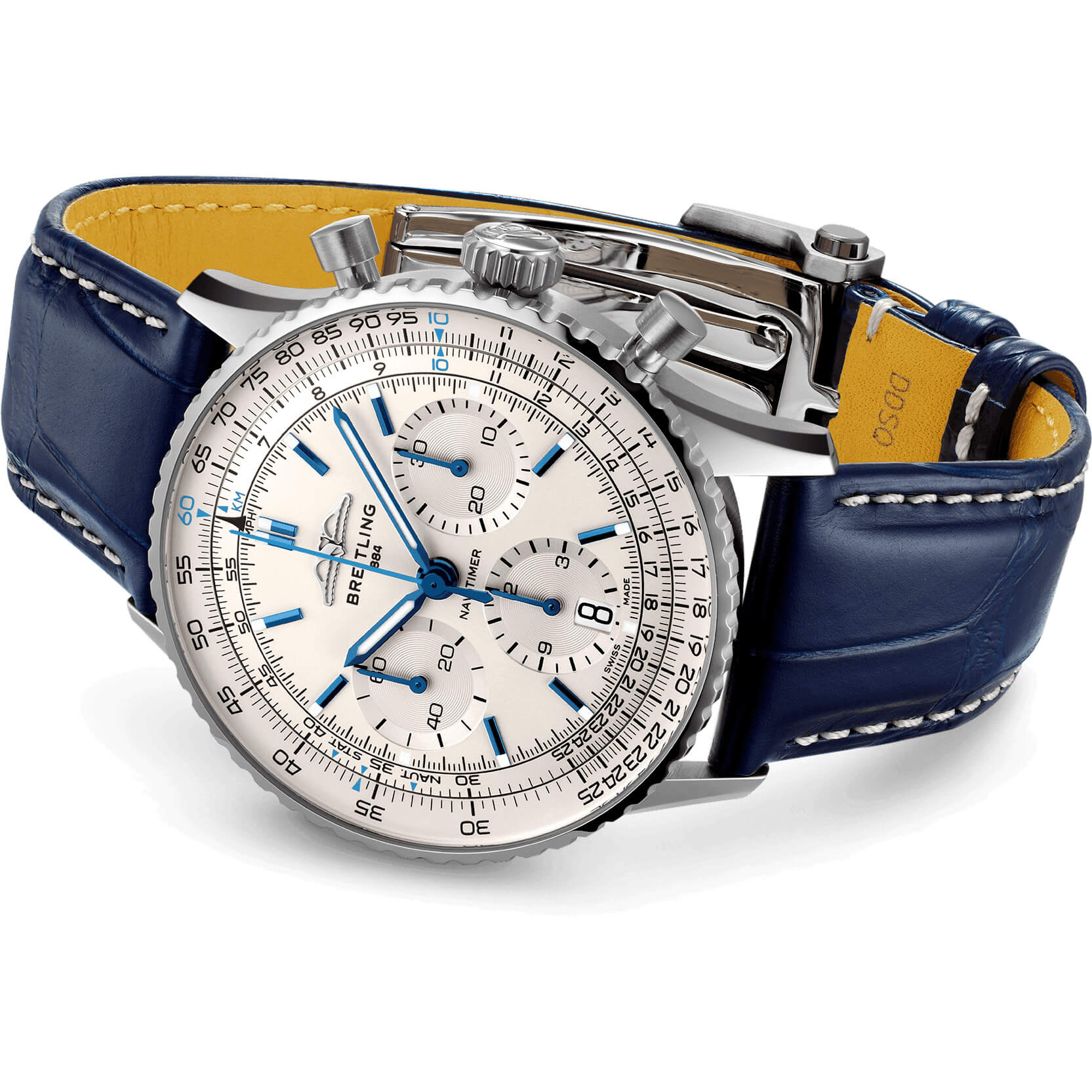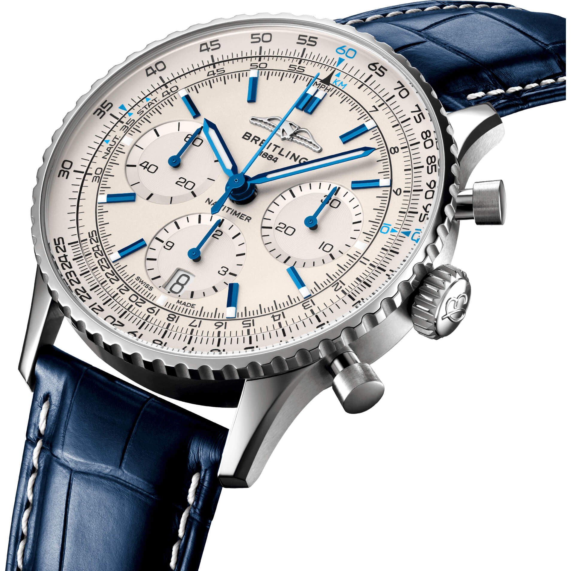 Entdecken Sie jetzt die exklusive Boutique-Edition der Breitling Navitimer B01 Chronograph 41, die mit eleganten blauen Zeigern, Indizes und Akzenten auf dem Ziffernblatt veredelt wurde. Diese Uhr ist wahlweise mit einem Edelstahlband oder einem blauen Alligatorlederband mit praktischer Faltschließe erhältlich. Der legendäre Fliegerchronograph von Breitling – für die Reise. Im Jahr 1952 entwickelt Willy Breitling einen Chronographen mit einem kreisförmigen Rechenschieber, mit dem Piloten alle notwendigen Flugberechnungen durchführen können. Seit ihrer Markteinfürung vor mehr als 70 Jahren wurden diverse Modelle dieser Breitling Ikone lanciert, doch die neue Navitimer überzeugt mit ihren klassischen Eigenschaften, die mithilfe moderner Verbesserungen noch verfeinert wurden. Ein abgeflachter Rechenschieber und ein gewölbtes Glas schaffen den Eindruck eines schlankeren Profils. Der Wechsel von polierten und gebürsteten Metallelementen sorgt für ein schimmerndes und dennoch dezentes Aussehen. Und wenn es eine Neuerung gibt, die für Nostalgie sorgen wird, sind es die AOPA-Flügel, die nun wieder dort sind, wo sie ursprünglich waren – bei 12 Uhr. Seit über 70 Jahren erfreut sich die Original-Fliegeruhr grosser Beliebtheit bei Piloten und Trendsettern gleichermassen. Getragen von Astronauten im Weltraum und von den grössten Stars der Welt, handelt es sich um den legendärsten Zeitmesser von Breitling und um eine der unverwechselbarsten Uhren aller Zeiten.- Durchmesser