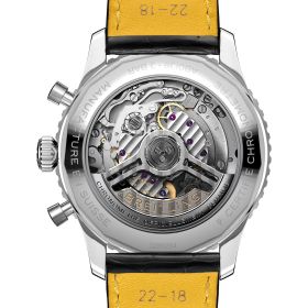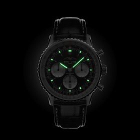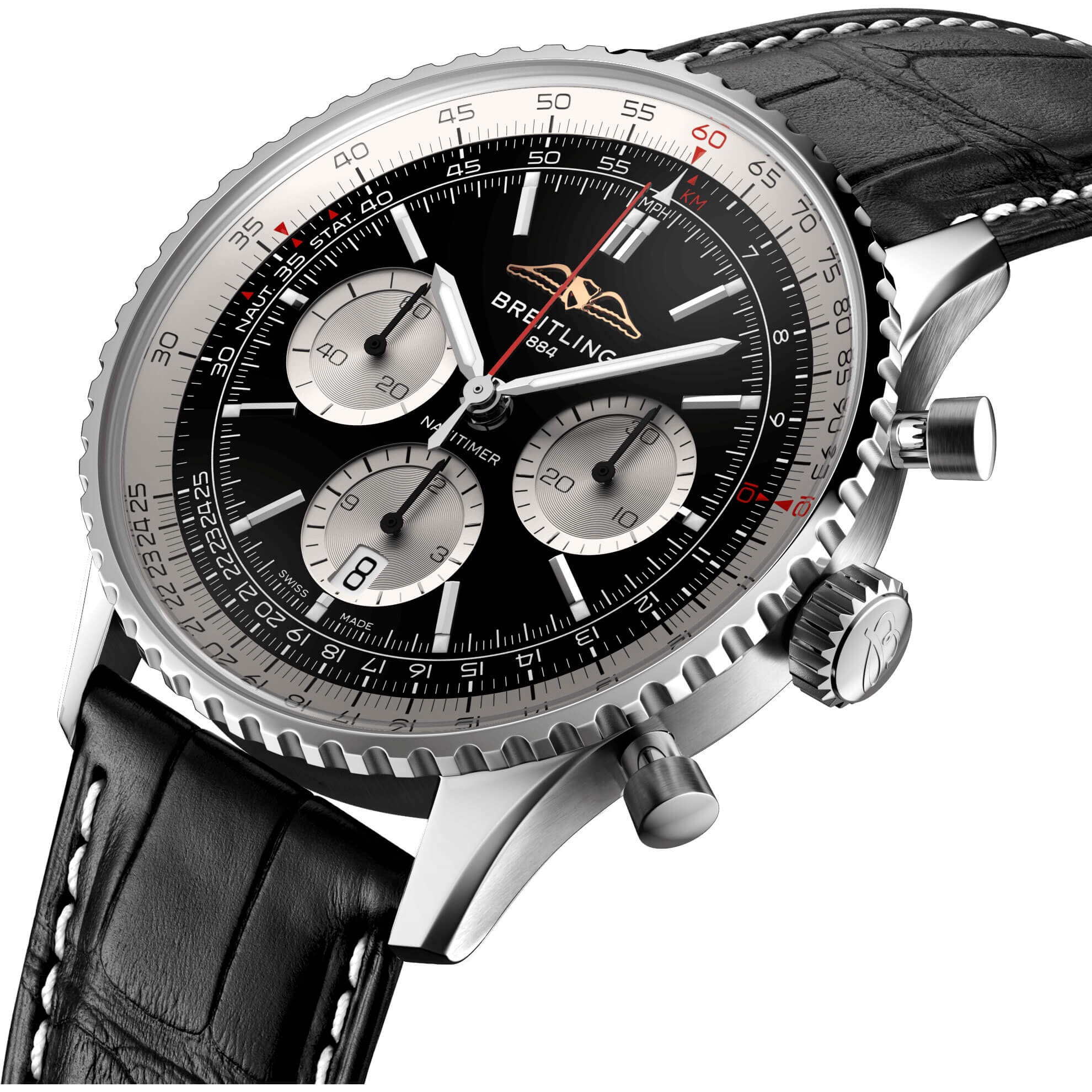 Bei der Schaffung der neuen Navitimer – hier in der Variante mit 43 mm Gehäuse aus Edelstahl mit Saphirglasboden, schwarzen Krokodillederarmband und schwarzem Zifferblatt – behielt Breitling die unverkennbaren Aspekte des Original-Designcodes der Legende bei. Aus einiger Entfernung ist sie unverkennbar eine Navitimer. Sie hat den kreisförmigen Rechenschieber, die stabförmigen Zeiger, die drei Chronographenzähler und die Lünette mit Griffmulden für einen guten Griff. Aber wenn man näherkommt, sieht man ganz deutlich ihre modernen Feinheiten. Ein abgeflachter Rechenschieber und ein gewölbtes Glas erzeugen den Eindruck eines kompakteren Profils. Polierte und gebürstete Finishes verleihen den Metallelementen ein hochwertiges, glänzendes, aber dennoch dezentes Aussehen. Eine schlankere Silhouette der Schwungmasse verbessert den Blick durch den offenen Gehäuseboden des COSC-zertifizierten Breitling-Manufakturkalibers 01. Dieses Uhrwerk ist mit einer fünfjährigen Garantie versehen, bietet ca. 70 Stunden Gangreserve und erlaubt es dem Träger, jederzeit das Datum zu ändern, das nun durch ein dezentes Fenster im Hilfszifferblatt bei 6 Uhr sichtbar ist. Die Uhr ist erhältlich in mehreren Grössen (46, 43 oder 41 mm), mit zwei verschiedenen Gehäusematerialien (Edelstahl oder 18-karätiges Rotgold) sowie mit einer Auswahl an Armbändern (seidenmattes Alligatorleder- oder siebenreihiges Metallarmband). Neue Farben in Blau-, Grün- und Kupfertönen betonen ihre modernen Zifferblattoptionen. Und wenn es ein Detail gibt, das für Nostalgie sorgen wird, dann sind es die AOPA-Flügel, die nun wieder dort sind, wo sie ursprünglich waren – bei 12 Uhr.