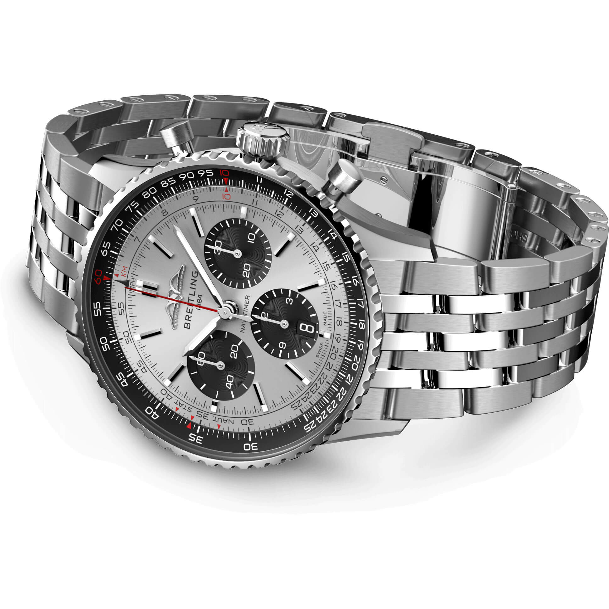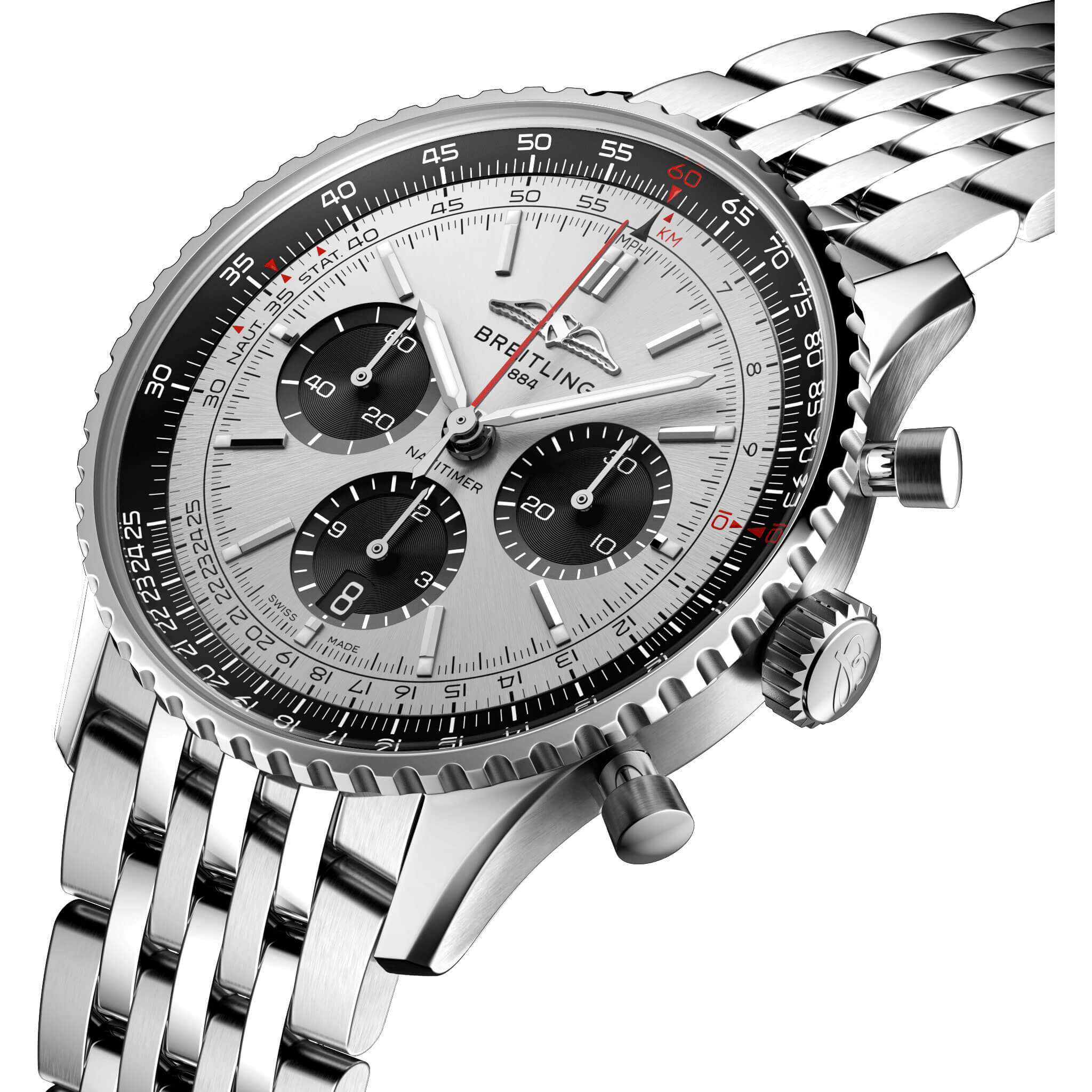 Bei der Schaffung der neuen Navitimer – hier in der Variante mit 43 mm Gehäuse aus Edelstahl mit Saphirglasboden, silbernem Metallarmband und schwarz-versilbertem Zifferblatt – behielt Breitling die unverkennbaren Aspekte des Original-Designcodes der Legende bei. Aus einiger Entfernung ist sie unverkennbar eine Navitimer. Sie hat den kreisförmigen Rechenschieber, die stabförmigen Zeiger, die drei Chronographenzähler und die Lünette mit Griffmulden für einen guten Griff. Aber wenn man näherkommt, sieht man ganz deutlich ihre modernen Feinheiten. Ein abgeflachter Rechenschieber und ein gewölbtes Glas erzeugen den Eindruck eines kompakteren Profils. Polierte und gebürstete Finishes verleihen den Metallelementen ein hochwertiges, glänzendes, aber dennoch dezentes Aussehen. Eine schlankere Silhouette der Schwungmasse verbessert den Blick durch den offenen Gehäuseboden des COSC-zertifizierten Breitling-Manufakturkalibers 01. Dieses Uhrwerk ist mit einer fünfjährigen Garantie versehen, bietet ca. 70 Stunden Gangreserve und erlaubt es dem Träger, jederzeit das Datum zu ändern, das nun durch ein dezentes Fenster im Hilfszifferblatt bei 6 Uhr sichtbar ist. Die Uhr ist erhältlich in mehreren Grössen (46, 43 oder 41 mm), mit zwei verschiedenen Gehäusematerialien (Edelstahl oder 18-karätiges Rotgold) sowie mit einer Auswahl an Armbändern (seidenmattes Alligatorleder- oder siebenreihiges Metallarmband). Neue Farben in Blau-, Grün- und Kupfertönen betonen ihre modernen Zifferblattoptionen. Und wenn es ein Detail gibt, das für Nostalgie sorgen wird, dann sind es die AOPA-Flügel, die nun wieder dort sind, wo sie ursprünglich waren – bei 12 Uhr.