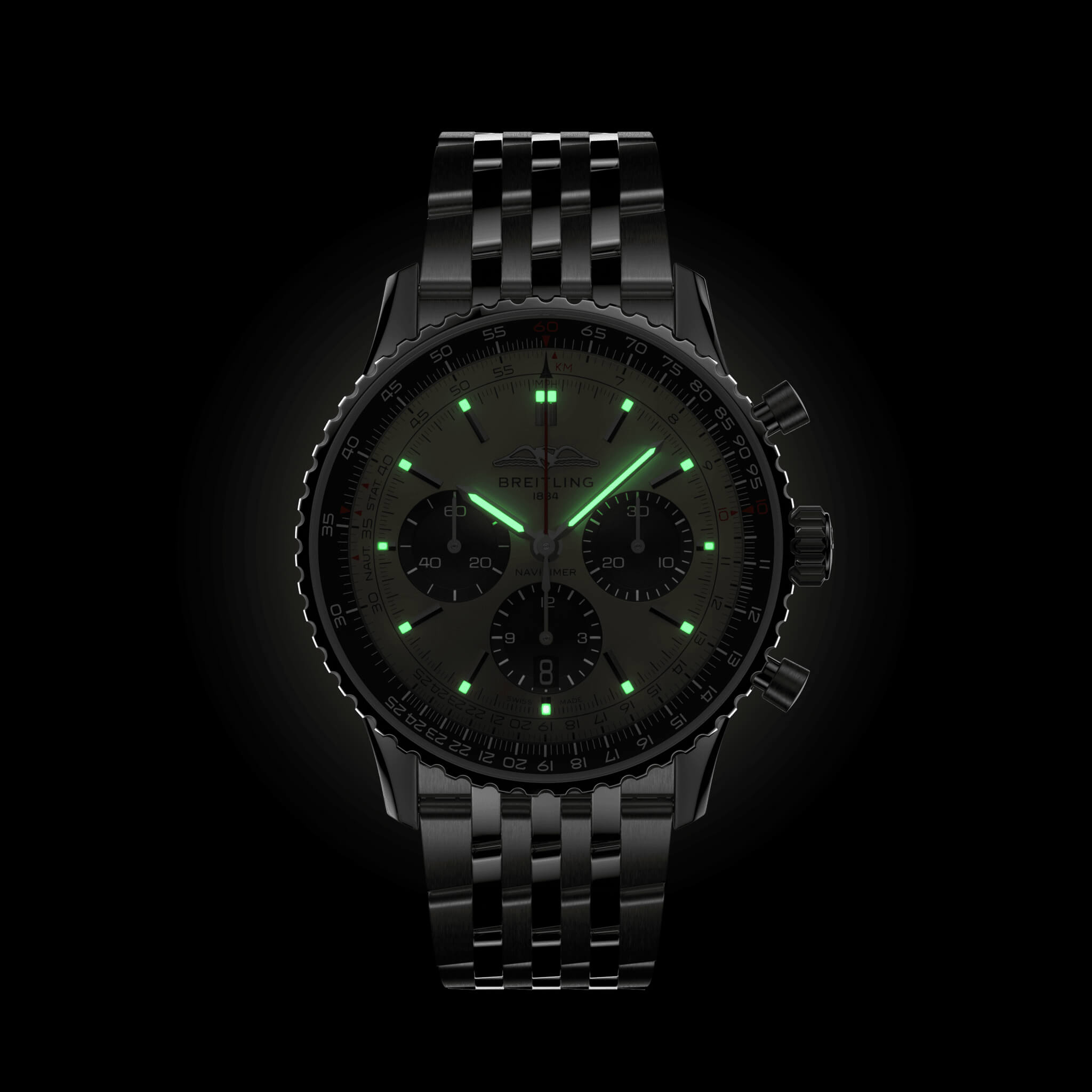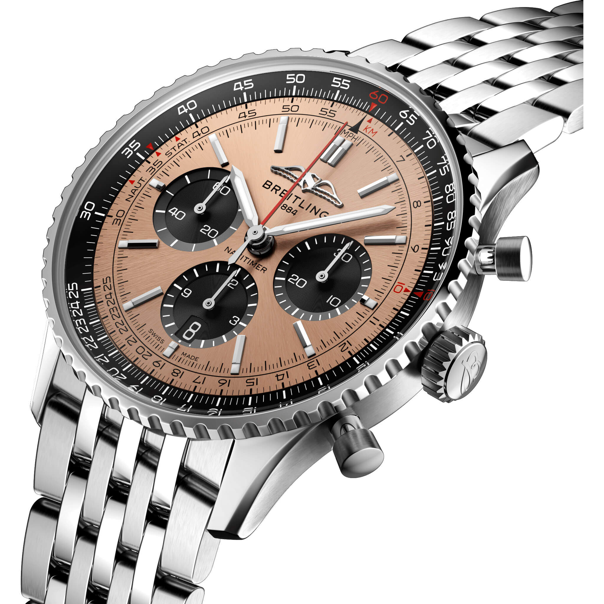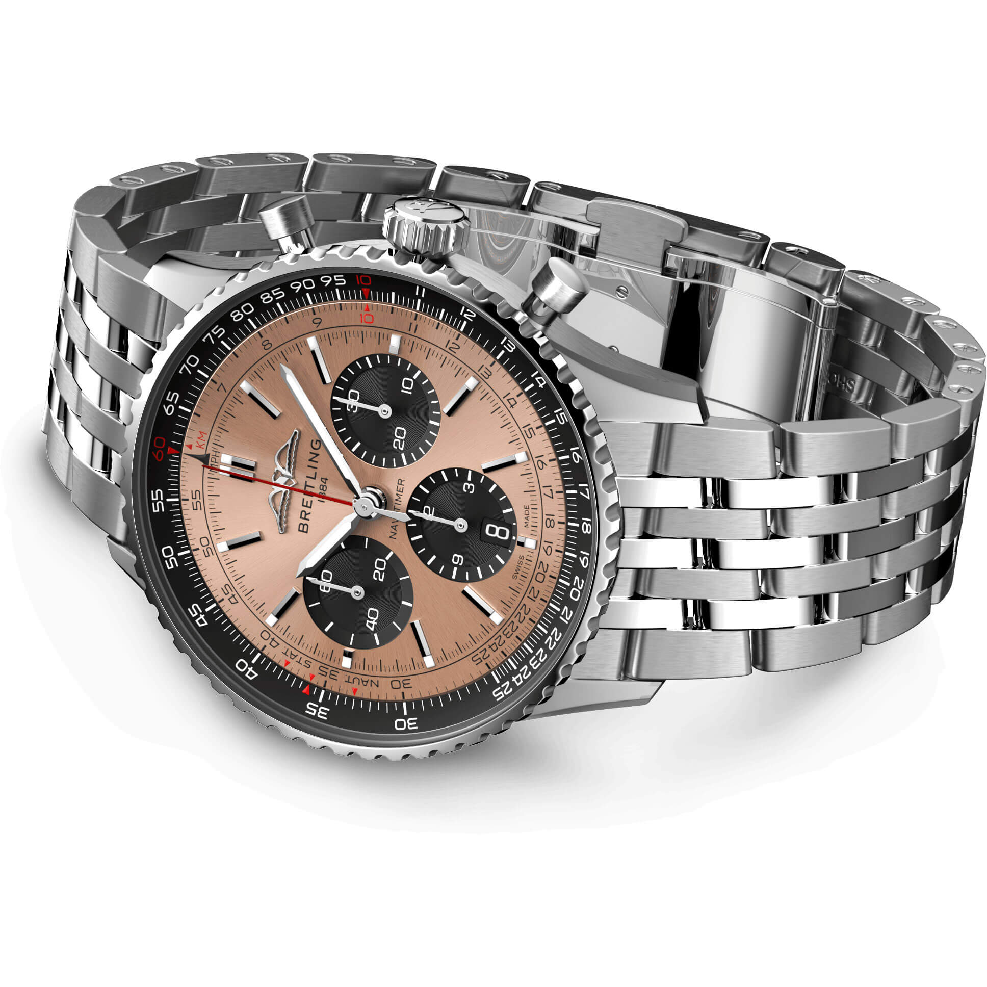 Bei der Schaffung der neuen Navitimer – hier in der Variante mit 43 mm Gehäuse aus Edelstahl mit Saphirglasboden, silbernem Metallarmband und kupferfarbenem Zifferblatt – behielt Breitling die unverkennbaren Aspekte des Original-Designcodes der Legende bei. Aus einiger Entfernung ist sie unverkennbar eine Navitimer. Sie hat den kreisförmigen Rechenschieber, die stabförmigen Zeiger, die drei Chronographenzähler und die Lünette mit Griffmulden für einen guten Griff. Aber wenn man näherkommt, sieht man ganz deutlich ihre modernen Feinheiten. Ein abgeflachter Rechenschieber und ein gewölbtes Glas erzeugen den Eindruck eines kompakteren Profils. Polierte und gebürstete Finishes verleihen den Metallelementen ein hochwertiges, glänzendes, aber dennoch dezentes Aussehen. Eine schlankere Silhouette der Schwungmasse verbessert den Blick durch den offenen Gehäuseboden des COSC-zertifizierten Breitling-Manufakturkalibers 01. Dieses Uhrwerk ist mit einer fünfjährigen Garantie versehen, bietet ca. 70 Stunden Gangreserve und erlaubt es dem Träger, jederzeit das Datum zu ändern, das nun durch ein dezentes Fenster im Hilfszifferblatt bei 6 Uhr sichtbar ist. Die Uhr ist erhältlich in mehreren Grössen (46, 43 oder 41 mm), mit zwei verschiedenen Gehäusematerialien (Edelstahl oder 18-karätiges Rotgold) sowie mit einer Auswahl an Armbändern (seidenmattes Alligatorleder- oder siebenreihiges Metallarmband). Neue Farben in Blau-, Grün- und Kupfertönen betonen ihre modernen Zifferblattoptionen. Und wenn es ein Detail gibt, das für Nostalgie sorgen wird, dann sind es die AOPA-Flügel, die nun wieder dort sind, wo sie ursprünglich waren – bei 12 Uhr.