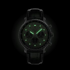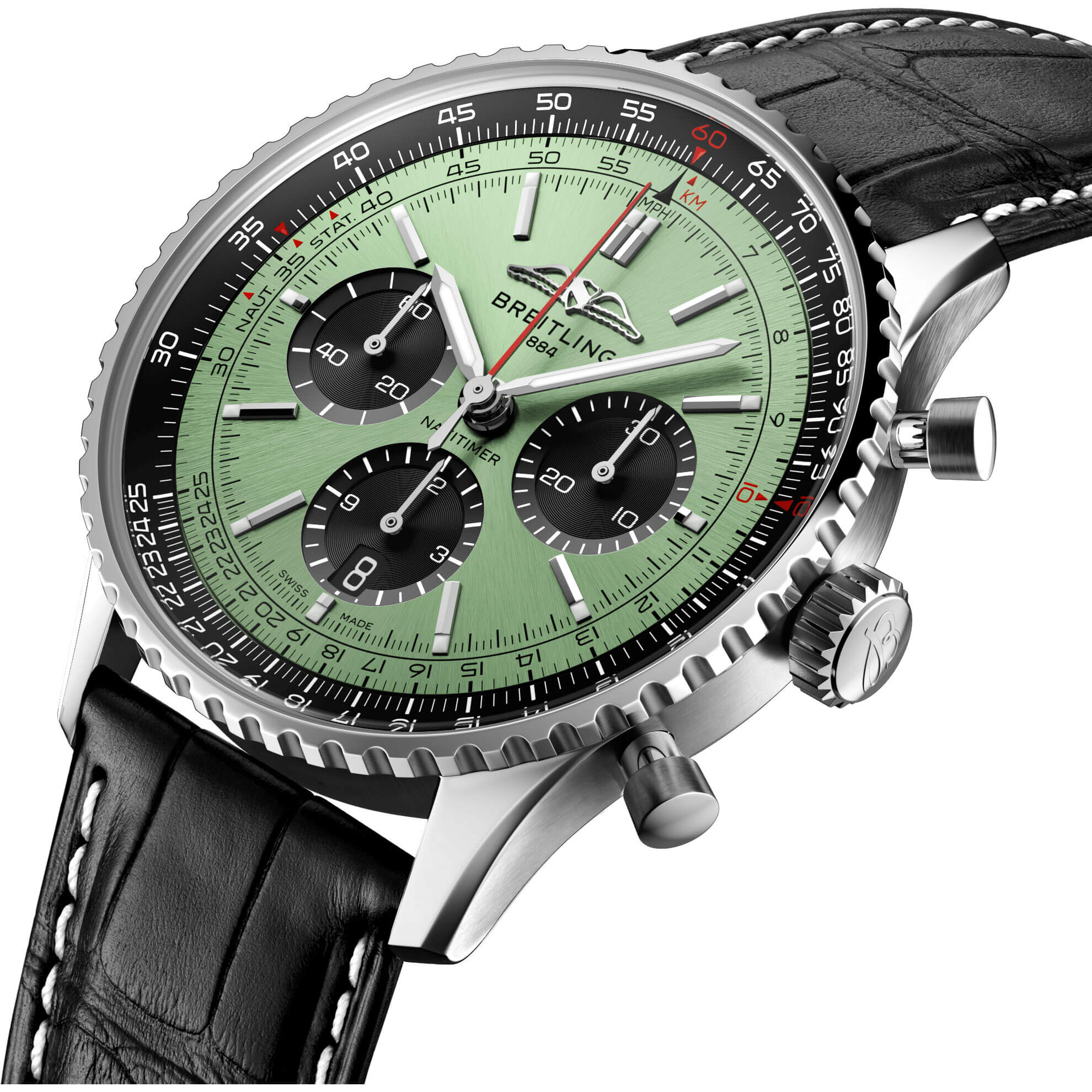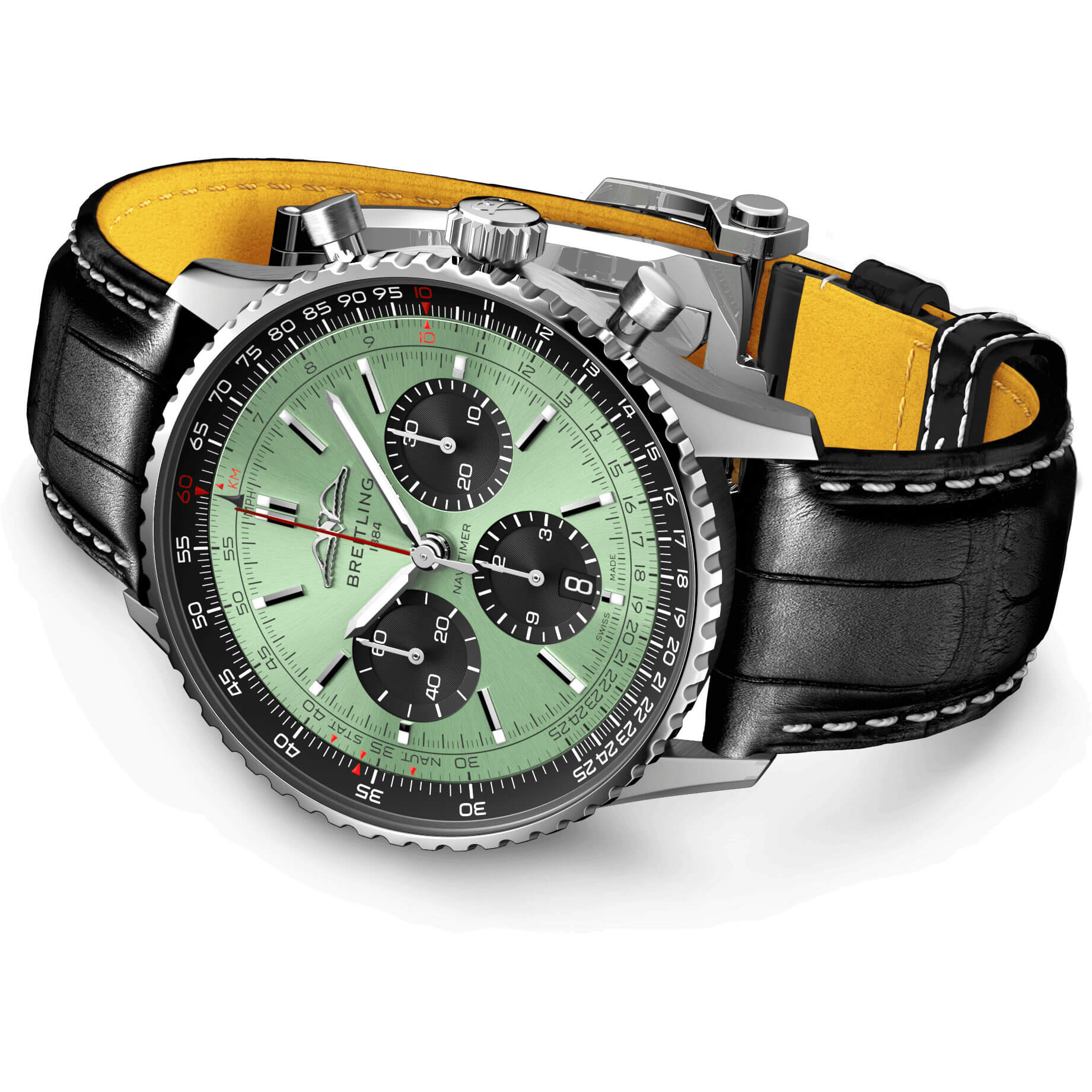 Bei der Schaffung der neuen Navitimer – hier in der Variante mit 43 mm Gehäuse aus Edelstahl mit Saphirglasboden, schwarzem Lederarmband grün-schwarzem Zifferblatt – behielt Breitling die unverkennbaren Aspekte des Original-Designcodes der Legende bei. Aus einiger Entfernung ist sie unverkennbar eine Navitimer. Sie hat den kreisförmigen Rechenschieber, die stabförmigen Zeiger, die drei Chronographenzähler und die Lünette mit Griffmulden für einen guten Griff. Aber wenn man näherkommt, sieht man ganz deutlich ihre modernen Feinheiten. Ein abgeflachter Rechenschieber und ein gewölbtes Glas erzeugen den Eindruck eines kompakteren Profils. Polierte und gebürstete Finishes verleihen den Metallelementen ein hochwertiges, glänzendes, aber dennoch dezentes Aussehen. Eine schlankere Silhouette der Schwungmasse verbessert den Blick durch den offenen Gehäuseboden des COSC-zertifizierten Breitling-Manufakturkalibers 01. Dieses Uhrwerk ist mit einer fünfjährigen Garantie versehen, bietet ca. 70 Stunden Gangreserve und erlaubt es dem Träger, jederzeit das Datum zu ändern, das nun durch ein dezentes Fenster im Hilfszifferblatt bei 6 Uhr sichtbar ist. Die Uhr ist erhältlich in mehreren Grössen (46, 43 oder 41 mm), mit zwei verschiedenen Gehäusematerialien (Edelstahl oder 18-karätiges Rotgold) sowie mit einer Auswahl an Armbändern (seidenmattes Alligatorleder- oder siebenreihiges Metallarmband). Neue Farben in Blau-, Grün- und Kupfertönen betonen ihre modernen Zifferblattoptionen. Und wenn es ein Detail gibt, das für Nostalgie sorgen wird, dann sind es die AOPA-Flügel, die nun wieder dort sind, wo sie ursprünglich waren – bei 12 Uhr.