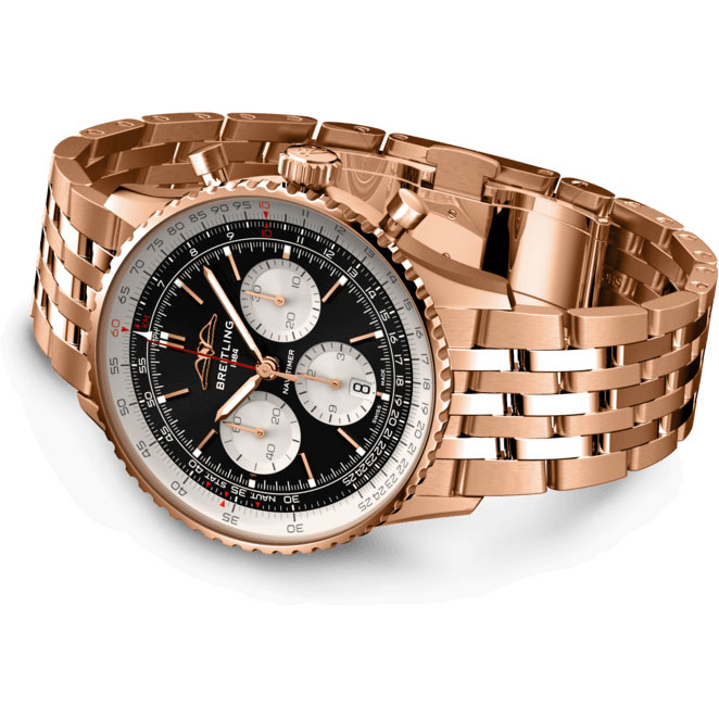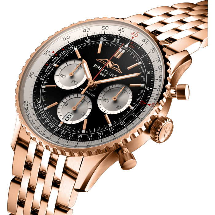 Der legendäre Fliegerchronograph von Breitling – für die Reise. Im Jahr 1952 entwickelt Willy Breitling einen Chronographen mit einem kreisförmigen Rechenschieber, mit dem Piloten alle notwendigen Flugberechnungen durchführen können. Zwei Jahre später macht die renommierte amerikanische Vereinigung AOPA (Aircraft Owners and Pilots Association) diese Ausführung zu ihrem offiziellen Zeitmesser. Die «Navigation Timer» – oder Navitimer – ist geboren. Die AOPA ist und bleibt der grösste Pilotenverein der Welt und zählt fast jeden US-Piloten zu ihren Mitgliedern. Als De-facto-Fliegeruhr während der glorreichen Ära der zivilen Luftfahrt wurde die Navitimer von Piloten und Flugbegeisterten gleichermassen getragen. 1962 schaffte sie es am Handgelenk des Astronauten Scott Carpenter sogar ins Weltall. Doch nicht nur Piloten waren von der unbändigen Ästhetik der Uhr beeindruckt. Berühmtheiten wie Miles Davis oder Serge Gainsbourg gehörten ebenfalls zu ihren Fans und bewiesen damit, dass die Navitimer nicht nur stilvoll, sondern auch funktional war. Seit ihrer Markteinfürung vor 70 Jahren wurden diverse Modelle dieser Breitling Ikone lanciert, doch diese neue Navitimer überzeugt mit ihren klassischen Eigenschaften, die mithilfe moderner Verbesserungen noch verfeinert wurden. Ein abgeflachter Rechenschieber und ein gewölbtes Glas schaffen den Eindruck eines schlankeren Profils. Der Wechsel von polierten und gebürsteten Metallelementen sorgt für ein schimmerndes und dennoch dezentes Aussehen. Und wenn es eine Neuerung gibt, die für Nostalgie sorgen wird, sind es die AOPA-Flügel, die nun wieder dort sind, wo sie ursprünglich waren – bei 12 Uhr. Seit bereits 70 Jahren erfreut sich die Original-Fliegeruhr grosser Beliebtheit bei Piloten und Trendsettern gleichermassen. Getragen von Astronauten im Weltraum und von den grössten Stars der Welt, handelt es sich um den legendärsten Zeitmesser von Breitling und um eine der unverwechselbarsten Uhren aller Zeiten.- Durchmesser