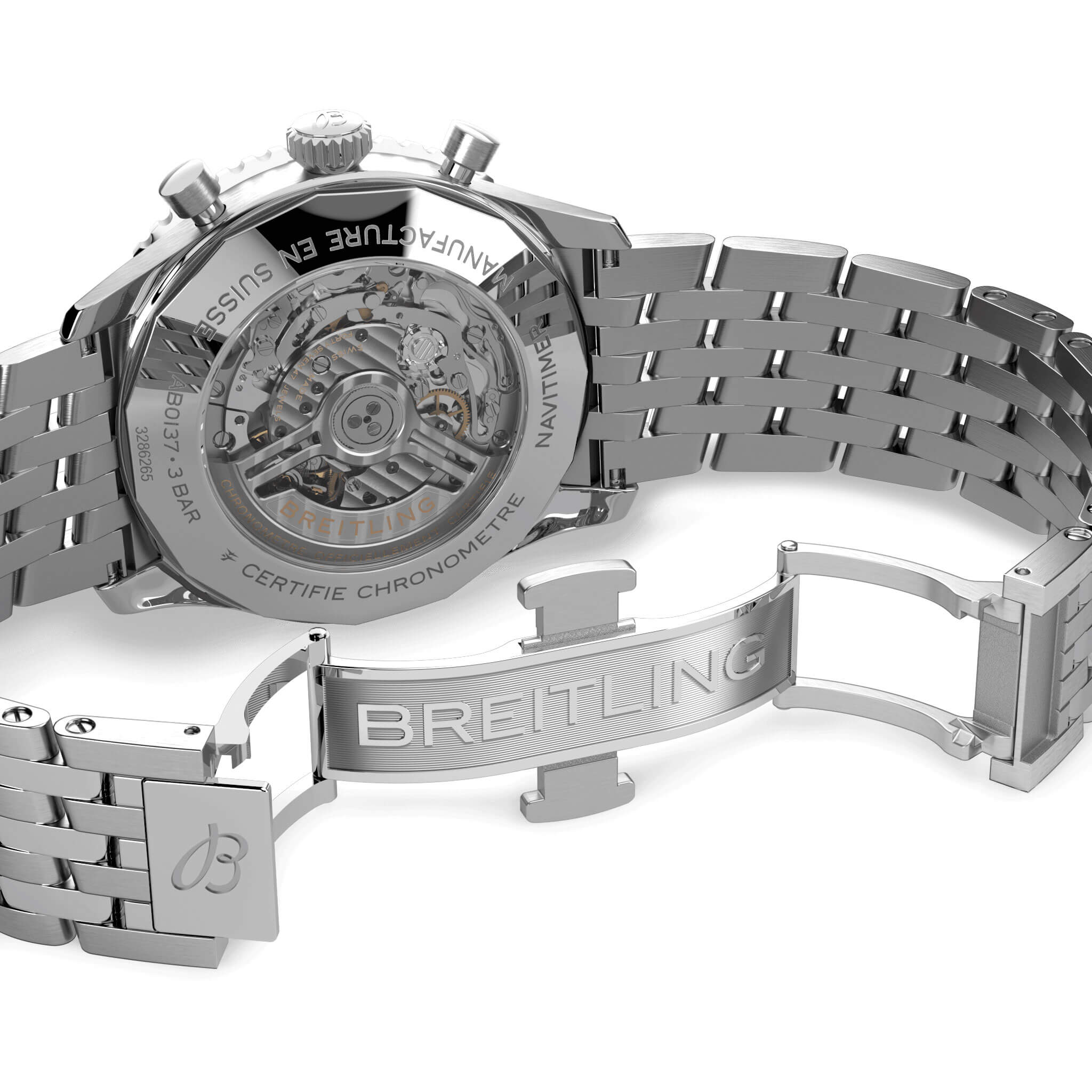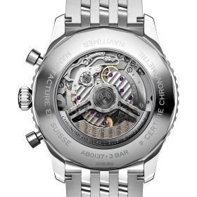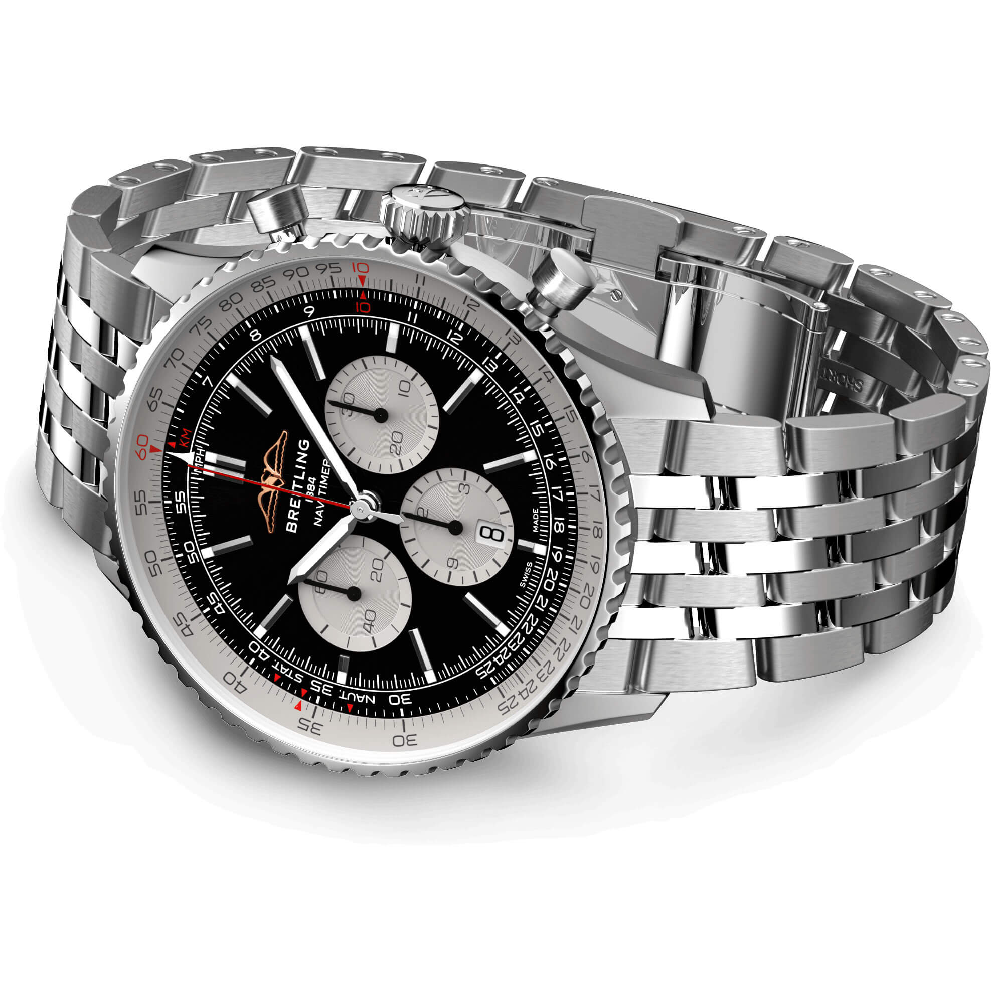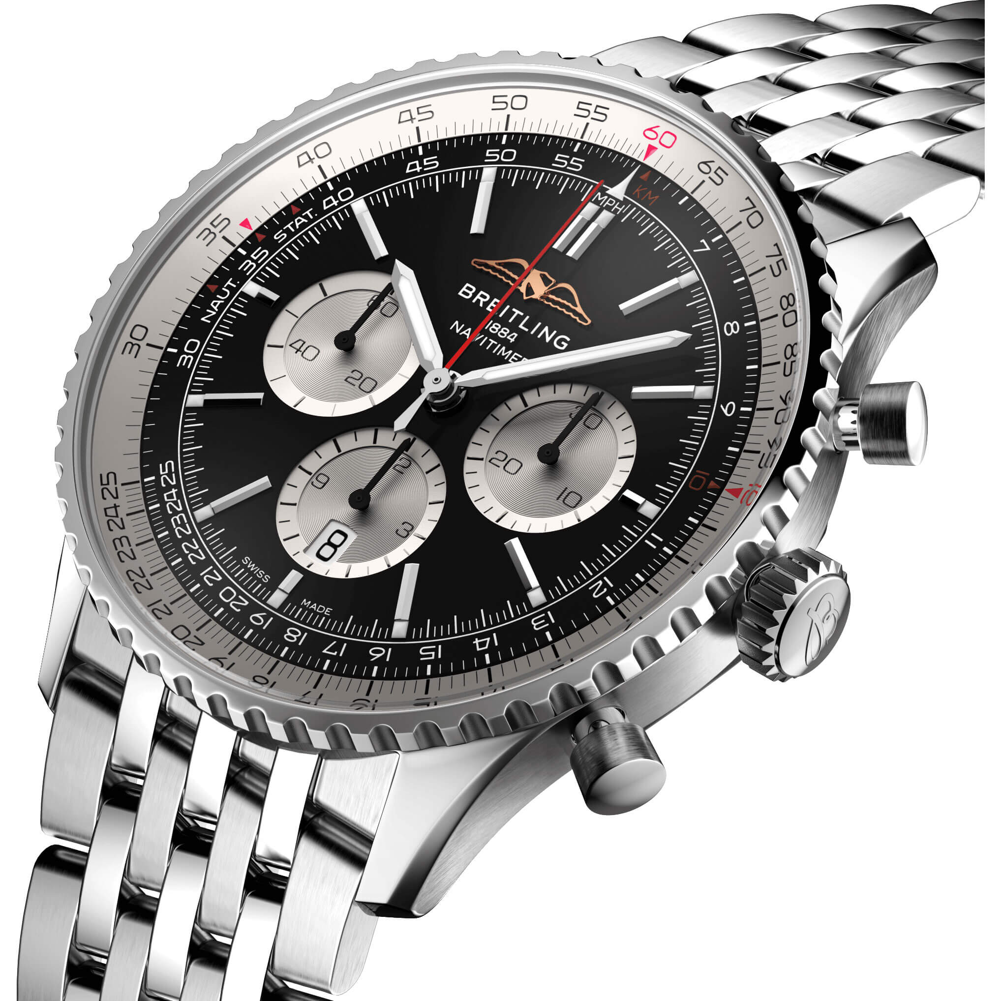 Bei der Schaffung der neuen Navitimer – hier in der Variante mit 46 mm Gehäuse aus Edelstahl mit Saphirglasboden, silbernem Metallarmband und schwarzem Zifferblatt – behielt Breitling die unverkennbaren Aspekte des Original-Designcodes der Legende bei. Aus einiger Entfernung ist sie unverkennbar eine Navitimer. Sie hat den kreisförmigen Rechenschieber, die stabförmigen Zeiger, die drei Chronographenzähler und die Lünette mit Griffmulden für einen guten Griff. Aber wenn man näherkommt, sieht man ganz deutlich ihre modernen Feinheiten. Ein abgeflachter Rechenschieber und ein gewölbtes Glas erzeugen den Eindruck eines kompakteren Profils. Polierte und gebürstete Finishes verleihen den Metallelementen ein hochwertiges, glänzendes, aber dennoch dezentes Aussehen. Eine schlankere Silhouette der Schwungmasse verbessert den Blick durch den offenen Gehäuseboden des COSC-zertifizierten Breitling-Manufakturkalibers 01. Dieses Uhrwerk ist mit einer fünfjährigen Garantie versehen, bietet ca. 70 Stunden Gangreserve und erlaubt es dem Träger, jederzeit das Datum zu ändern, das nun durch ein dezentes Fenster im Hilfszifferblatt bei 6 Uhr sichtbar ist. Die Uhr ist erhältlich in mehreren Grössen (46, 43 oder 41 mm), mit zwei verschiedenen Gehäusematerialien (Edelstahl oder 18-karätiges Rotgold) sowie mit einer Auswahl an Armbändern (seidenmattes Alligatorleder- oder siebenreihiges Metallarmband). Neue Farben in Blau-, Grün- und Kupfertönen betonen ihre modernen Zifferblattoptionen. Und wenn es ein Detail gibt, das für Nostalgie sorgen wird, dann sind es die AOPA-Flügel, die nun wieder dort sind, wo sie ursprünglich waren – bei 12 Uhr.