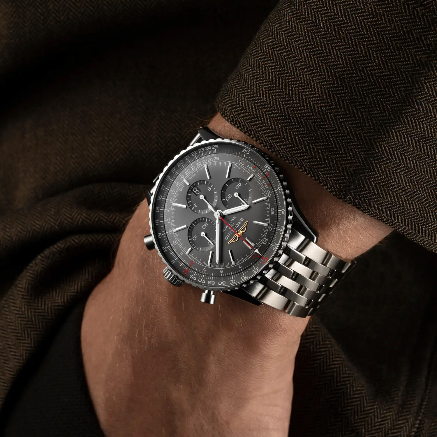 Die Navitimer B01 Chronograph 46 Germany Edition setzt ein markantes Statement: eine exklusiv für Deutschland entwickelte Sonderauflage mit einer Zifferblattfarbe, die es so noch nie gab. Das neue, tief anthrazitfarbene Blatt verleiht der legendären Navitimer einen modernen, charakterstarken Look – und bleibt ausschließlich dieser Edition vorbehalten. Limitiert auf nur 250 Exemplare, jeweils mit der Gravur „One of 250“ auf dem Gehäuseboden, richtet sich diese Uhr direkt an Sammlerinnen und Sammler, die das Besondere suchen. Mit dieser streng limitierten Edition führt Breitling die über 70-jährige Geschichte der Navitimer fort – und interpretiert eine Ikone auf zeitgemäße, exklusive Weise neu.- Durchmesser