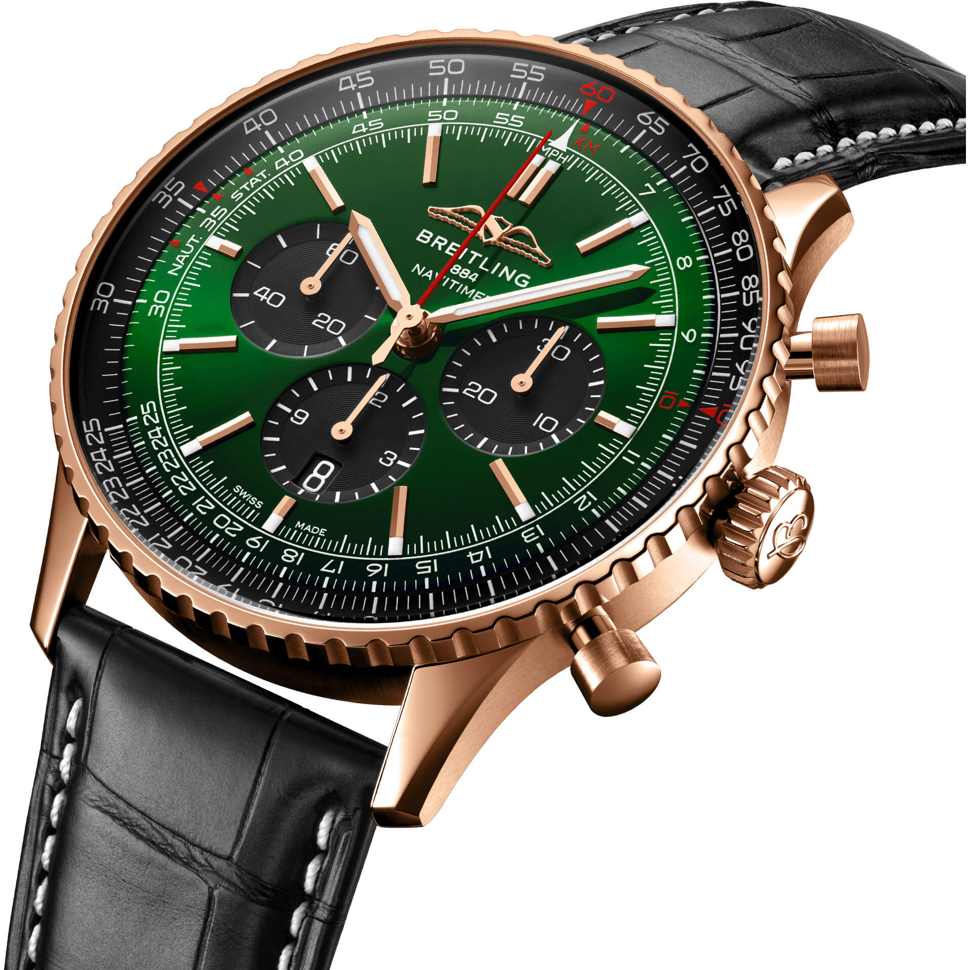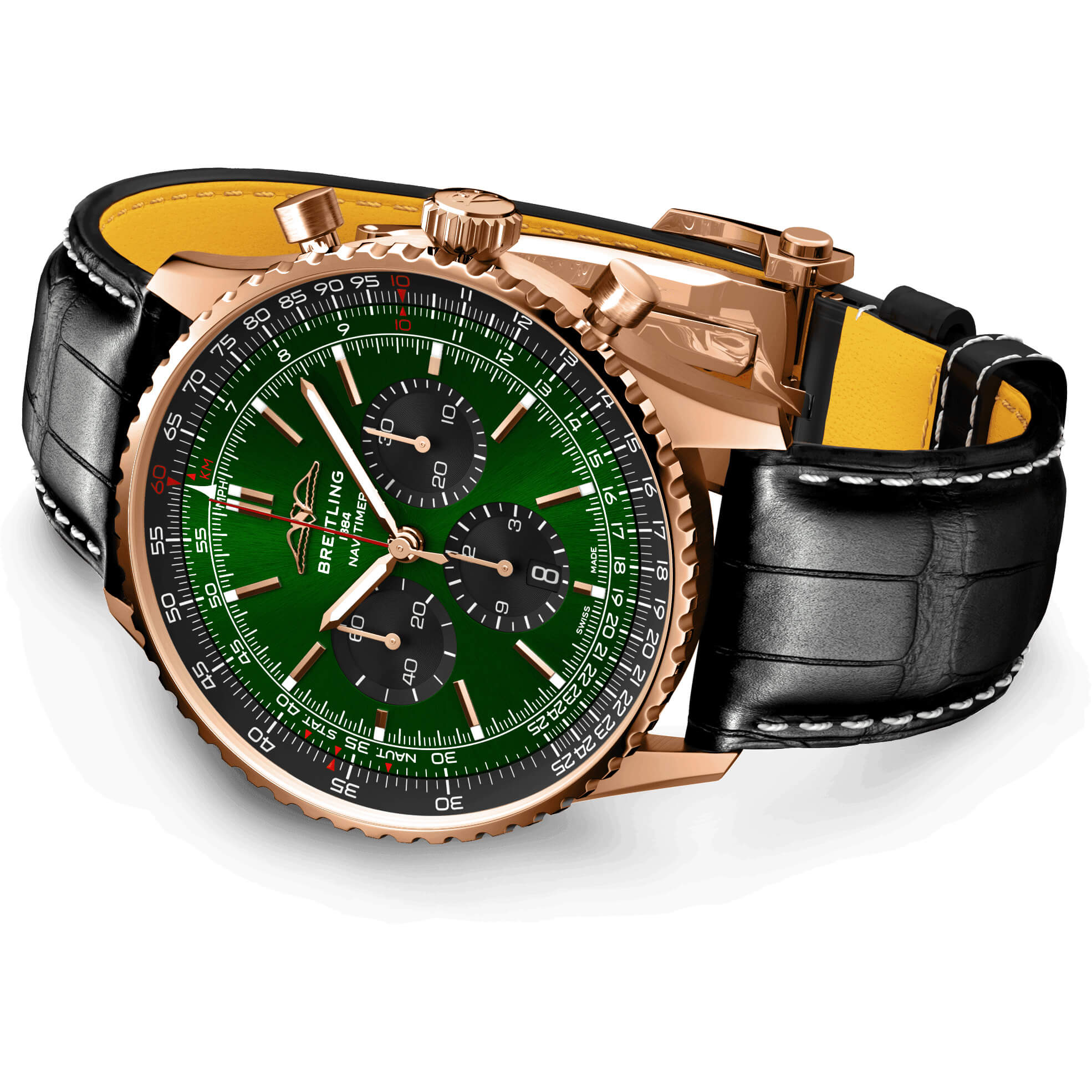 Der legendäre Fliegerchronograph von Breitling – für Ihre Reise. Im Jahr 1952 entwickelte Willy Breitling einen Chronographen mit einem kreisförmigen Rechenschieber, mit dem Piloten alle notwendigen Flugberechnungen durchführen konnten. Zwei Jahre später machte die renommierte amerikanische Vereinigung AOPA (Aircraft Owners and Pilots Association) diese Ausführung zu ihrem offiziellen Zeitmesser. Die «Navigation Timer» – oder Navitimer – war geboren. Die AOPA bleibt der größte Pilotenverein der Welt und zählt fast jeden US-Piloten zu seinen Mitgliedern. Als De-facto-Fliegeruhr während der glorreichen Ära der zivilen Luftfahrt wurde die Navitimer von Piloten und Flugbegeisterten gleichermaßen getragen. 1962 schaffte sie es am Handgelenk des Astronauten Scott Carpenter sogar ins Weltall. Doch nicht nur Piloten waren von der unverkennbaren Ästhetik der Uhr beeindruckt. Berühmtheiten wie Miles Davis oder Serge Gainsbourg gehörten ebenfalls zu ihren Fans und bewiesen damit, dass die Navitimer nicht nur stilvoll, sondern auch funktional war. Seit ihrer Markteinführung vor 70 Jahren wurden diverse Modelle dieser Breitling Ikone lanciert, doch diese neue Navitimer überzeugt mit ihren klassischen Eigenschaften, die mithilfe moderner Verbesserungen noch verfeinert wurden. Ein abgeflachter Rechenschieber und ein gewölbtes Glas schaffen den Eindruck eines schlankeren Profils. Der Wechsel von polierten und gebürsteten Metallelementen sorgt für ein schimmerndes und dennoch dezentes Aussehen. Es sind vor allem die neuen Farben in Blau-, Grün- und Kupfertönen, die die aktualisierten Zifferblattoptionen definieren. Und wenn es eine Neuerung gibt, die für Nostalgie sorgen wird, sind es die AOPA-Flügel, die nun wieder dort sind, wo sie ursprünglich waren – bei 12 Uhr. Seit bereits 70 Jahren erfreut sich die Original-Fliegeruhr großer Beliebtheit bei Piloten und Trendsettern gleichermaßen. Getragen von Astronauten im Weltraum und von den größten Stars der Welt, handelt es sich um den legendärsten Zeitmesser von Breitling und um eine der unverwechselbarsten Uhren aller Zeiten.- Durchmesser