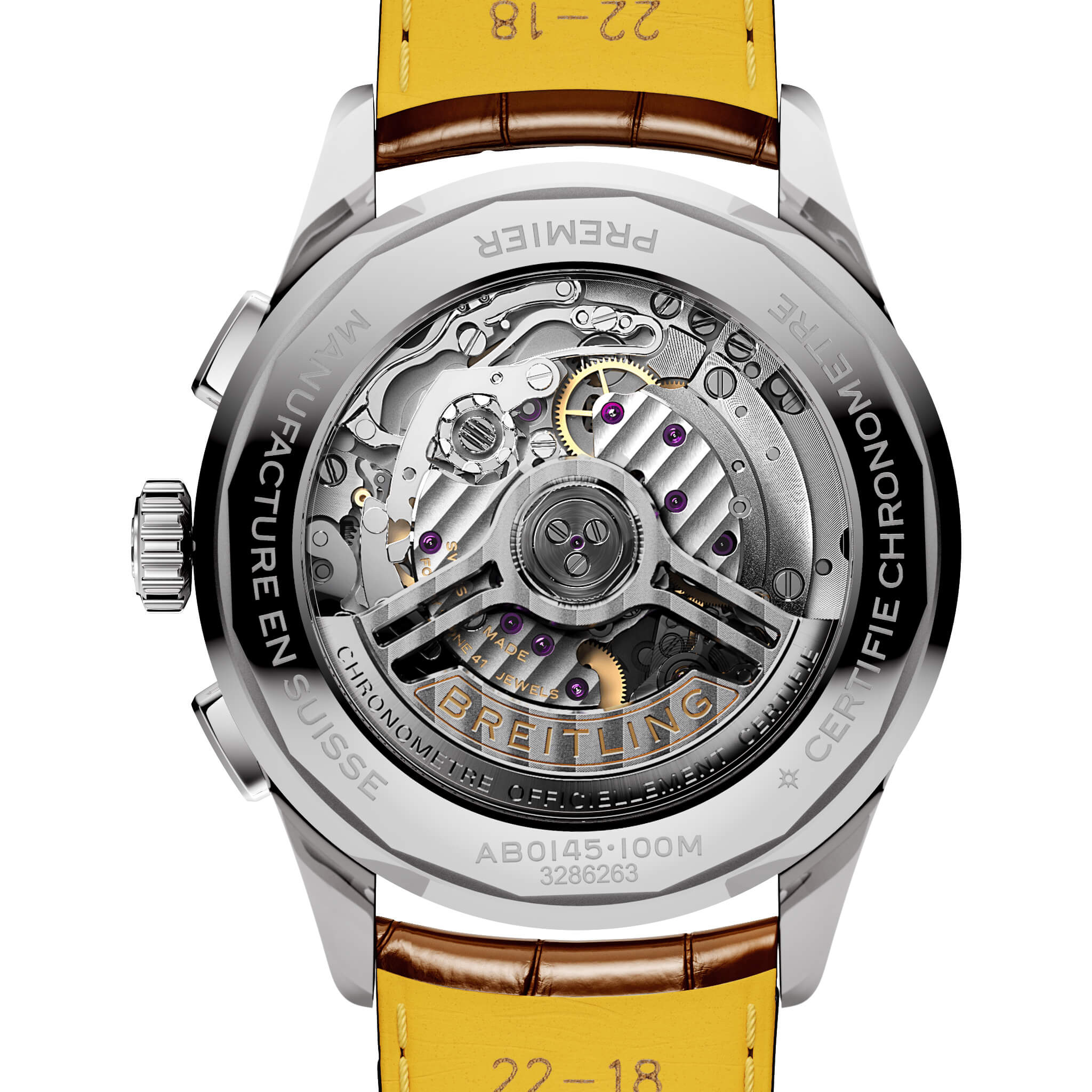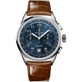 Die neue, moderne Premier mit braunem Alligatorlederband und dunkelblauem Zifferblatt: Breitling behielt die charakteristischen Details der alten Premier bei, darunter die glatte feste Lünette, das Zifferblatt mit zwei Hilfszifferblättern, die stromlinienförmigen rechteckigen Drücker und die applizierten arabischen Ziffern.- Durchmesser