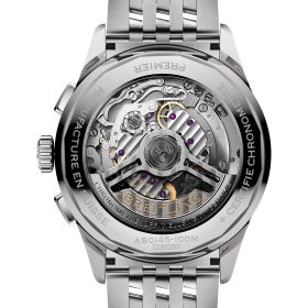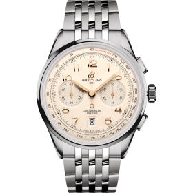 Die neue, moderne Premier mit Edelstahlband und cremefarbenem Zifferblatt: Breitling behielt die charakteristischen Details der alten Premier bei, darunter die glatte feste Lünette, das Zifferblatt mit zwei Hilfszifferblättern, die stromlinienförmigen rechteckigen Drücker und die applizierten arabischen Ziffern.- Durchmesser