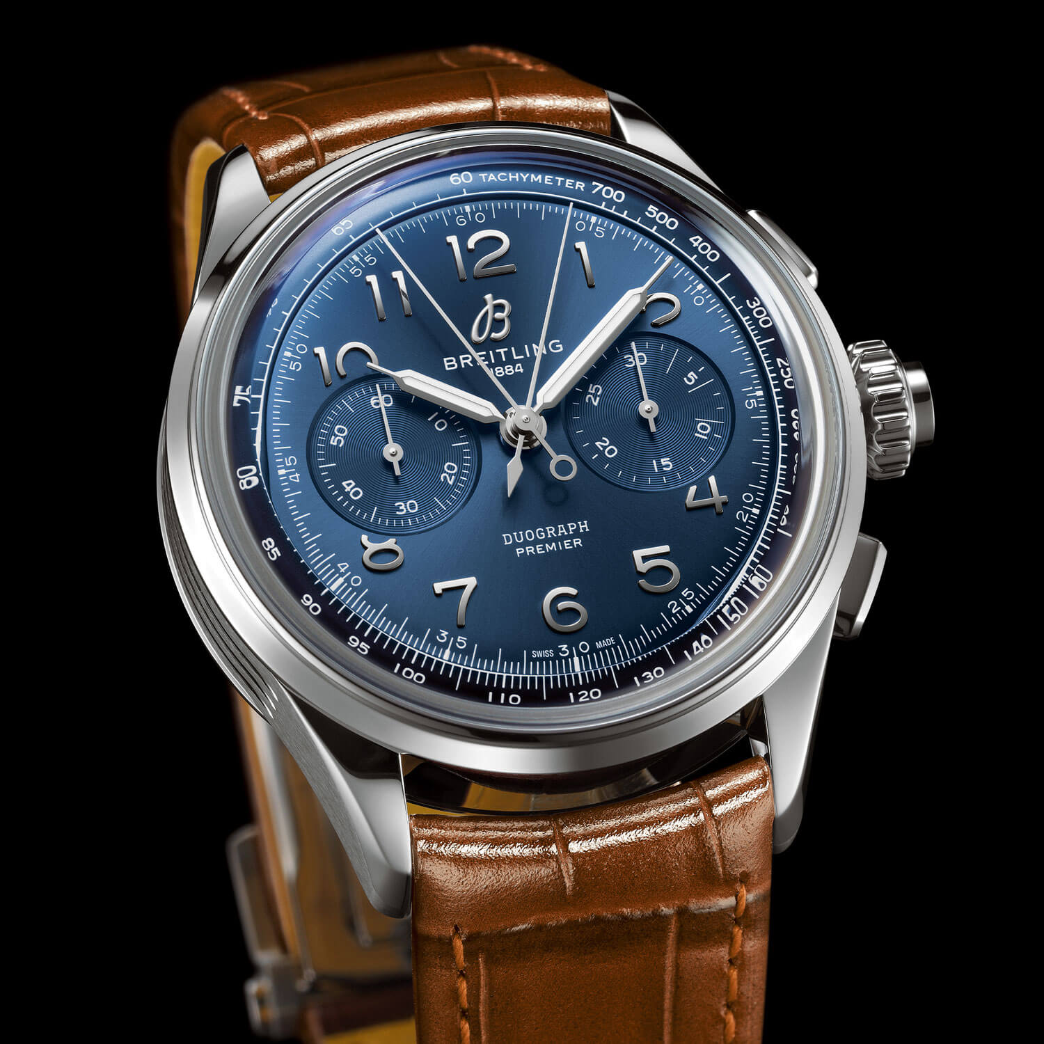 Breitling Premier Duograph - 42 mm Gehäuse aus Edelstahl mit einem blauen Zifferblatt. Breitling Manufakturkaliber B15 Handaufzug mit 70 Stunden Gangreserve. Goldbraunes Alligator-Lederarmband mit Faltschließe.Produktspezifikationen