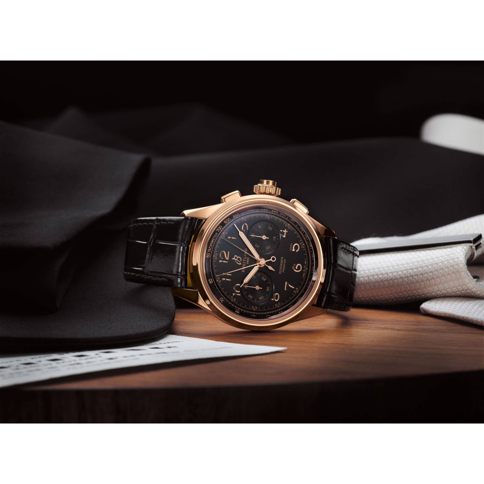 Breitling Premier Duograph - 42 mm Gehäuse aus Rotgold mit einem schwarzen Zifferblatt. Breitling Manufakturkaliber B15 Handaufzug mit 70 Stunden Gangreserve. Braunes Alligator-Lederarmband mit Faltschließe.- Durchmesser