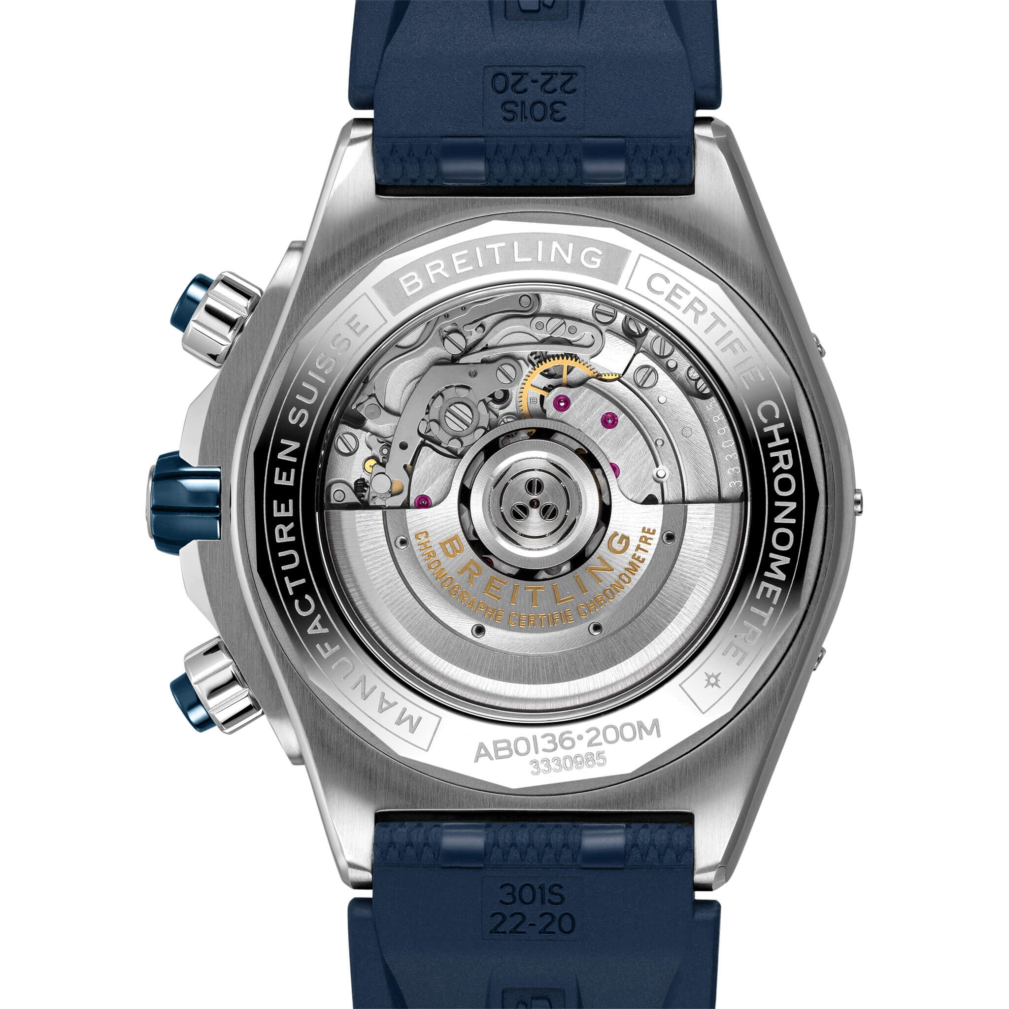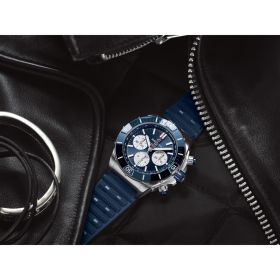 Die neue Super Chronomat: Eine universell einsetzbare Sportuhr mit Extra-Power: Breitling Super Chronomat B01 44 am Kautschukarmband mit Faltschließe. Blaues Zifferblatt & Lünette. Wasserdichte 20 Bar/200 Meter. Breitling Manufakturkaliber 01 Standard Automatik. Die Super Chronomat ist Breitlings bisher kühnste Chronomat – die ultimative Wahl für alle, die einen Zeitmesser suchen, der die perfekte Balance zwischen Robustheit und Stil beherrscht.