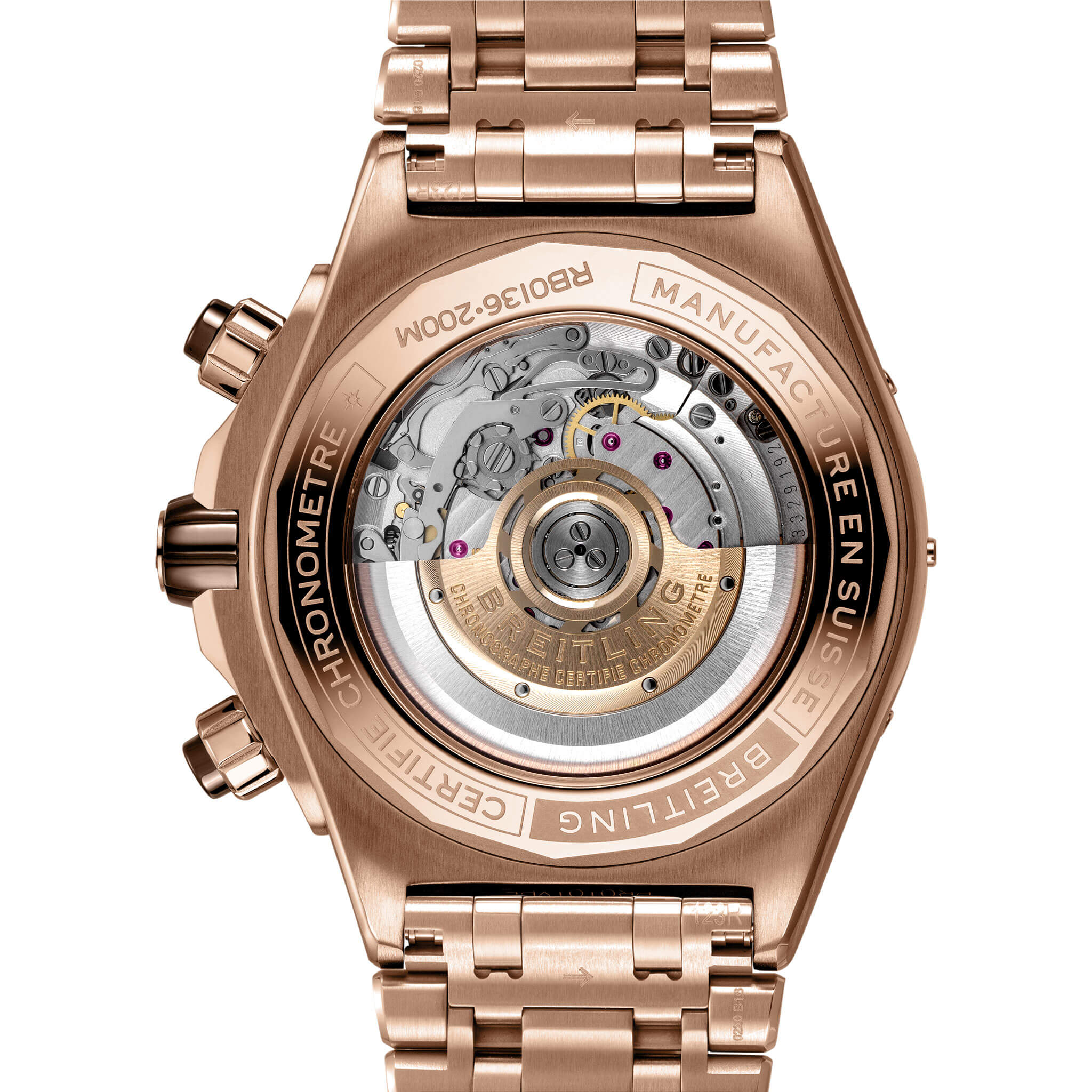 Die neue Super Chronomat: Eine universell einsetzbare Sportuhr mit Extra-Power: Breitling Super Chronomat B01 44 am Roleaux-Armband aus Rotgold mit Faltschließe. Automatikwerk Breitling Manufakturkaliber 01. Wasserdichte 20 Bar/200 Meter. Braunes Zifferblatt. Die Super Chronomat ist Breitlings bisher kühnste Chronomat – die ultimative Wahl für alle, die einen Zeitmesser suchen, der die perfekte Balance zwischen Robustheit und Stil beherrscht.