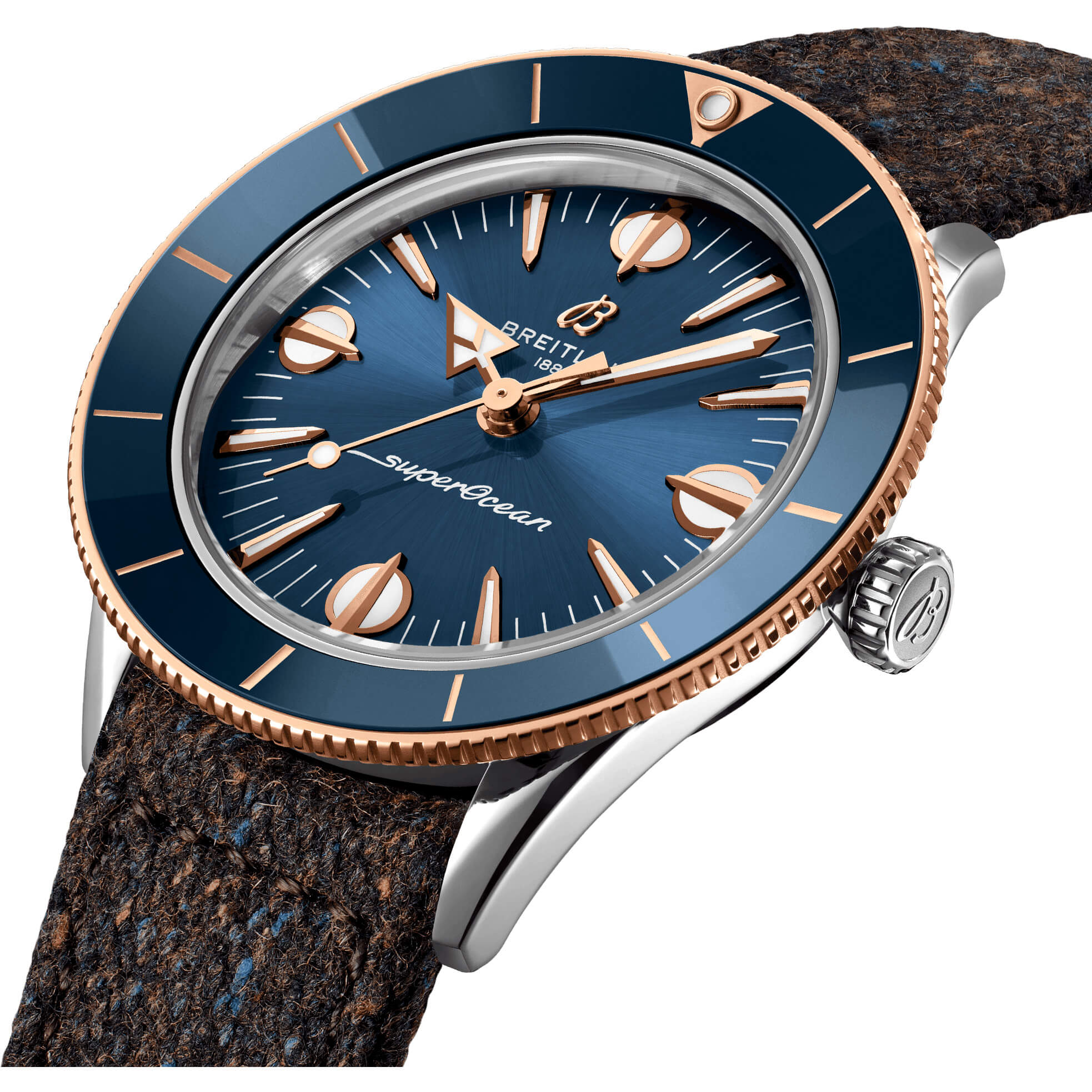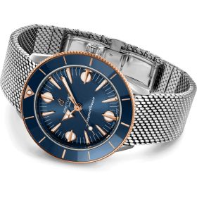 Die Träger der Superocean Taucheruhr der 1950er-Jahre von Breitling waren sowohl an Land als auch auf dem Wasser bestens gestylt. Die neue Superocean Heritage ’57 Highlands Kollektion lädt Breitling-Fans nun zu einem neuen Abenteuer an der Küste ein: Entdecken Sie die felsigen Küsten und nebligen Gipfel der schottischen Highlands. Mit einem Durchmesser von 38 mm präsentiert die Uhr ein Ziffernblatt in lebhaften Erdtönen wie Beige, Grün, Senffarben und Blau. Inspiriert von ihrem Vintage Superocean-Vorgänger greift die Uhr verschiedene Designelemente des Originals von 1957 auf, darunter die konkave Keramiklünette, die übergroßen Indizes und den pfeilförmigen Stundenzeiger. Als unverkennbares schottisches Detail verfügt sie über ein Tweed-inspiriertes Textilarmband aus einer luxuriösen Mischung aus Seide und Wolle. Alle Uhren sind mit einem geflochtenen Metallarmband erhältlich, und das zusätzliche Textilarmband wird in einem separaten Etui geliefert, komplett mit einem Federstegwerkzeug für einen einfachen Armbandwechsel. Egal, ob Sie an einer zerklüfteten Felsküste spazieren gehen, Zuflucht in einem Landgasthaus suchen oder einfach durch Ihren Alltag navigieren: Mit der Superocean Heritage ’57 Highlands Capsule-Kollektion trotzen Sie den Elementen und bleiben dabei top gestylt.- Durchmesser
