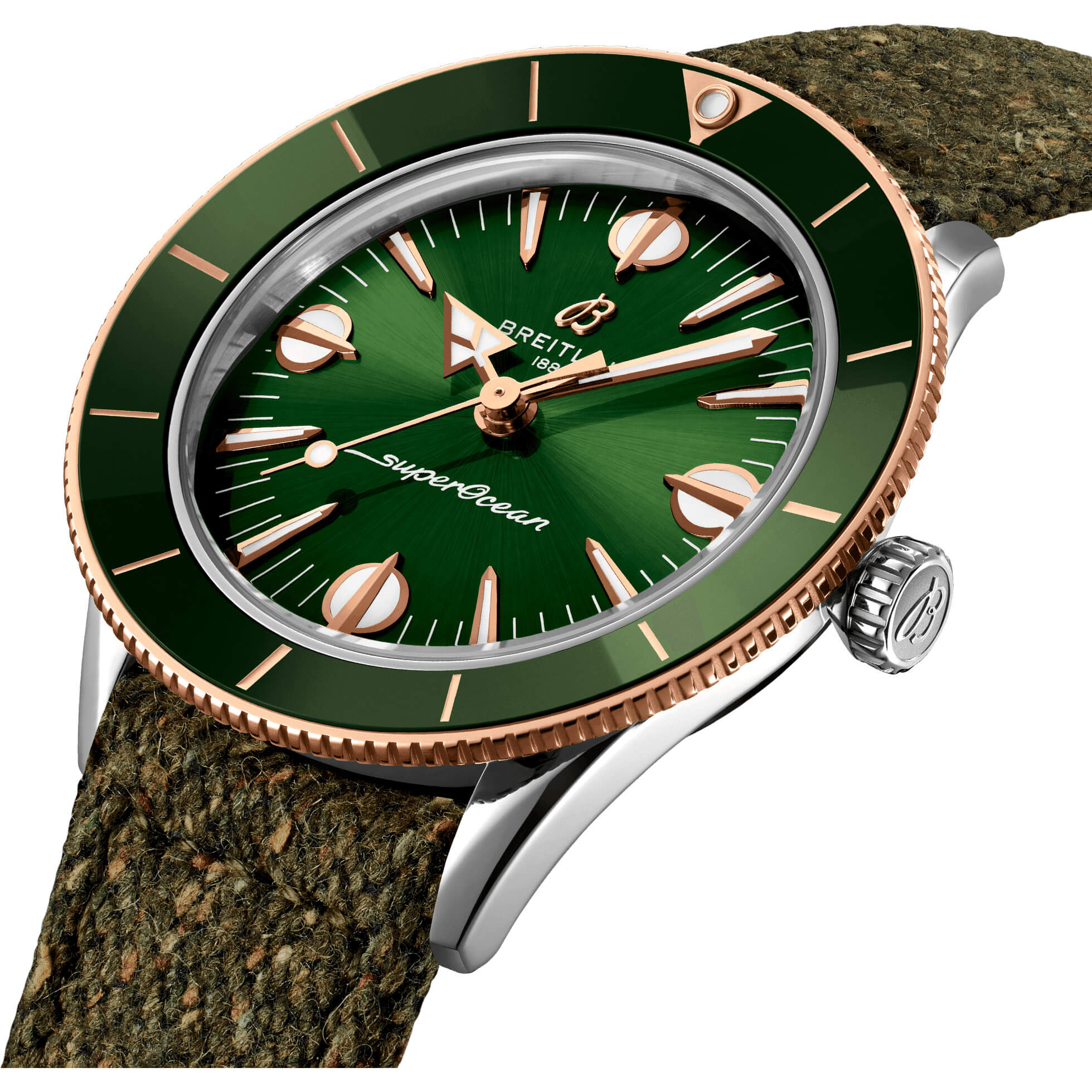 Die Träger der Superocean Taucheruhr der 1950er-Jahre von Breitling waren sowohl an Land als auch auf dem Wasser bestens gestylt. Die neue Superocean Heritage ’57 Highlands Kollektion lädt Breitling-Fans nun zu einem neuen Abenteuer an der Küste ein: Entdecken Sie die felsigen Küsten und nebligen Gipfel der schottischen Highlands. Mit einem Durchmesser von 38 mm präsentiert die Uhr ein Ziffernblatt in lebhaften Erdtönen wie Beige, Grün, Senffarben und Blau. Inspiriert von ihrem Vintage Superocean-Vorgänger greift die Uhr verschiedene Designelemente des Originals von 1957 auf, darunter die konkave Keramiklünette, die übergroßen Indizes und den pfeilförmigen Stundenzeiger. Als unverkennbares schottisches Detail verfügt sie über ein Tweed-inspiriertes Textilarmband aus einer luxuriösen Mischung aus Seide und Wolle. Alle Uhren sind mit einem geflochtenen Metallarmband erhältlich, und das zusätzliche Textilarmband wird in einem separaten Etui geliefert, komplett mit einem Federstegwerkzeug für einen einfachen Armbandwechsel. Egal, ob Sie an einer zerklüfteten Felsküste spazieren gehen, Zuflucht in einem Landgasthaus suchen oder einfach durch Ihren Alltag navigieren: Mit der Superocean Heritage ’57 Highlands Capsule-Kollektion trotzen Sie den Elementen und bleiben dabei top gestylt.- Durchmesser