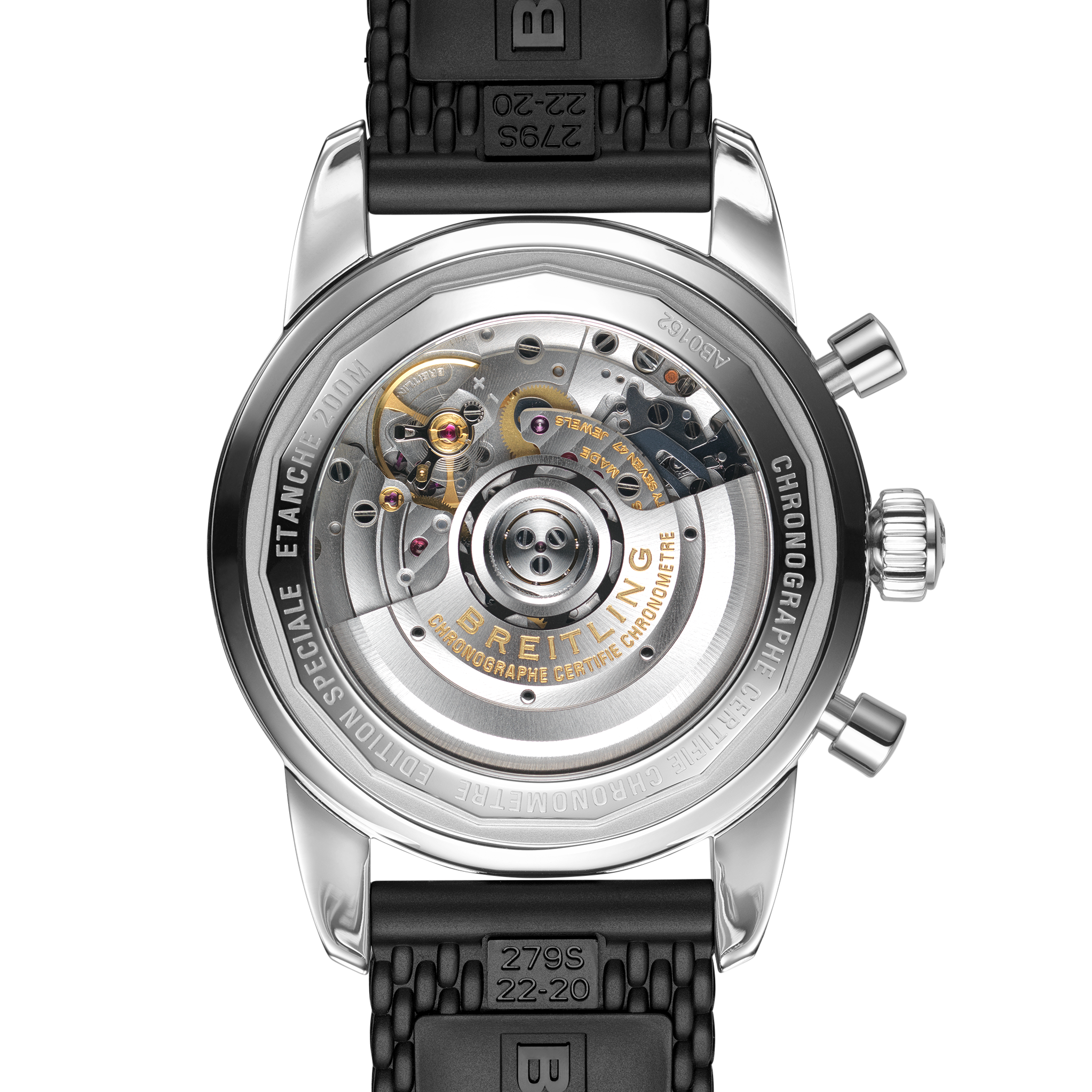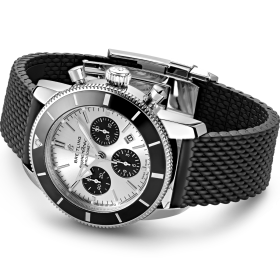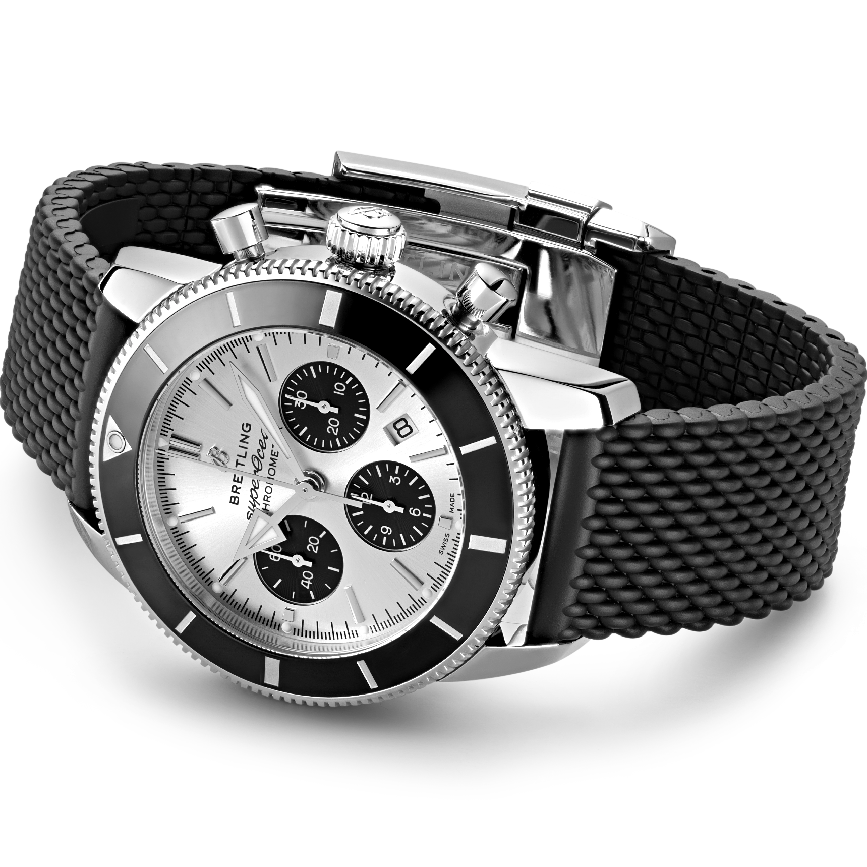 SUPEROCEAN HÉRITAGE II B01 CHRONOGRAPH 44, Gehäuse: Stahl, Aero-Classic Kautschukband, Krone: Verschraubt, 2 Dichtungen, Lünette: Einseitig drehbar mit Sperre- Durchmesser