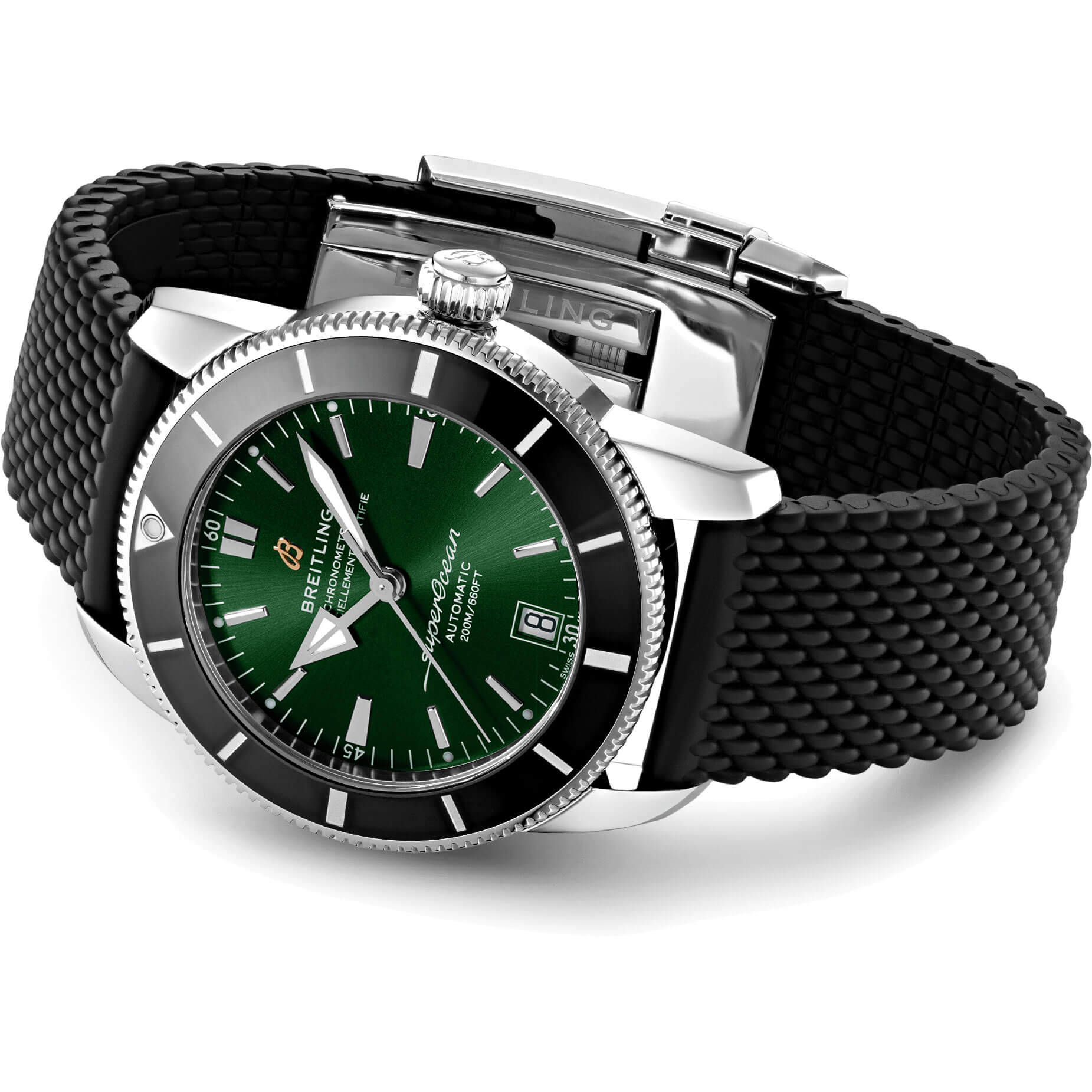 Inspiriert von der Original-SuperOcean aus den 1950er-Jahren kombiniert die Superocean Heritage die legendären Designmerkmale mit modernem Flair. «Modisch zu Wasser» lautet das Credo der Superocean Heritage, dem sie mit ihrem sportlich-eleganten Look alle Ehre macht. Die legendären dreieckigen Zeiger und die einseitig drehbare Lünette mit poliertem Keramikring machen die Superocean Heritage zu einer eleganten Taucheruhr. Die Superocean Heritage B20 Automatic in Edelstahl wird mit einem grünen Zifferblatt kombiniert. Präsentiert wird diese Superocean Heritage auf einem geflochtenen Kautschukarmband mit Faltschließe. Für den Antrieb ist das Breitling-Manufakturkaliber B20 zuständig, ein COSC-zertifizierter Chronometer, der auf Tudors Manufakturkaliber MT5612 basiert.- Durchmesser