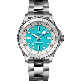 Abgesehen davon, dass sie gut aussieht, ist die neue Superocean auch ein technisches Wunderwerk. Breite Zeiger und Indexe, die mit lumineszierendem Super-LumiNova® beschichtet sind, ermöglichen eine hervorragende Ablesbarkeit unter Wasser. Mit einer Wasserdichtigkeit von 300 Metern (30 Bar) verdreifacht diese Uhr die Mindestanforderung für Taucheruhren. Diese 36 mm-Version der Superocean Automatic erscheint in sommerlicher Farbgebung mit einem türkisfarbenen Zifferblatt und einem Metallarmband, welches über eine Faltschließe verfügt, die Mikroanpassungen von bis zu 15 mm ermöglicht, um das Tragen über z. B. Taucheranzügen zu erleichtern. Die kratzfeste mit Keramik eingelegte Lünette der Superocean wird niemals verschleißen oder verblassen. Aus Sicherheitsgründen ist die Lünette bei der 36-, 42- und 44-mm Version unidirektional drehbar. Die Uhr ist außerdem stoß-, sand- und salzwasserfest. Das automatische Breitling-Kaliber 17 erscheint mit einer zweijährigen Garantie und einer Gangreserve von ca. 38 Stunden. Wie bei allen Redesigns von Breitling gleicht die neue Superocean die Nostalgie ihrer Linie perfekt mit einem frischen neuen Look aus. Bei diesem Design ist für jeden etwas dabei. Sammler werden den starken Einfluss der Zeitlupe erkennen, Wassersportbegeisterte werden ihre technischen Eigenschaften zu schätzen wissen und Stilbewusste werden sich für ihre Vielseitigkeit von Tag zu Nacht, Strand und Konferenzraum interessieren.