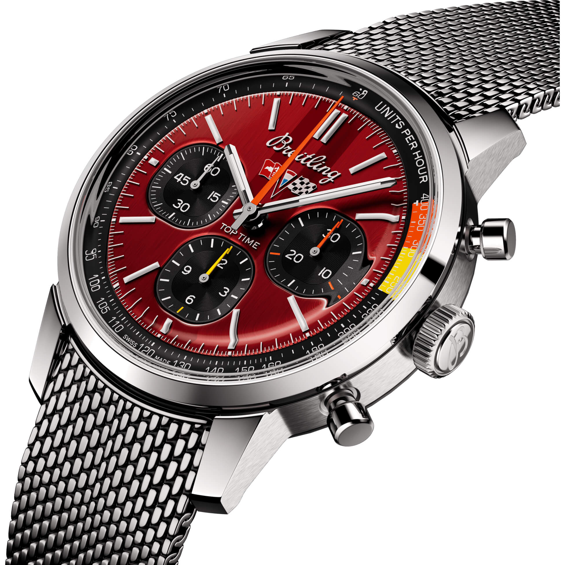 Die Top Time mit rotem Zifferblatt und klassischem Milanaise Armband wurde inspiriert von der Chevrolet Corvette. Die Chevrolet Corvette der zweiten Generation aus den Modelljahren 1963 bis 1967 ist die begehrteste Version der amerikanischen Legende.- Durchmesser