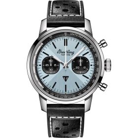 Ab sofort mit einem Durchmesser von 41mm und trendigem, eisblauem Zifferblatt: Die Breitling Top Time B01 Triumph. Das Highlight dieser in Zusammenarbeit mit der britischen Motorradmarke Triumph entstandenen Uhr ist ihr eisblaues Zifferblatt. Dieser einzigartige Farbton hat zwei grosse Vorgänger zum Vorbild: eine blaue Triumph Thunderbird 6T von 1951 und eine seltene eisblaue Breitling Top Time Ref. 815 aus den 1970er-Jahren. Sammler werden sicher noch einige andere Anspielungen auf die alte Breitling entdecken, darunter ein Retro-Logo, pilzförmige Chronographendrücker und ein Zifferblatt im «Zorro»-Design.- Durchmesser