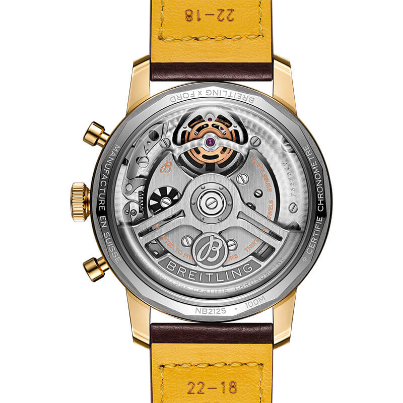 Die 1960er Jahre waren ein Jahrzehnt der Experimente, des Spaßes, der Freiheit und der Energie. Ob auf einem Motorrad oder in einem Sportwagen, das Leben war in vollem Gange. Willy Breitling spürte diesen Tempowechsel und entwarf einen unkonventionellen Chronographen, um den Schwung der Zeit einzufangen. Er nannte ihn Top Time, und diese temperamentvolle Tradition wird bis heute fortgesetzt. Breitling arbeitet bei der Gestaltung der Top Time mit einigen der coolsten Namen der Automobilbranche zusammen. Der Ford Mustang der ersten Generation, produziert von 1964 bis 1974, war das Auto der Wahl im hippen Amerika der 1960er Jahre. Die Top Time B21 Ford Mustang ist eine Hommage an dieses legendäre Modell. Mit den Farben ihres klassischen Vorbilds, einem perforierten Lederarmband, einer Tachymeterskala zur Geschwindigkeitsmessung und kontrastierenden "Squircle"-Ziffernblättern, die an klassische Armaturenbrettanzeigen erinnern, verkörpert sie den freilaufenden Geist der Sechzigerjahre. Im Inneren des Gehäuses aus Bronze und Titan arbeitet stolz der außergewöhnliche Chronograph Tourbillon B21 von La Joux-Perret.- Durchmesser