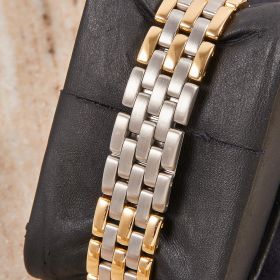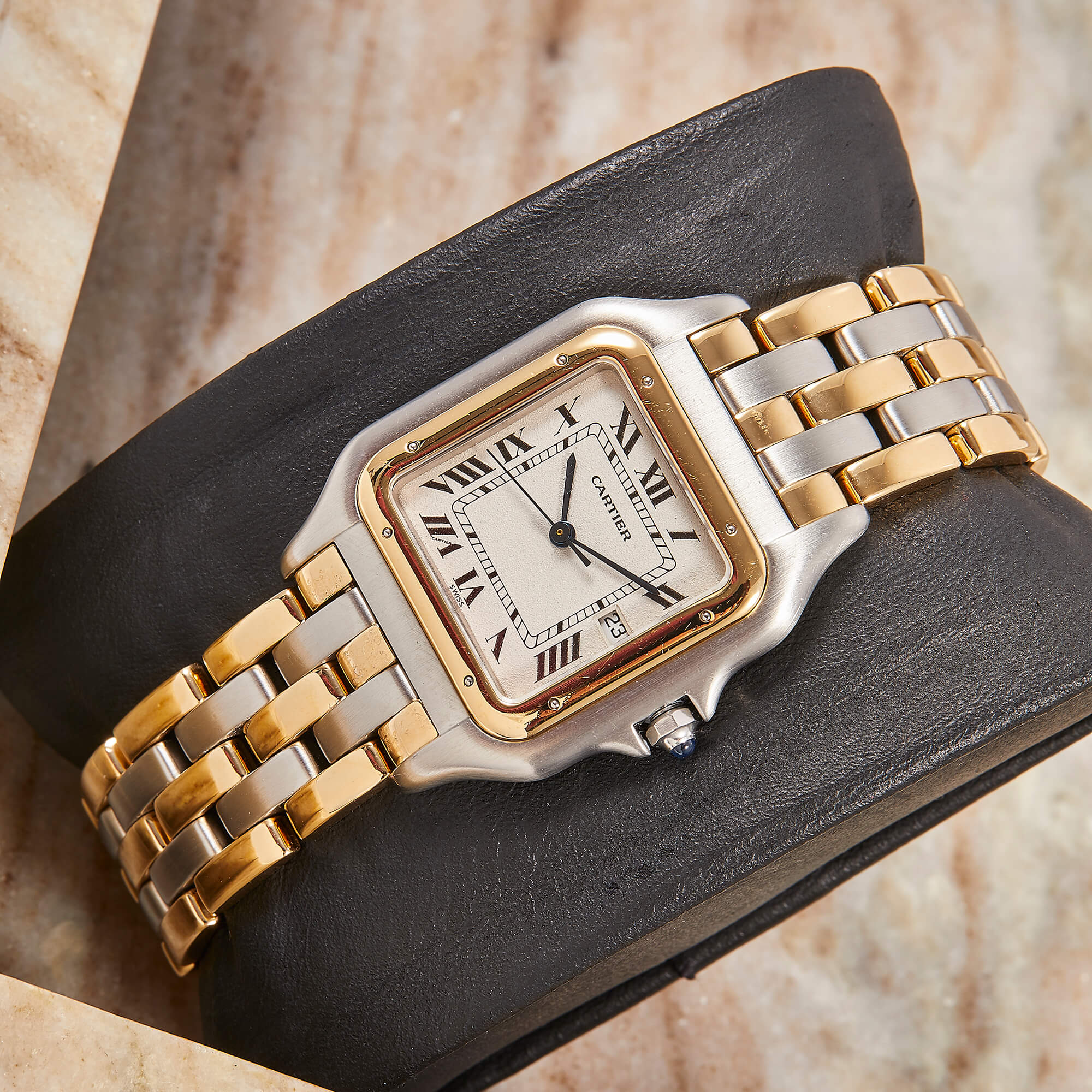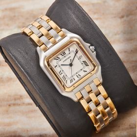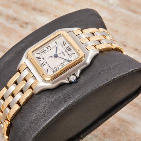Die Cartier Panthère Referenz 183957 ist eine ikonische Damenuhr, die Eleganz und zeitloses Design verkörpert. Dieses Exemplar kommt im schönen Zustand mit Stahl-Gold-Band in zweistreifiger Ausführung.- Durchmesser