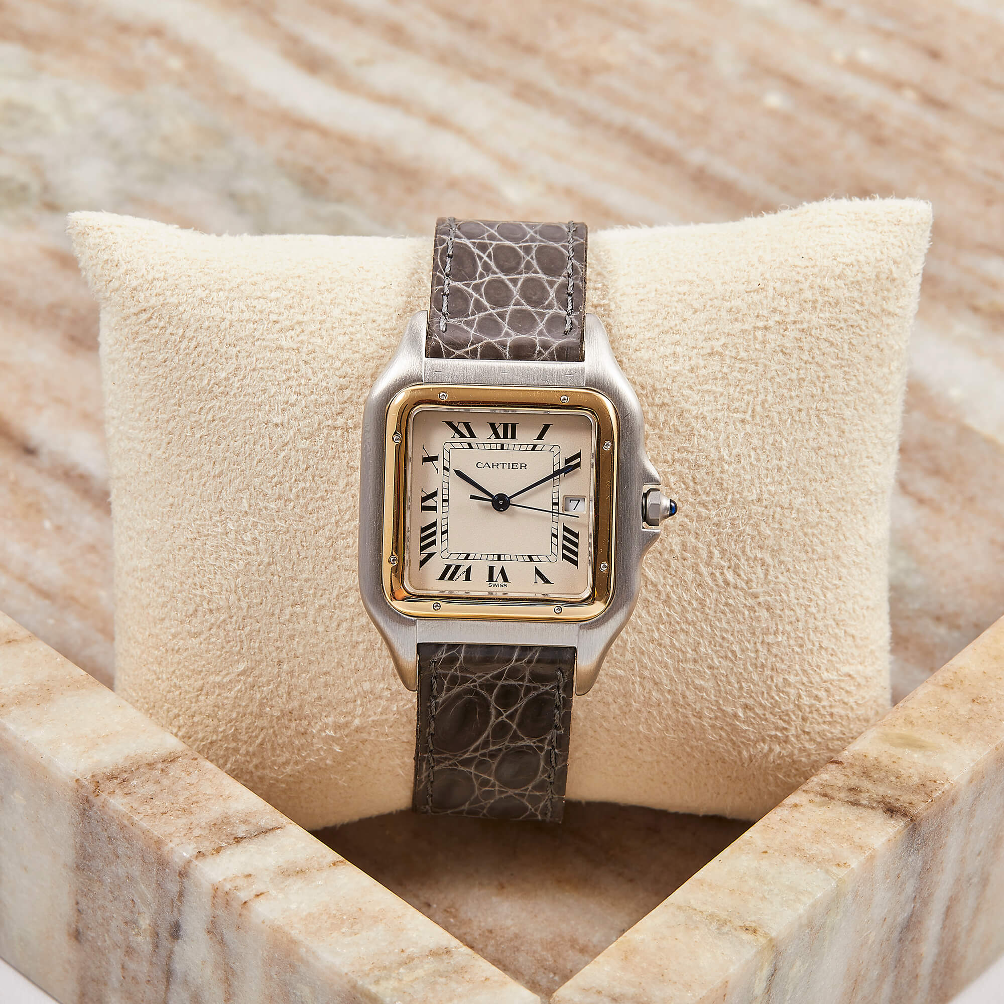 Die Cartier Panthère Ref. 187957 ist eine elegante Armbanduhr, die durch ihr unverwechselbares Design begeistert. Sie verfügt über ein Lederband und ein klassisches quadratisches Gehäuse. Die Uhr kombiniert klassische Eleganz mit einer edlen, femininen Ausstrahlung, die typisch für die Panthère-Kollektion von Cartier ist. Originale Papiere und sämtliche Servicenachweise.- Durchmesser