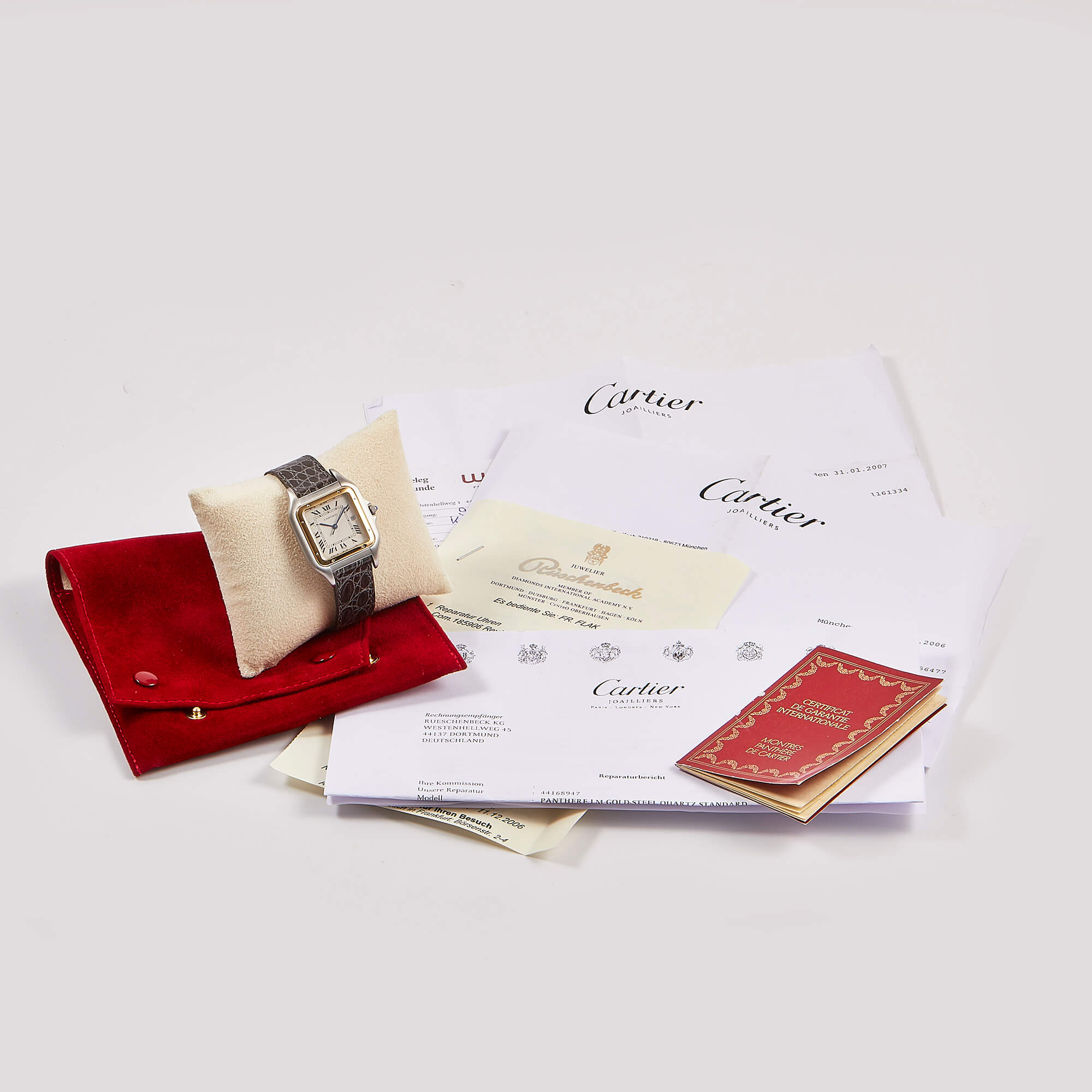 Rüschenbeck-Zertifikat (2 Jahre Garantie) - Anmerkung Inklusive 2 Cartier Servicenachweisen mit Rechnungen von 2006 & 2007. Außerdem erhielt diese Uhr nun eine frische Revision beim Hersteller.