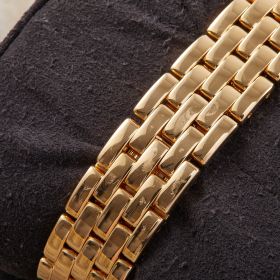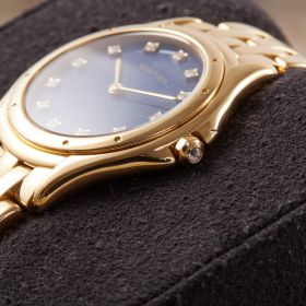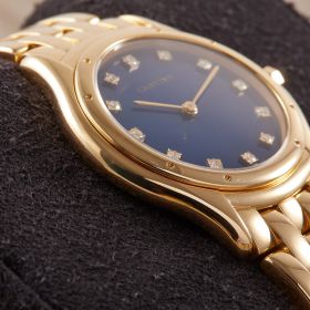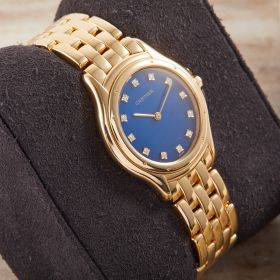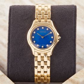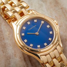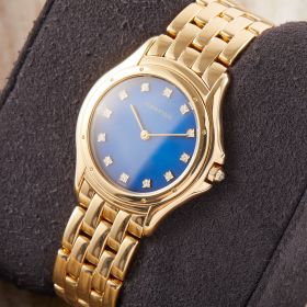 Die Cartier Panthère Cougar mit der Referenz 887905 ist ein elegantes Schmuckstück in Uhrform – gefertigt aus 18 Karat Gelbgold, inklusive passendem Goldband. Besonders hervorzuheben ist das seltene blaue Zifferblatt mit sanftem Farbverlauf, das je nach Lichteinfall unterschiedlich schimmert. Ein weiteres Highlight sind die funkelnden Diamantindizes, die der Uhr eine luxuriöse und zugleich raffinierte Ausstrahlung verleihen. Ein seltenes Modell mit außergewöhnlicher Präsenz.