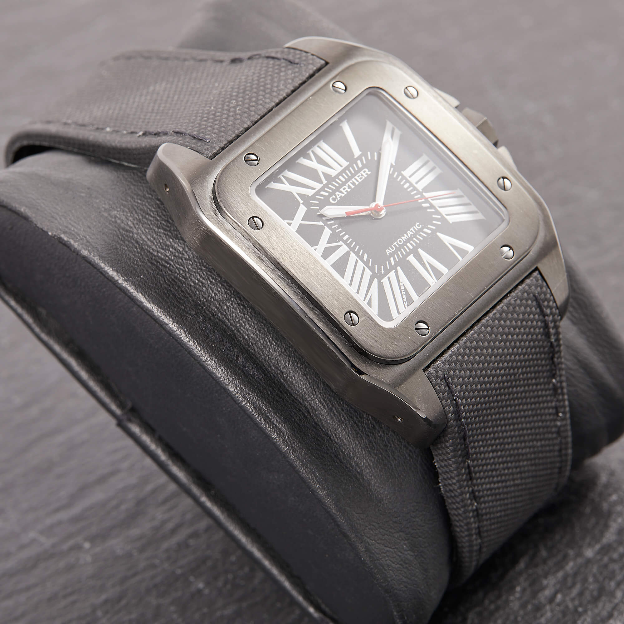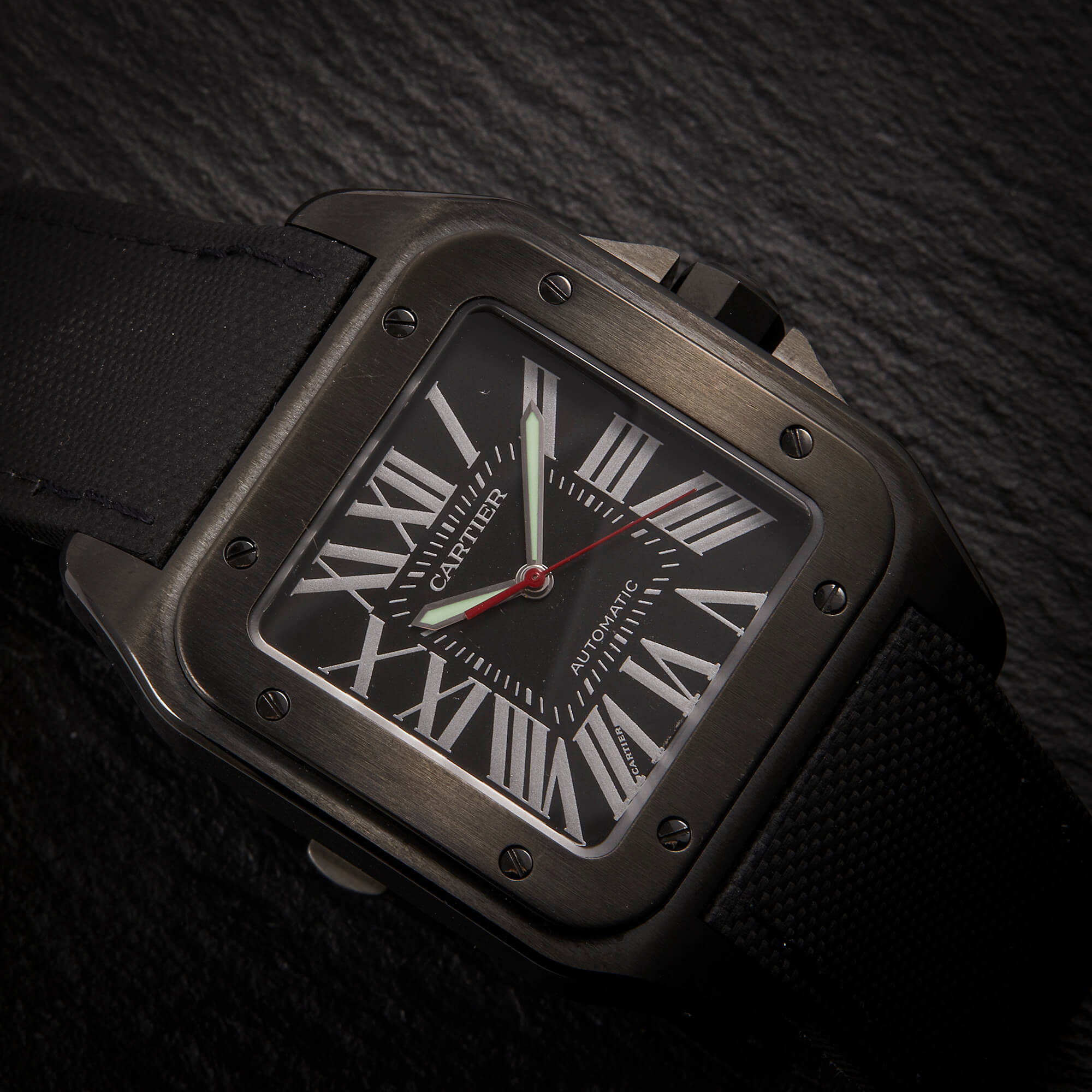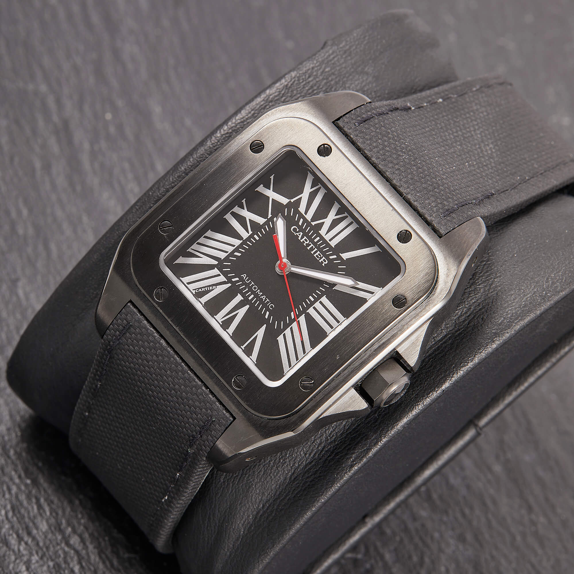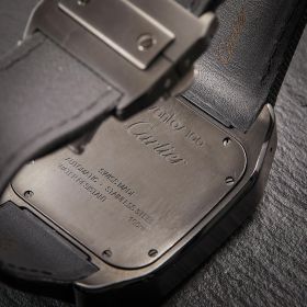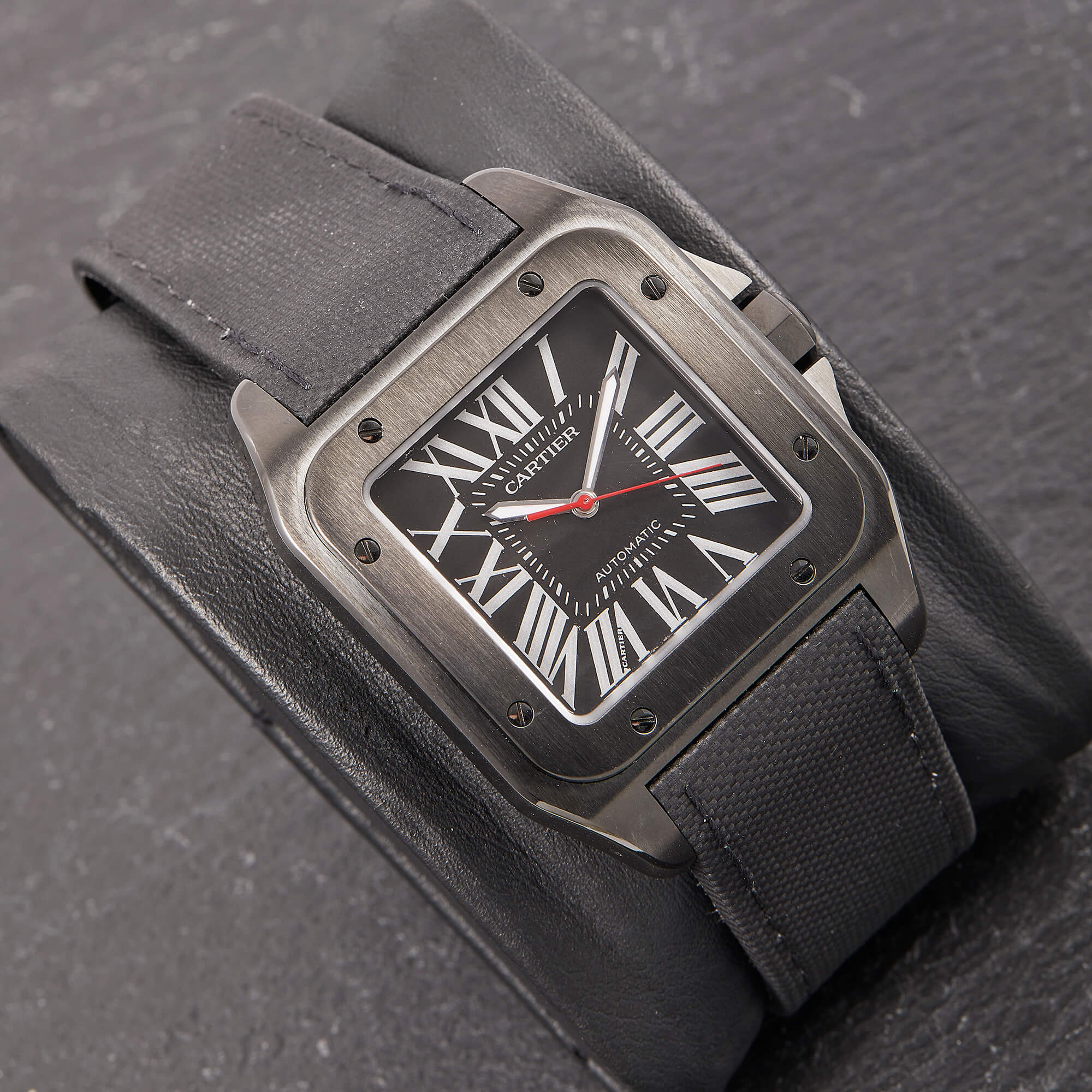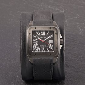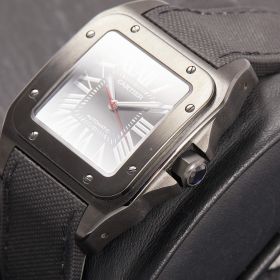 Die Cartier Santos 100 Referenz 3774 besticht durch ihr markantes, sportlich-elegantes Design und das ikonische Santos-Gehäuse. Die schwarze DLC-Beschichtung verleiht der Uhr eine besonders moderne, kraftvolle Ausstrahlung und unterstreicht ihren maskulinen Charakter. Eine ausdrucksstarke Santos-Variante, die klassische Cartier-DNA mit zeitgemäßer Optik verbindet.- Durchmesser