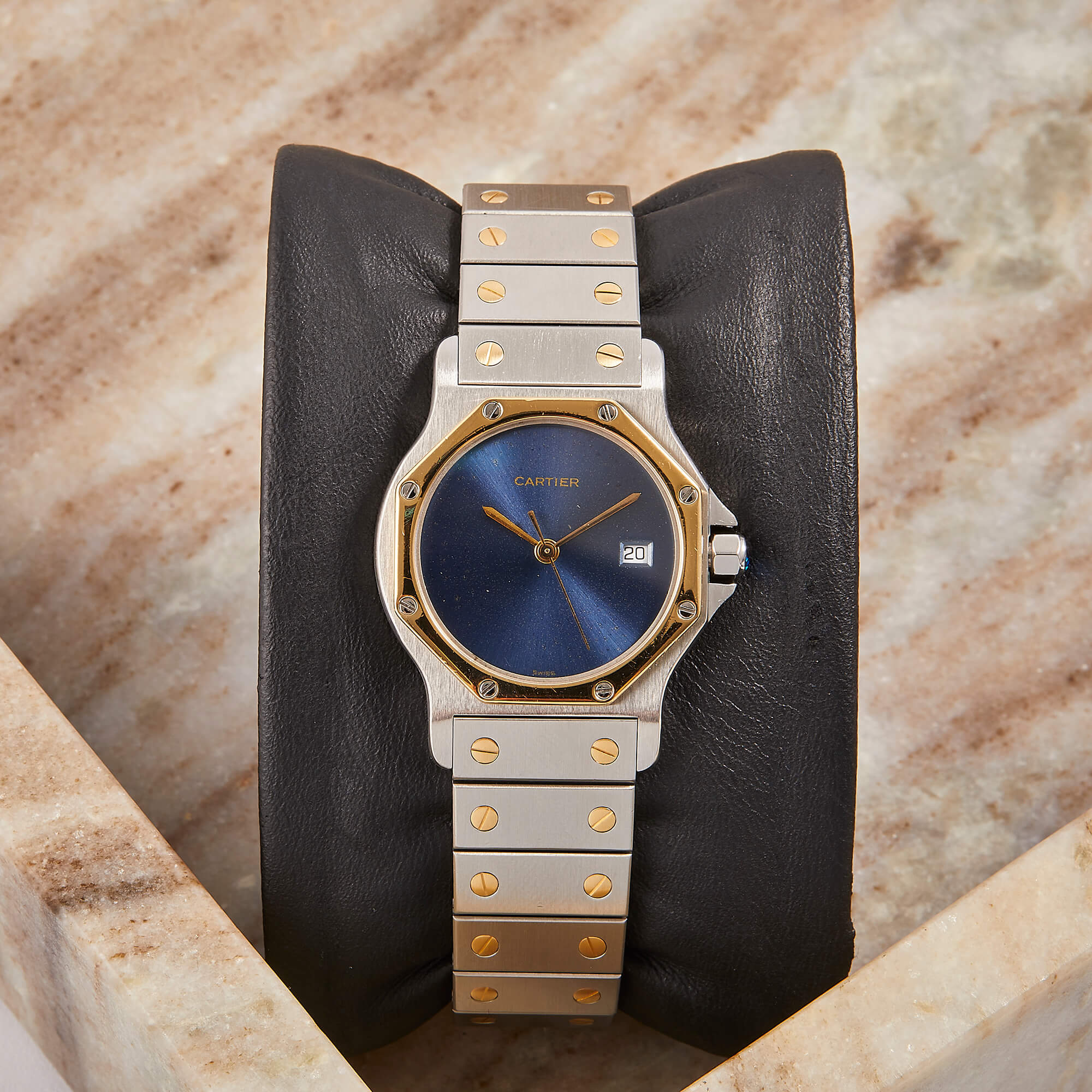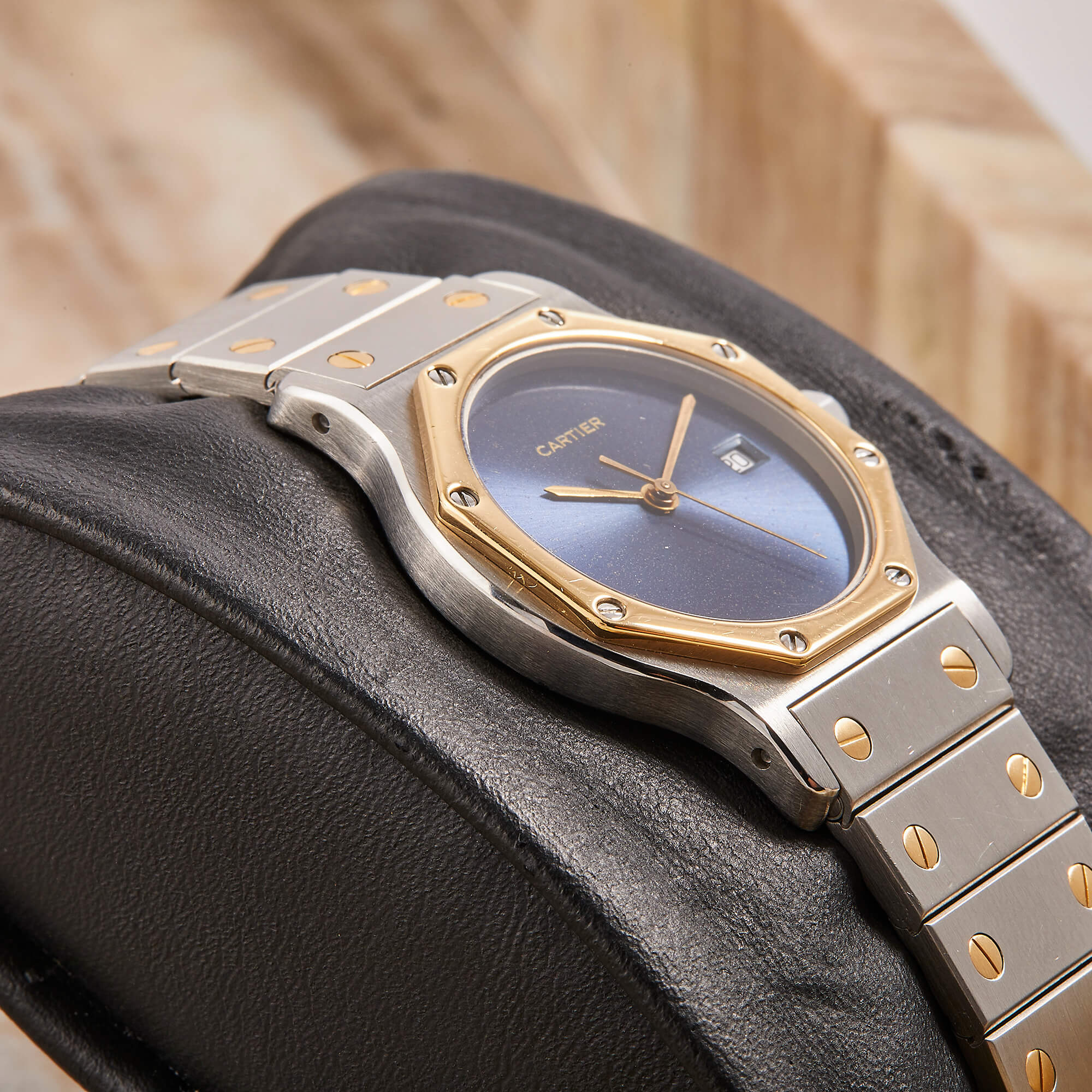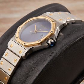 Die Cartier Santos Octagon Referenz 187902 in Stahl-Gold besticht durch ihr markantes oktogonales Gehäuse und das seltene blaue Zifferblatt. Die Uhr vereint klassische Cartier-Ästhetik mit exklusiver Ausstrahlung und befindet sich in gepflegtem Zustand, ideal für Liebhaber charaktervoller Zeitmesser.