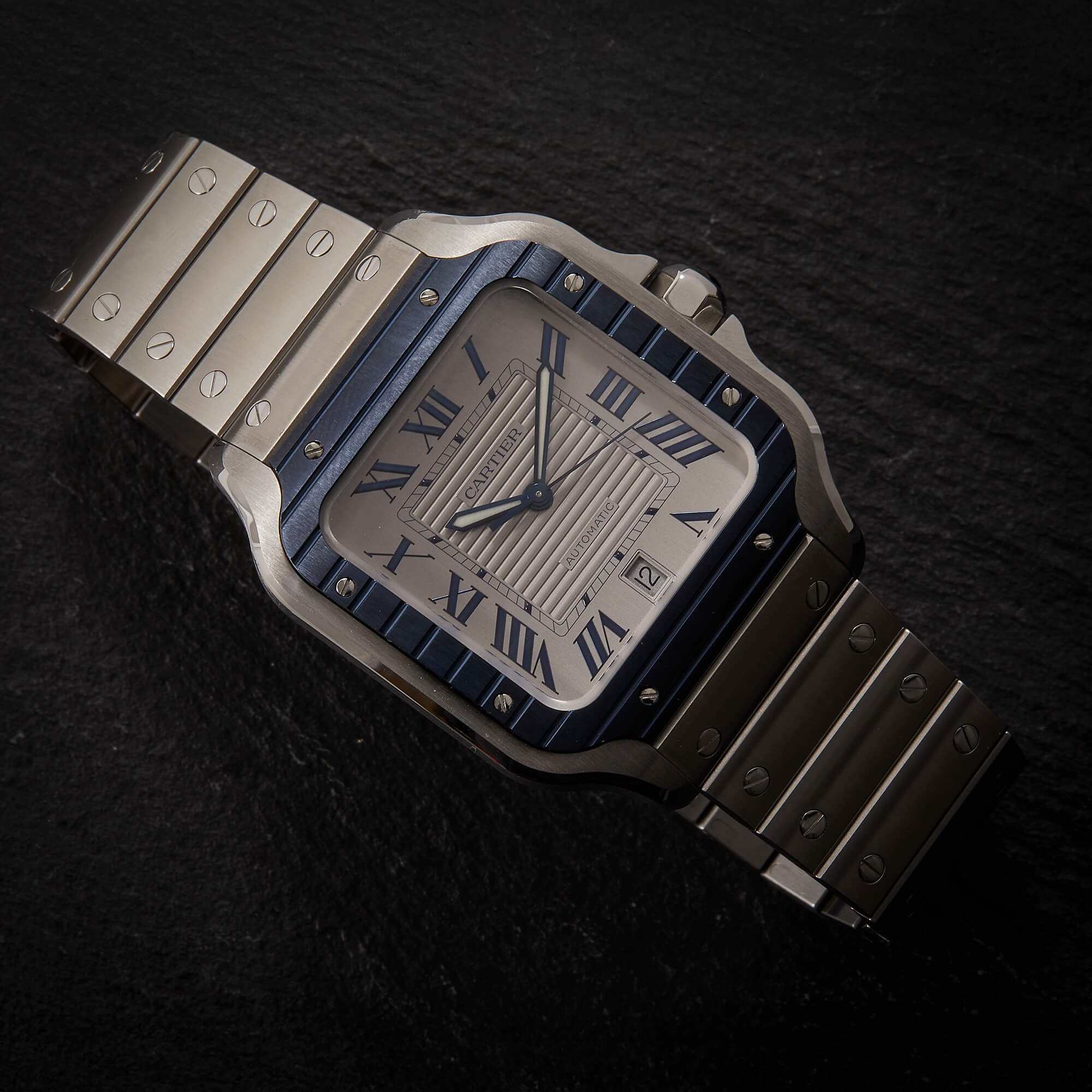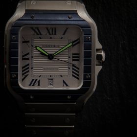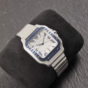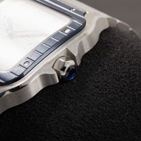 Cartier Santos, Referenz WSSA0047, im Fullset. Das Modell überzeugt durch die Kombination aus klassischem Santos-Design und moderner Sportlichkeit, unterstrichen von der markanten blauen Lünette, die der Uhr eine frische und elegante Note verleiht.