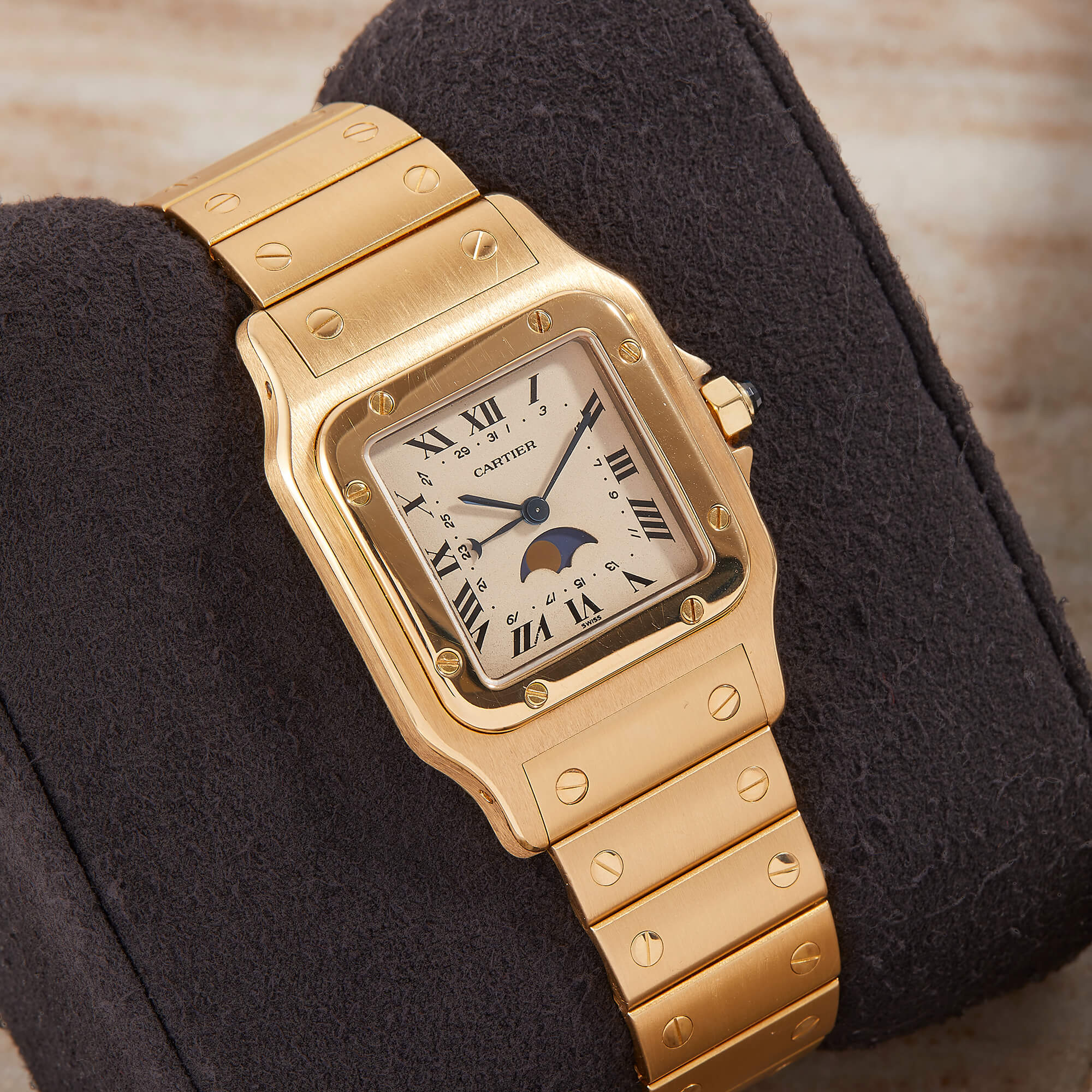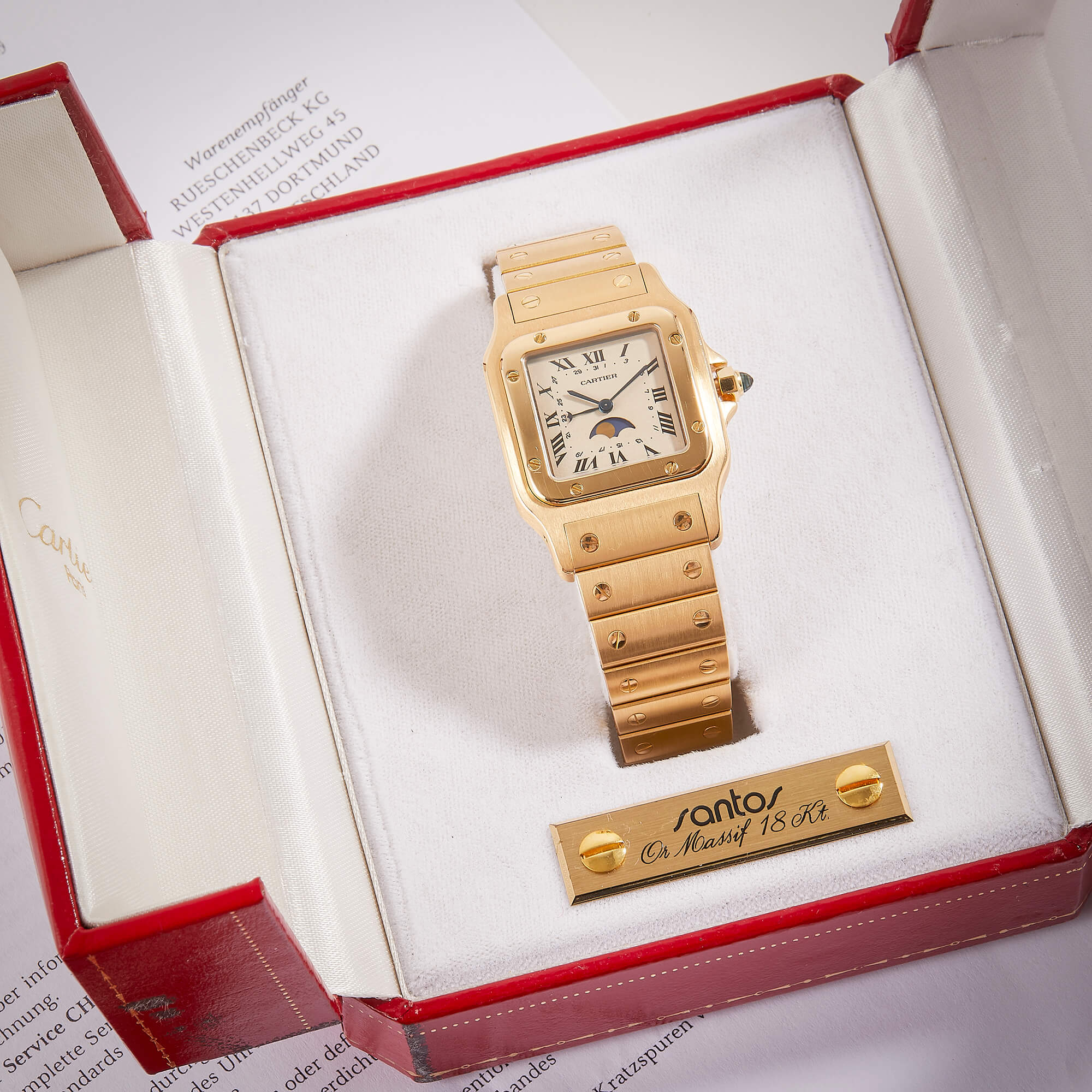 Seltene Cartier Santos Galbée Mondphase in Vollgold (Gelbgold) – ein eleganter Klassiker in wunderschönem Zustand. Die Unisexgröße macht die Uhr sowohl an Herren- als auch Damenhandgelenken zu einem stilvollen und klassischen Begleiter. Komplett mit seltener „Or Massif“-Box, Booklets und Cartier-Servicebeleg. Ein begehrtes Sammlerstück mit besonderer Ausstrahlung und charmantem Mondphasen-Komplikation.