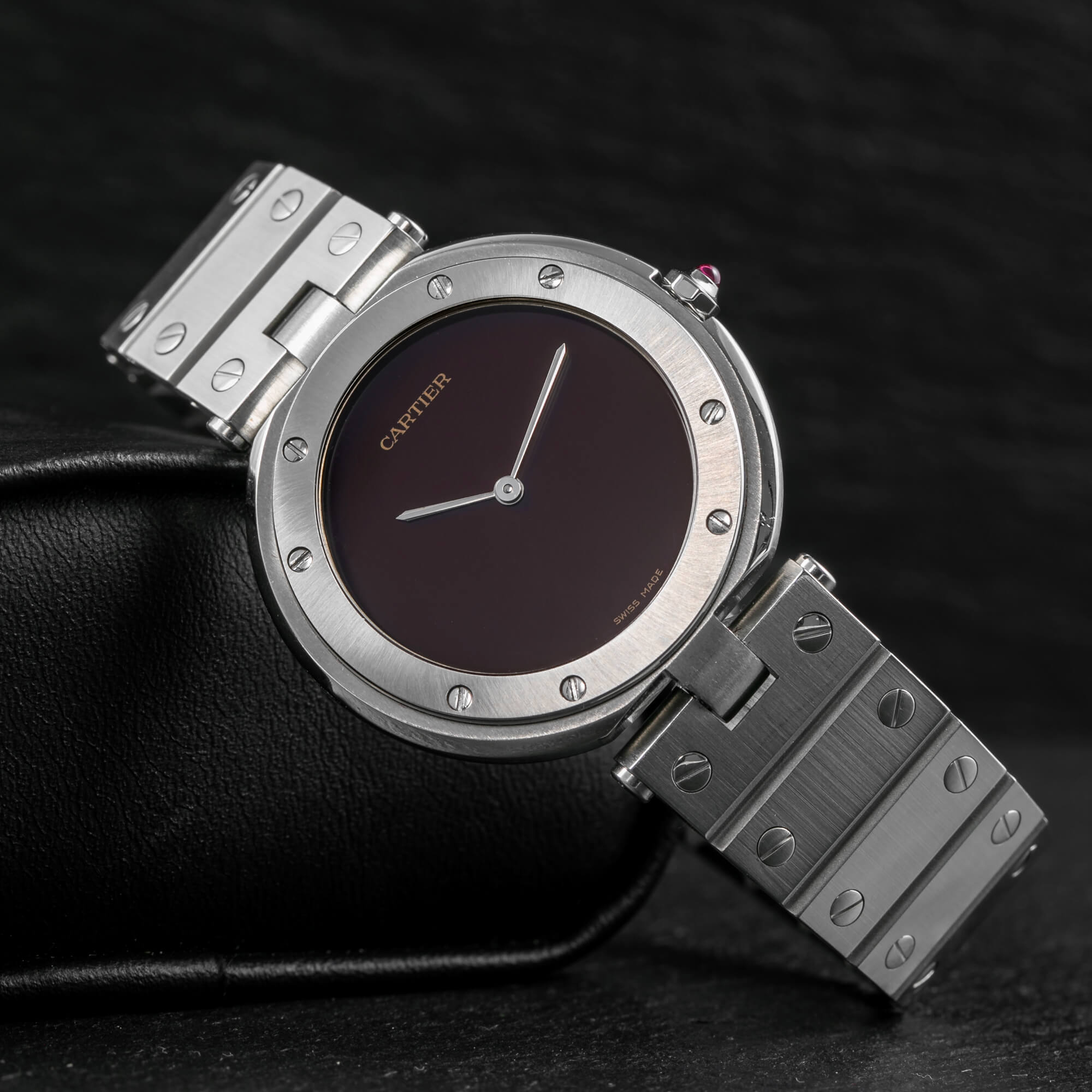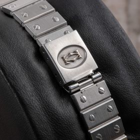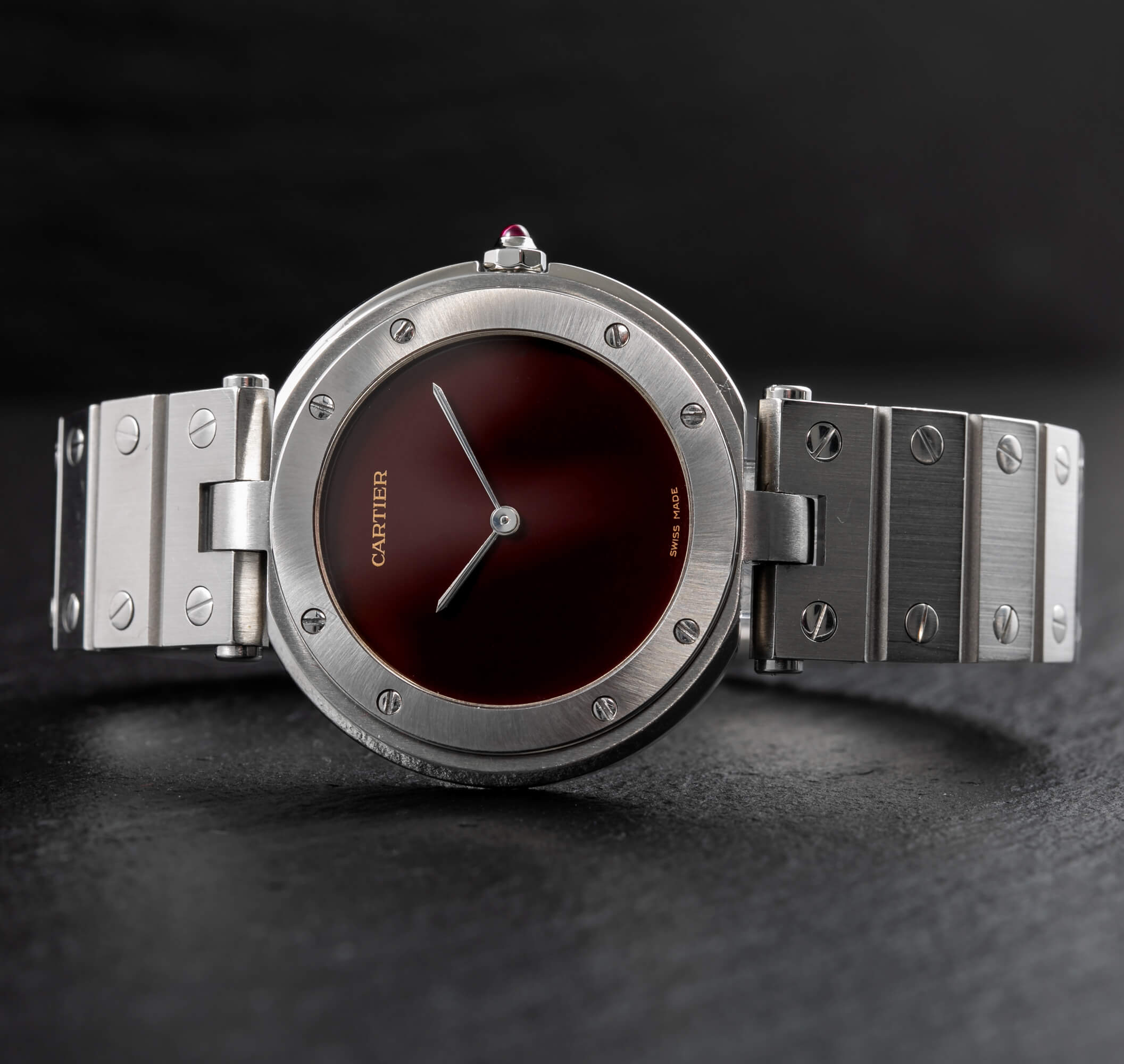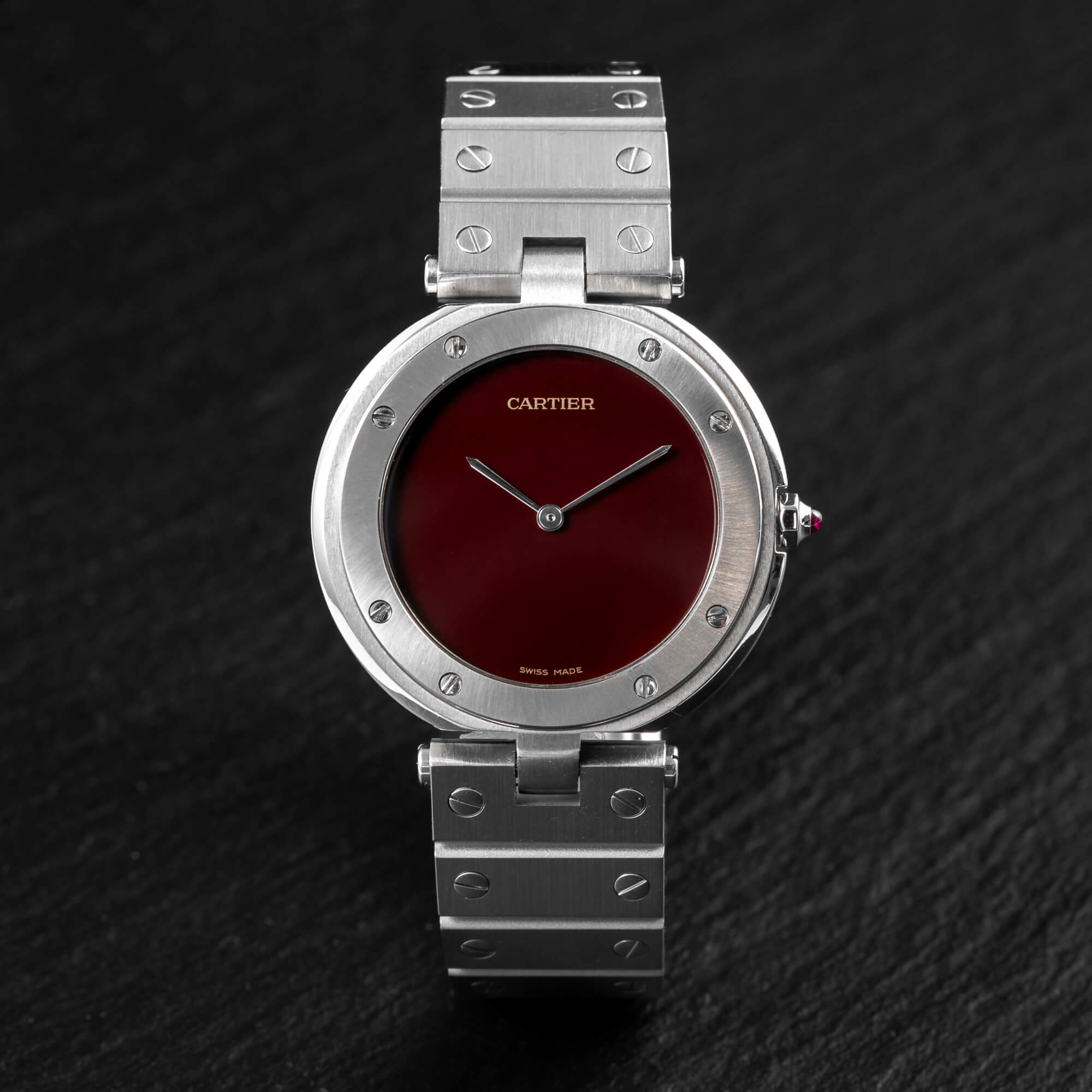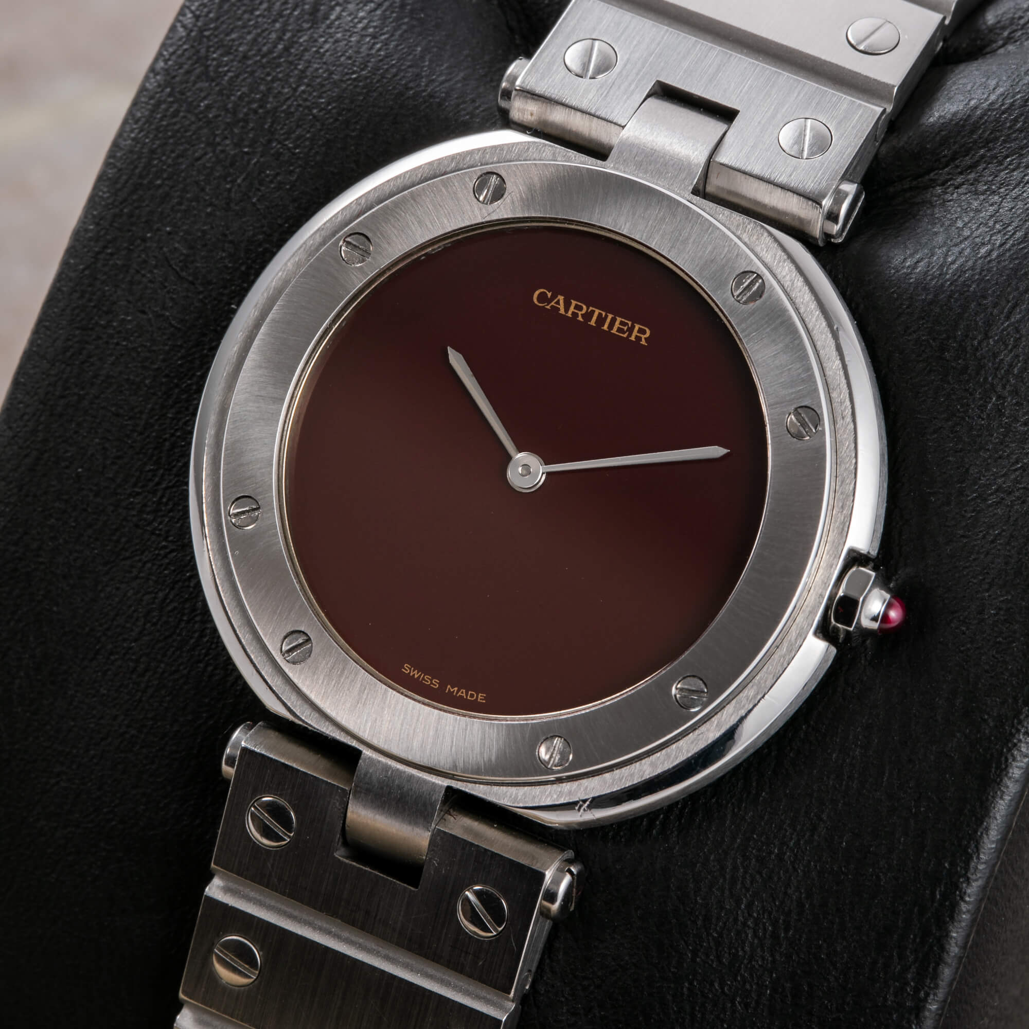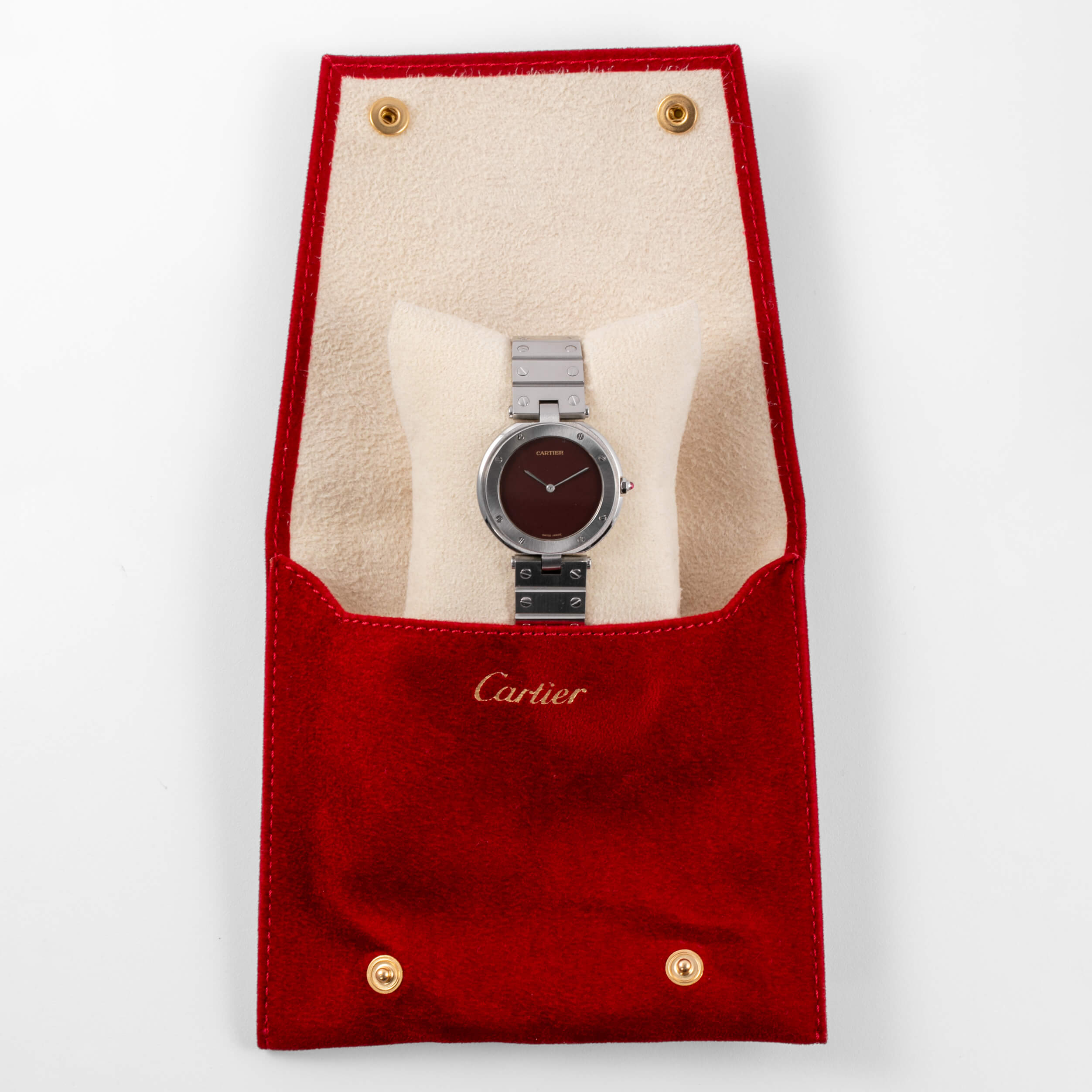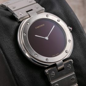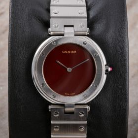 Cartier Santos Vendôme, Ref. 8192 – eine seltene Variante der ikonischen Santos, komplett aus Stahl gefertigt. Frisch bei Cartier revisioniert und mit einem eindrucksvollen burgunderroten Zifferblatt ausgestattet, vereint diese Uhr zeitlose Eleganz mit modernem Charakter.