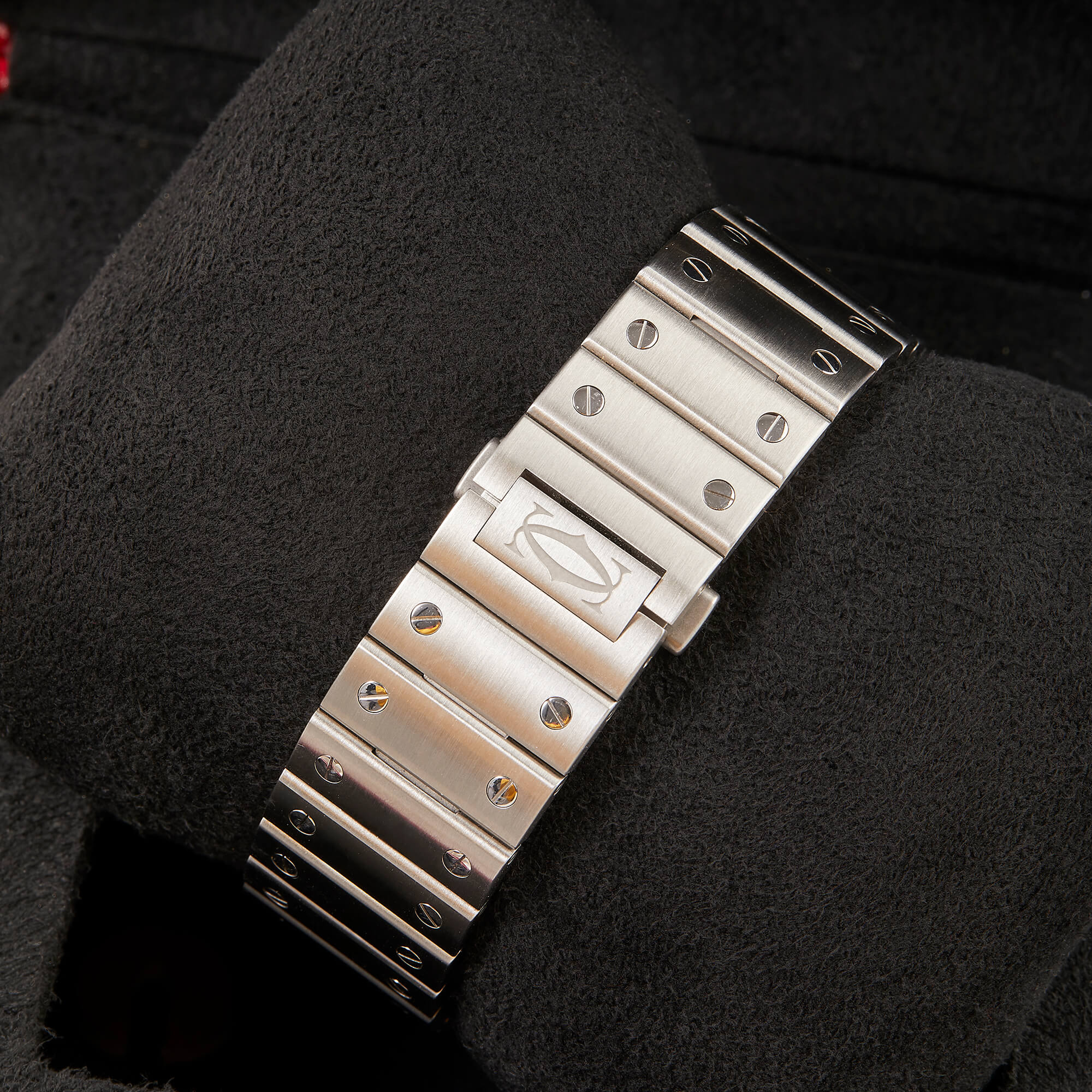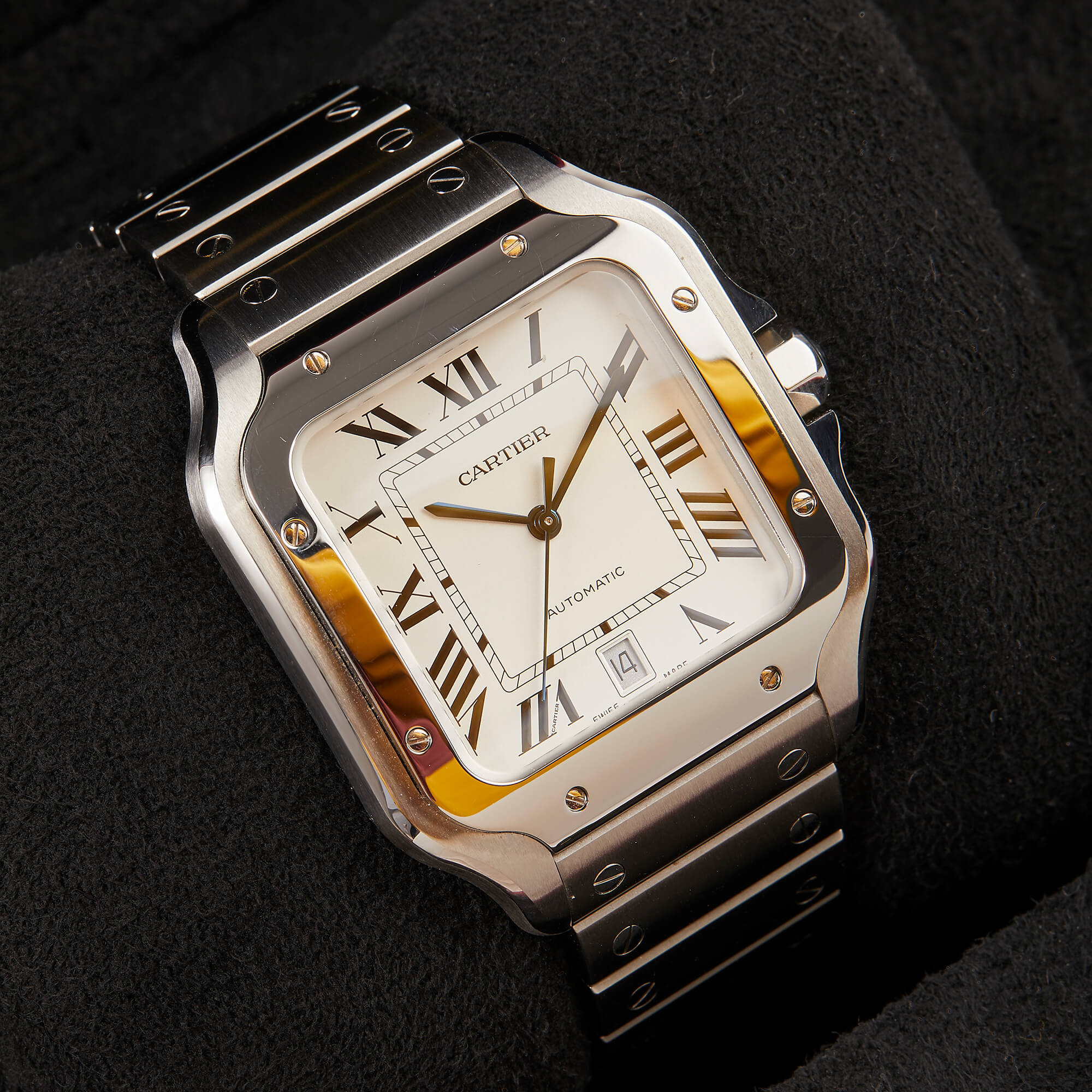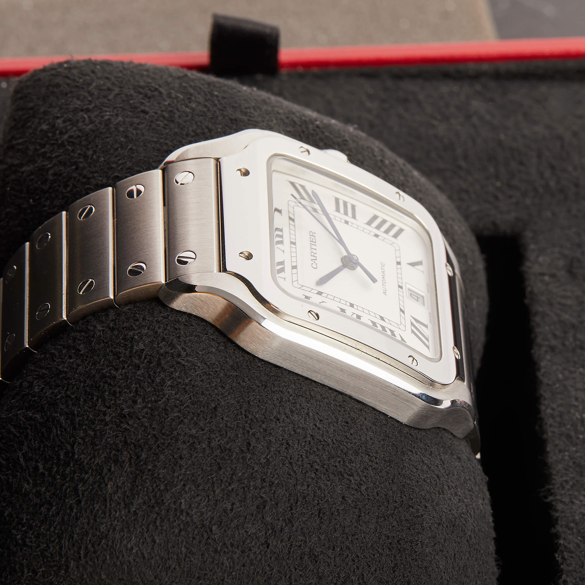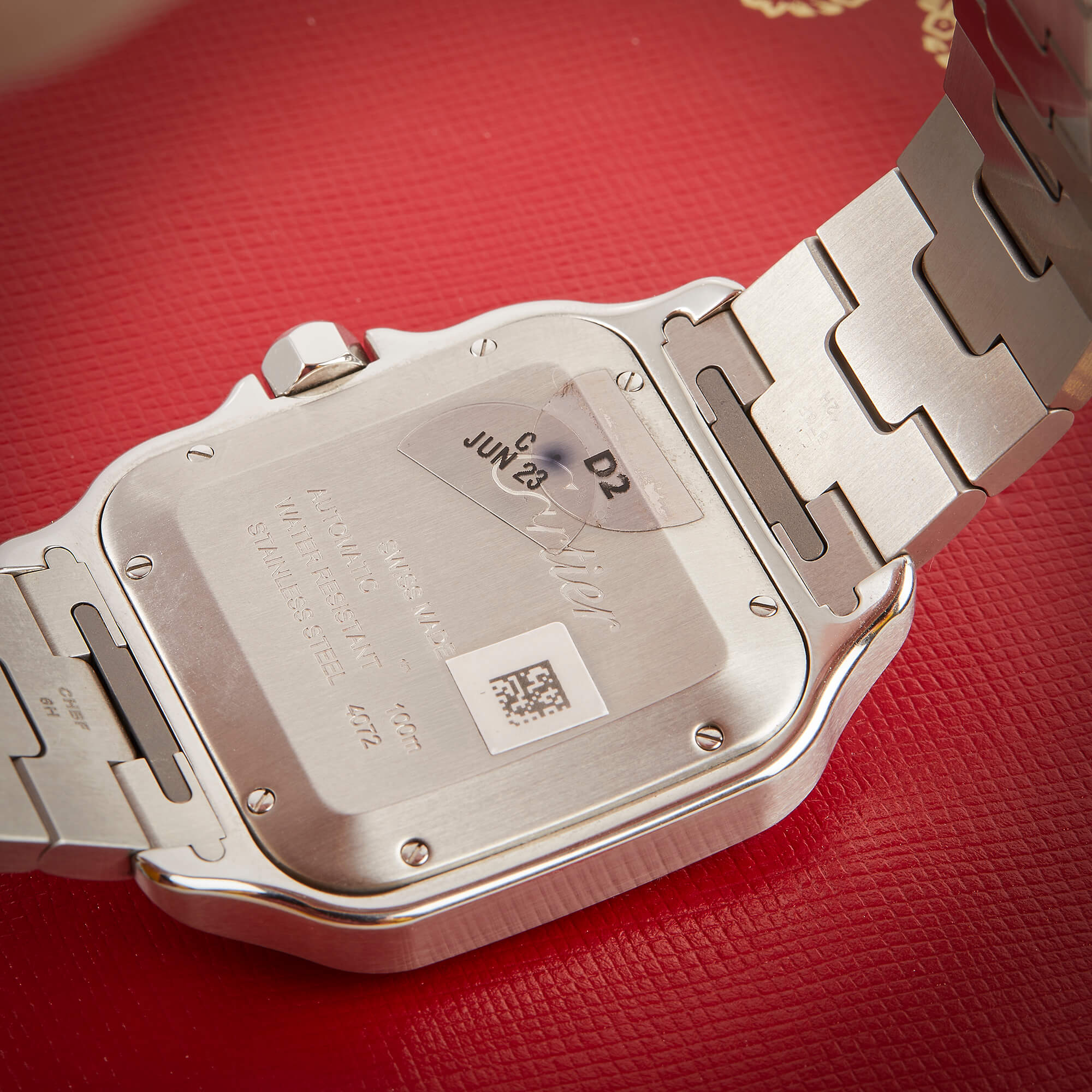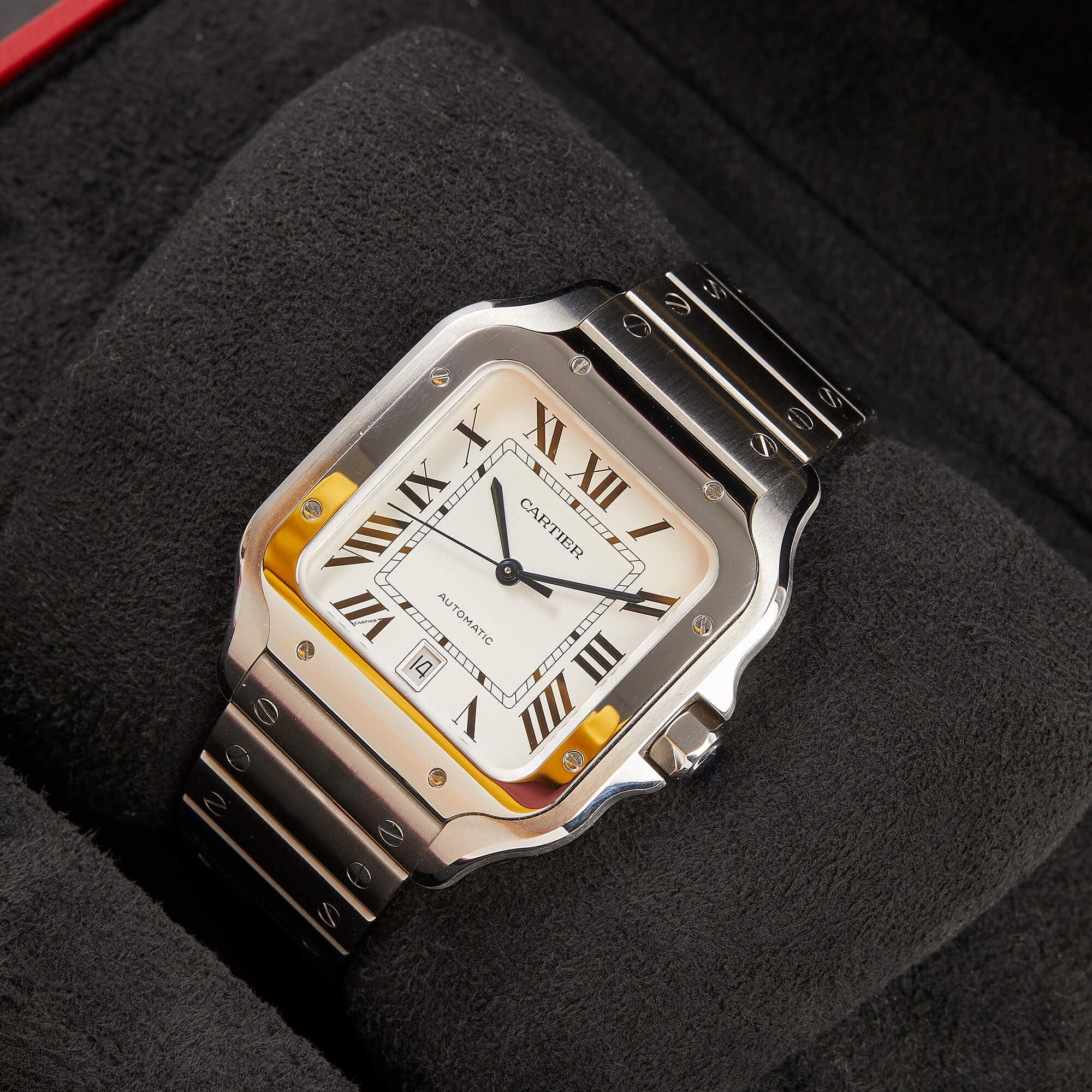 Cartier Santos, Ref. WSSA0018 – Zeitlose Eleganz in Edelstahl. Diese ikonische Uhr vereint klassisches Design mit moderner Technik. Das markante quadratische Gehäuse, das automatische Manufakturwerk und das raffinierte Zifferblatt machen sie zu einem stilvollen Begleiter. Dank des SmartLink-Systems lässt sich das Edelstahlarmband mühelos anpassen. Die Uhr kommt im Fullset mit Originalbox, Garantiekarte und allen Unterlagen.- Durchmesser